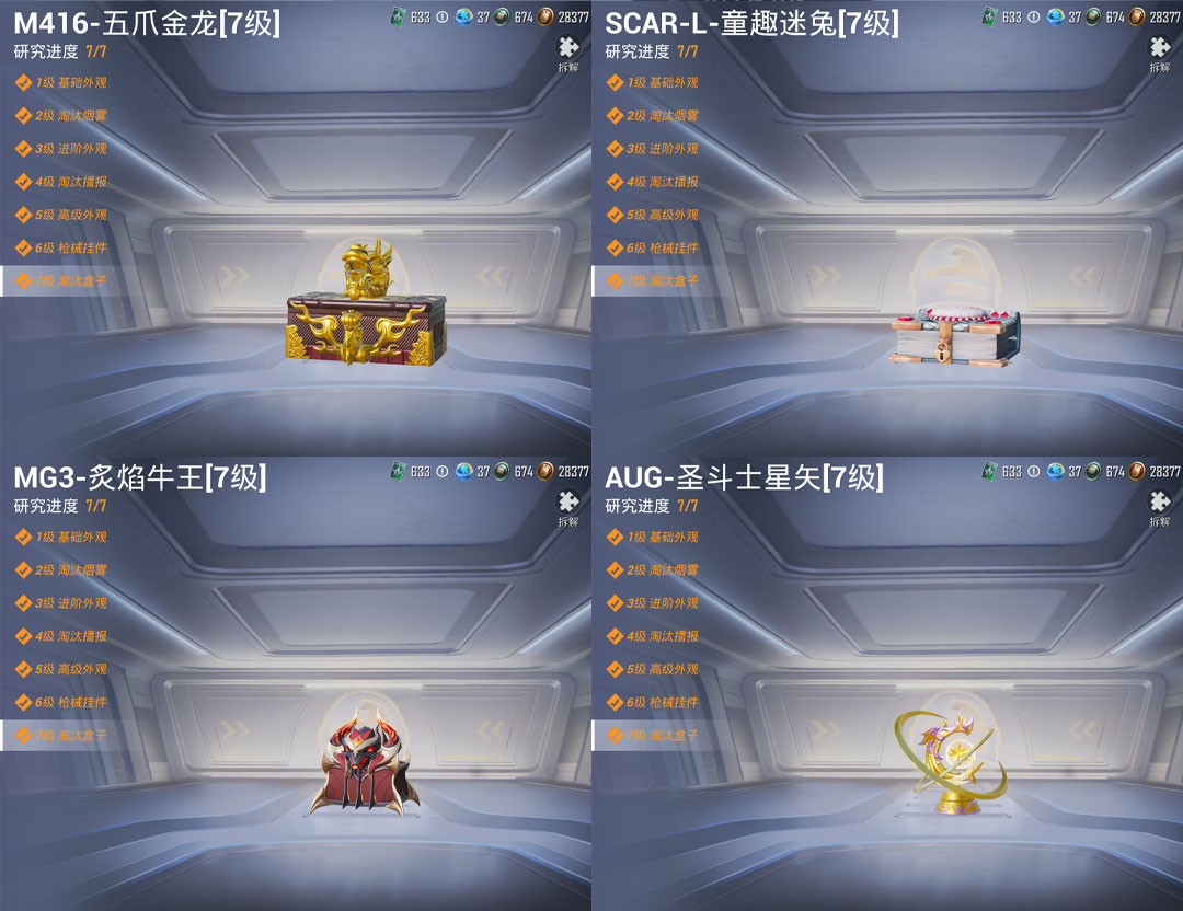 特效枪7:SCAR-L-童趣迷兔/7级,,M417-第五大道/4级,,M416-五爪金龙/7级,,AUG-圣斗士星矢/7级,,MG3-炙焰牛王/7级,,Kar98K-巳巳如意/5级,DP-28-豹影疾电/5级,,