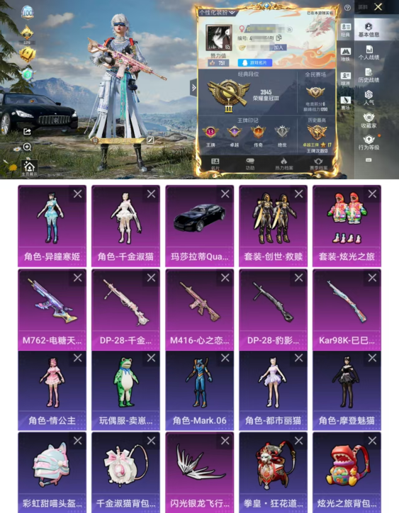 DYH17651+ 【4粉5特1车 心之恋语 蓝螳螂】安卓Q-1载具4粉装5特效枪5热门122套装183枪皮 54773热力值 13印记 历史卓越王牌17星【1载具】 玛莎拉蒂Q蓝色【4粉装】 千金淑猫 异瞳寒姬 炫光之旅 创世救赎【5特效枪】 M416-心之恋语 (6级) Kar98K-巳巳如意 (5级) M762-电糖天使 (7级) DP-28-千金淑猫 (6级) DP-28-豹影疾电 (