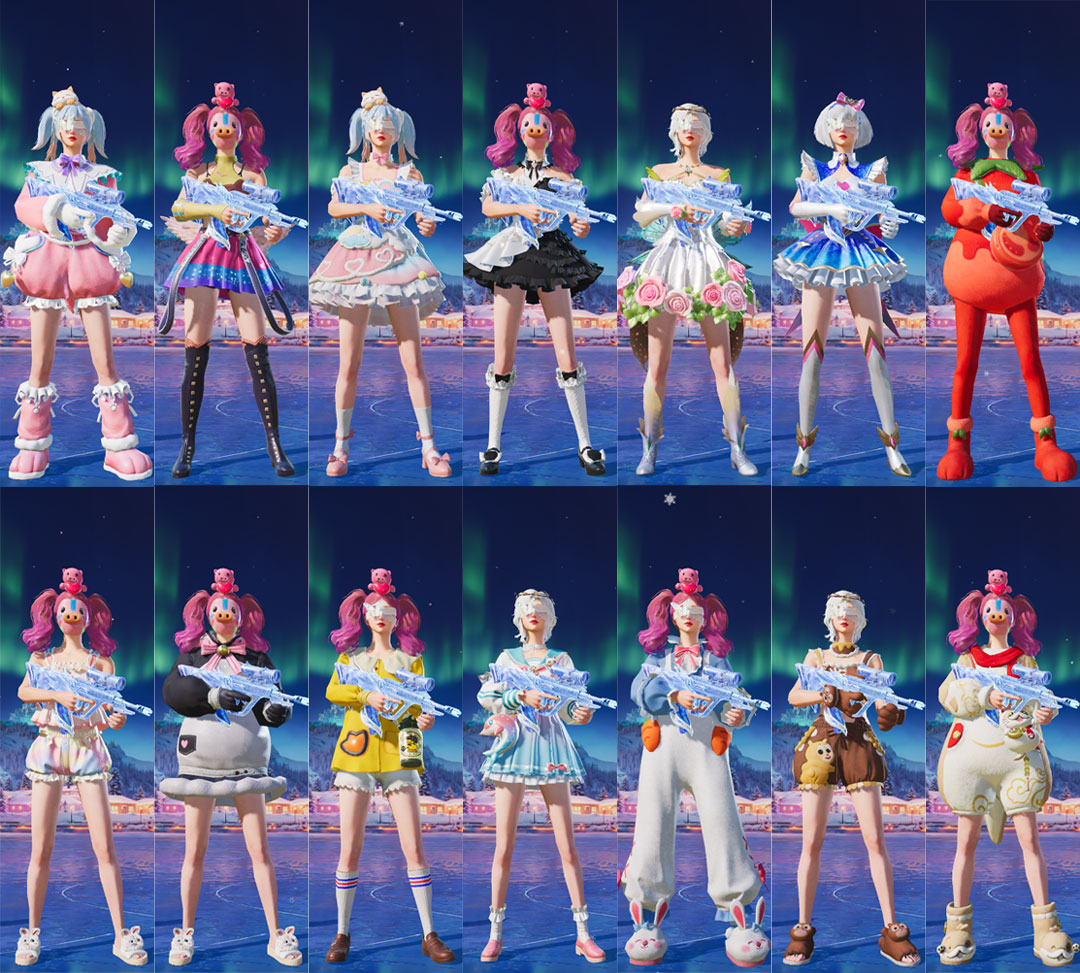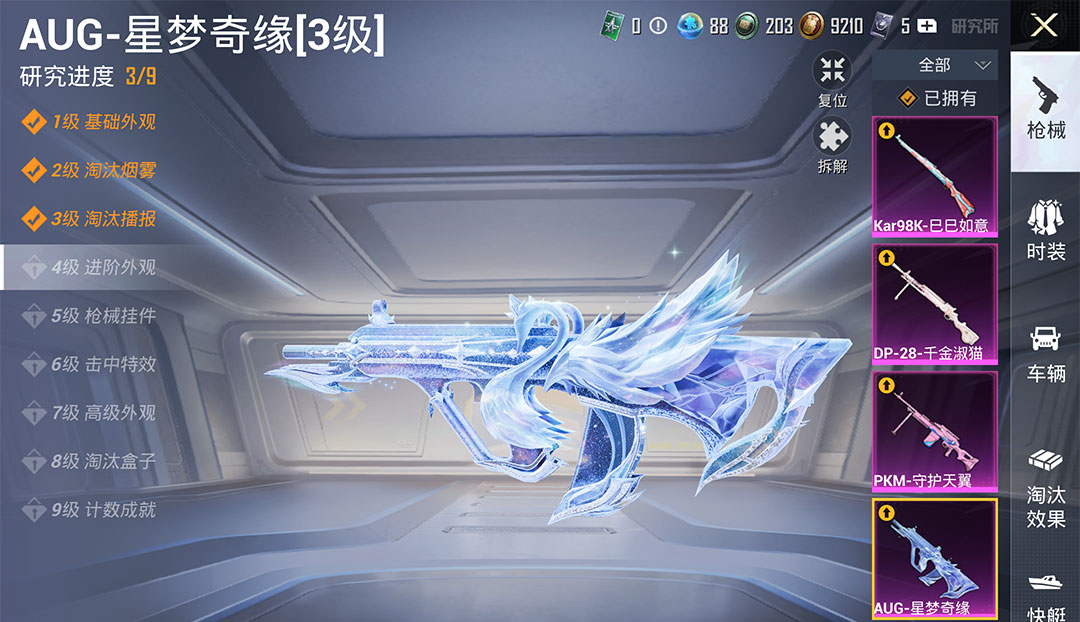 特效枪5:AUG-星梦奇缘/3级,DP-28-千金淑猫/4级,,PKM-守护天翼/4级,,Kar98K-巳巳如意/5级,,M416-电玩时刻/5级,,