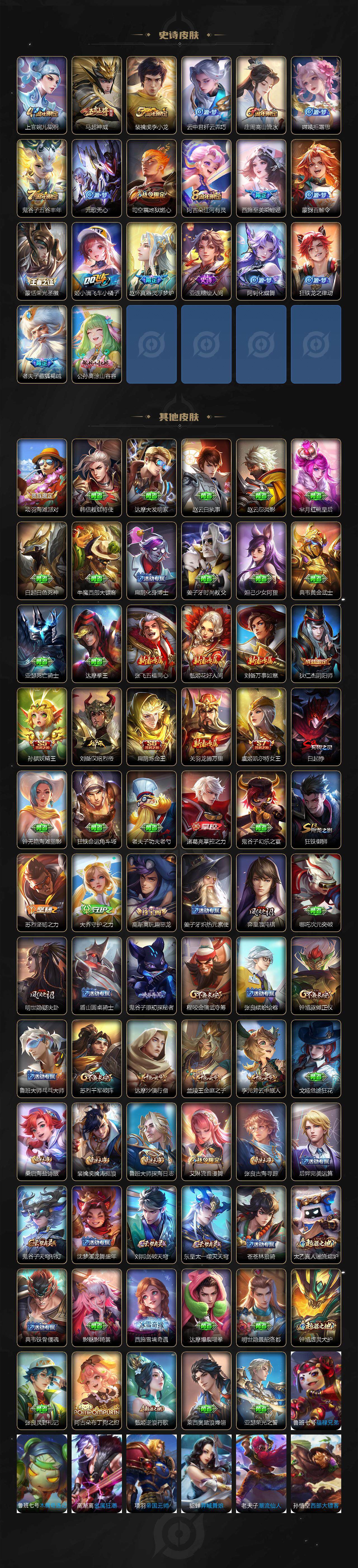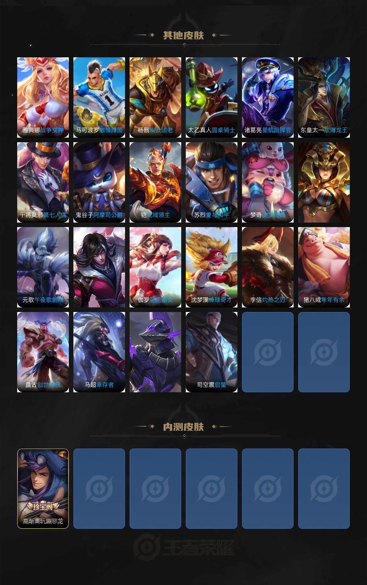 【限定皮肤】:白起狰,狄仁杰阴阳师,虞姬凯尔特女王,赵云皇家上将,庄周高山流水,高渐离玩趣恶龙,孙膑妖精王,扁鹊炼金王,元歌无心,狄仁杰魔术师,达摩沙漠行僧,项