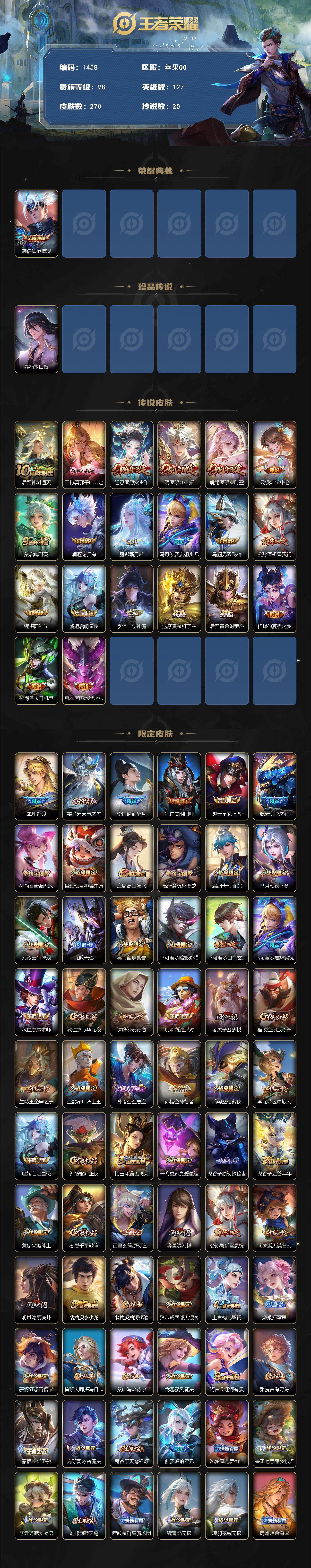 【270皮1典藏1珍品20传说1天幕 墨上江山天幕 木白哉 千山共赴 霜月吟 祈雪灵祝 至尊宝 岁时盈 九州拓 妄想实况】苹果Q-V8-最强王者段位-127英雄-270皮肤-1典藏皮肤-1珍品传说-20传说-94史诗