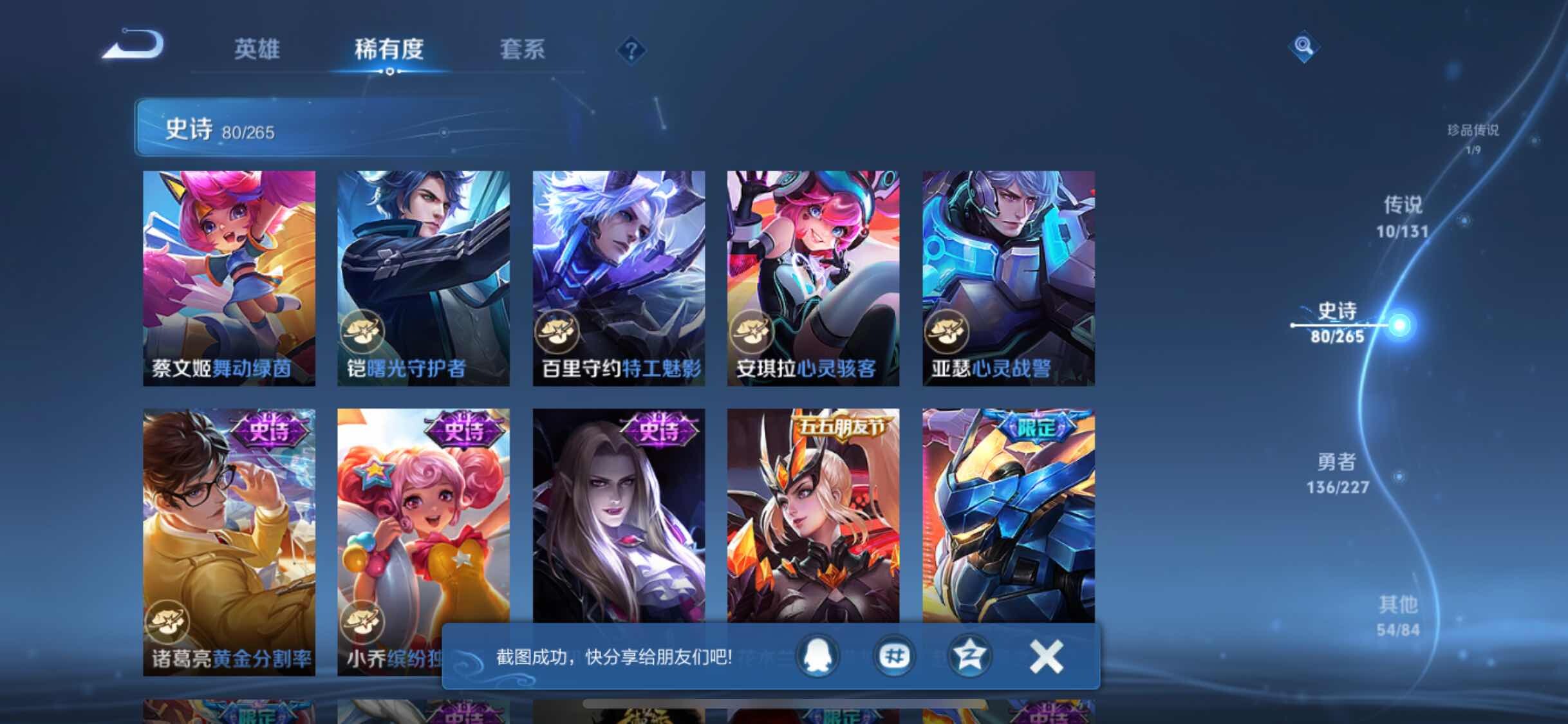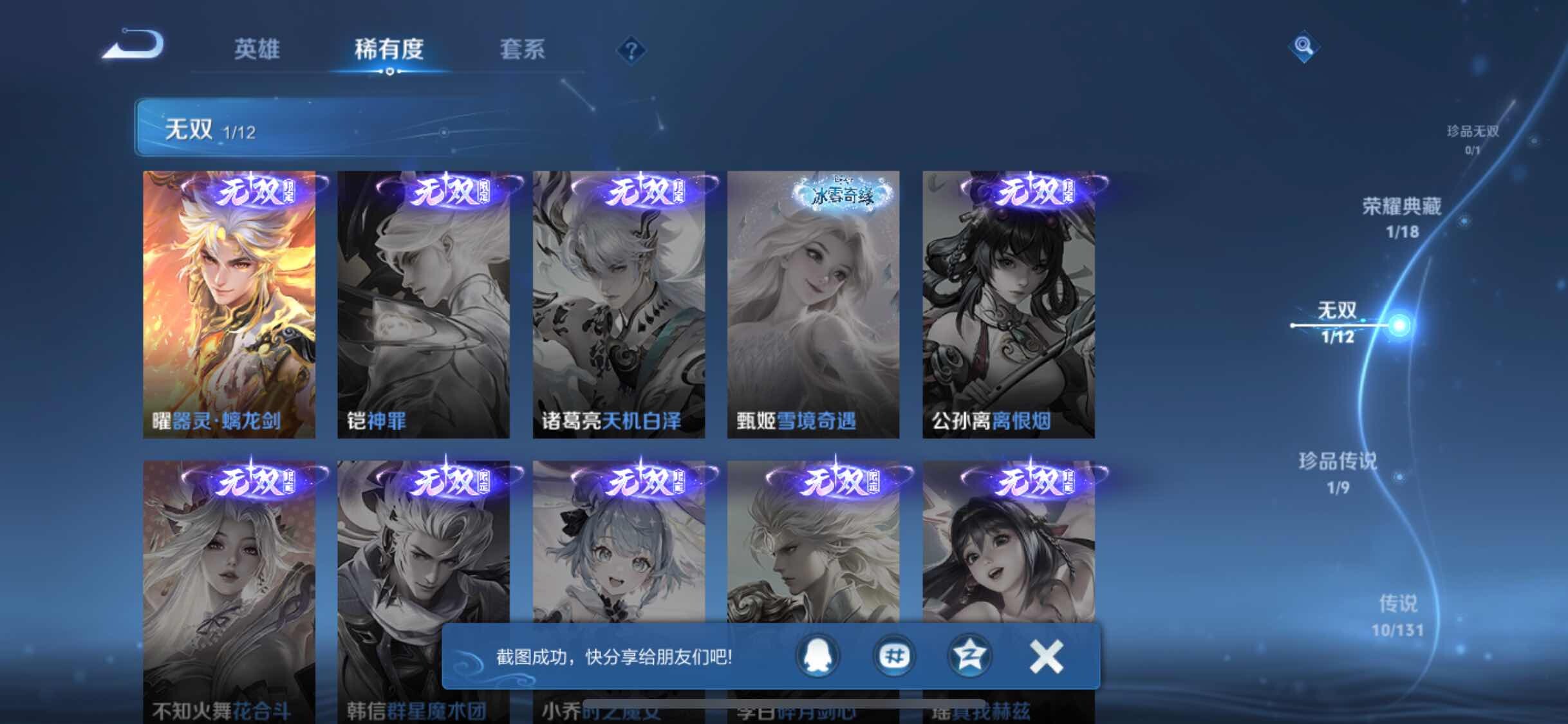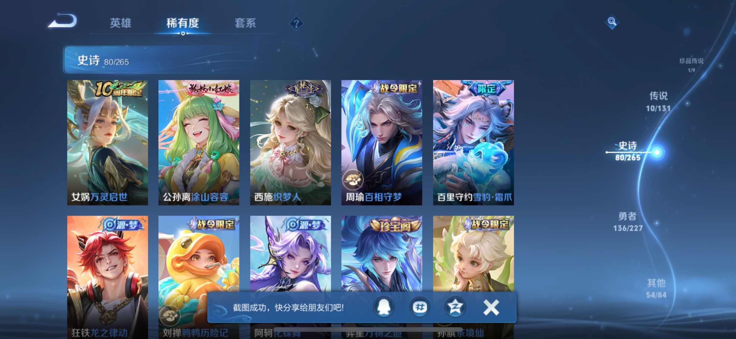 皮肤283 英雄126 荣耀王者 荣耀典藏1 无双皮肤1 珍品传说1 传说10 其他皮肤108-【283皮1典藏1无双10传说 弑枪猎影 器灵螭龙剑 怪盗基德 九山相柳 愿照