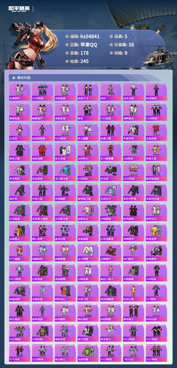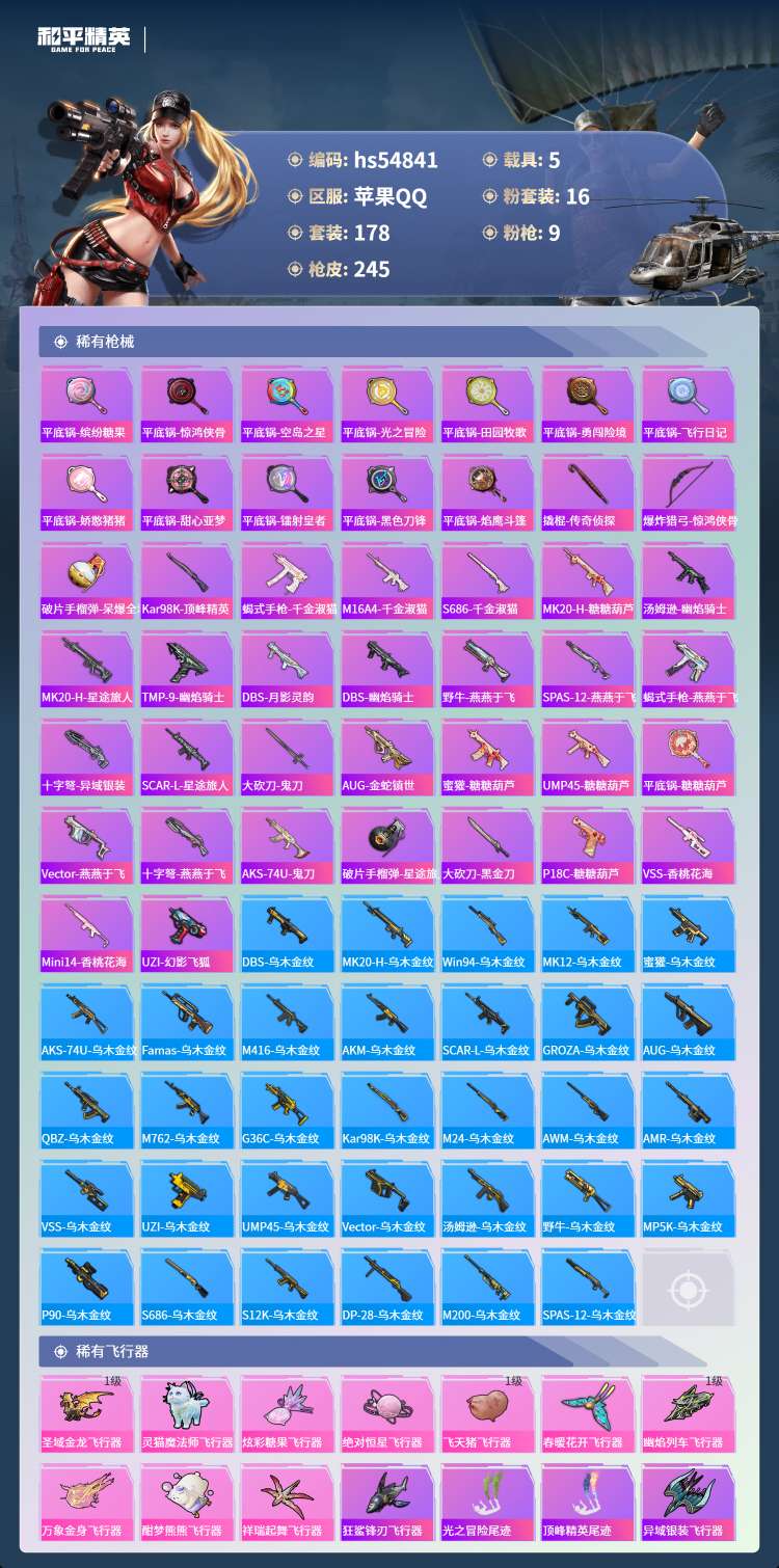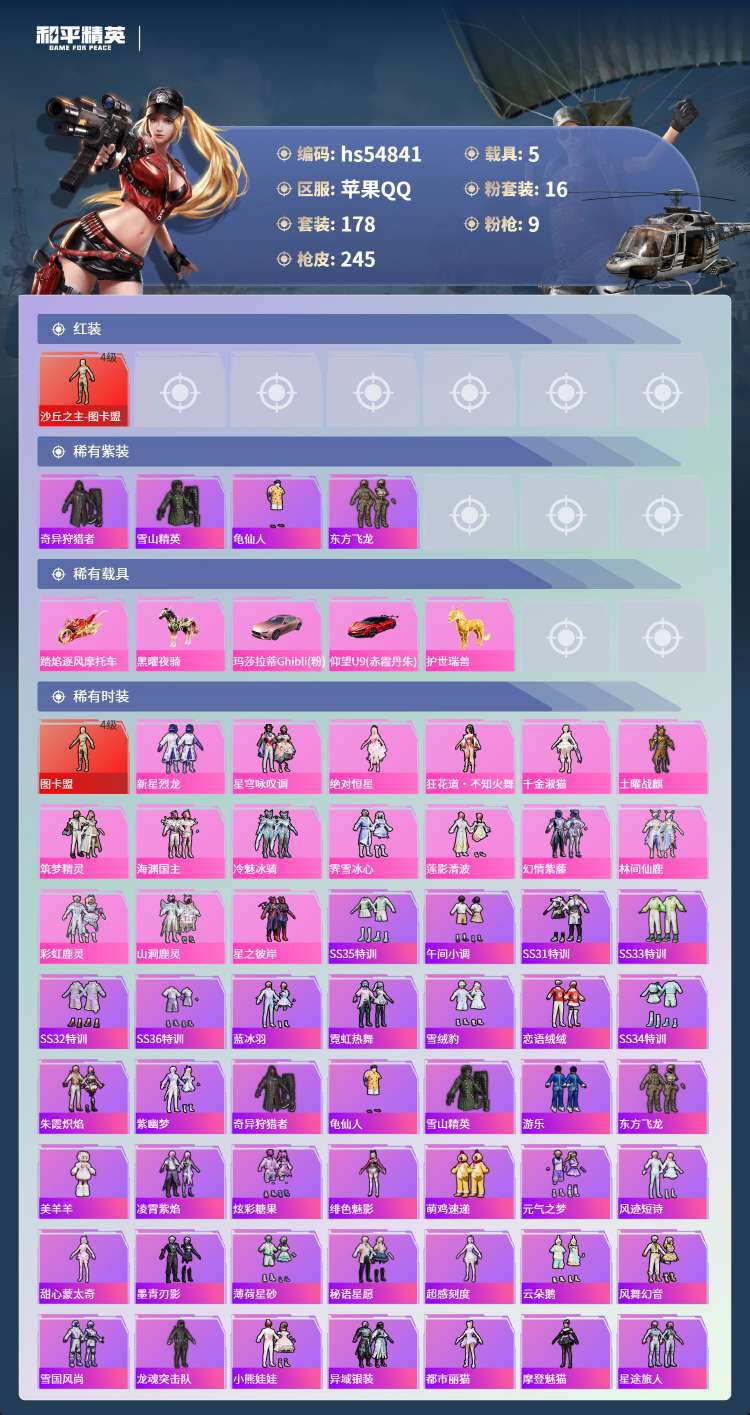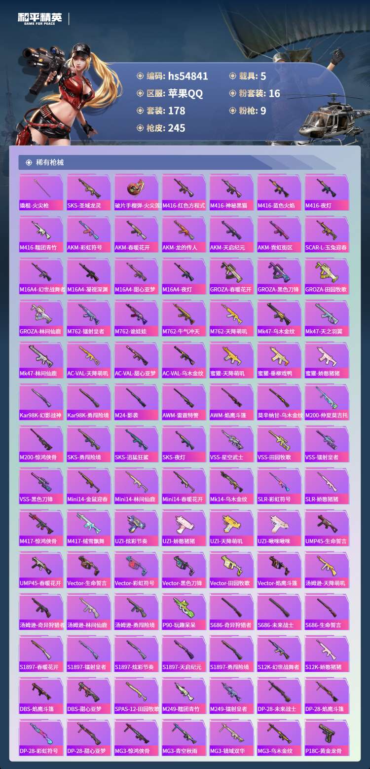hs54841 苹果手Q-13王牌印记-2红装-16粉装-9特效枪-5载具-91002热力值-178