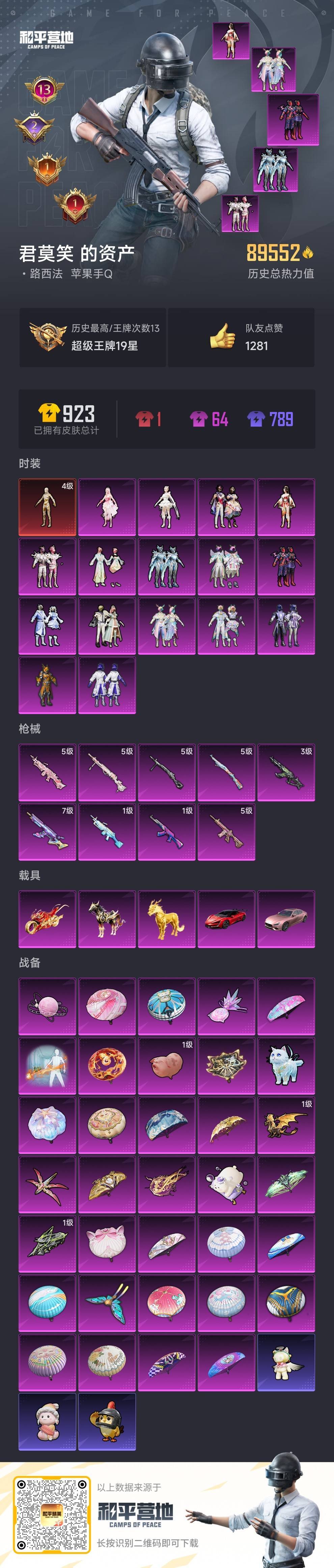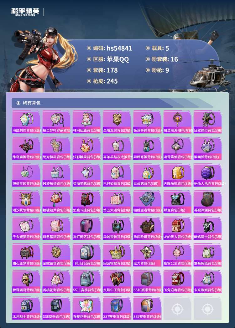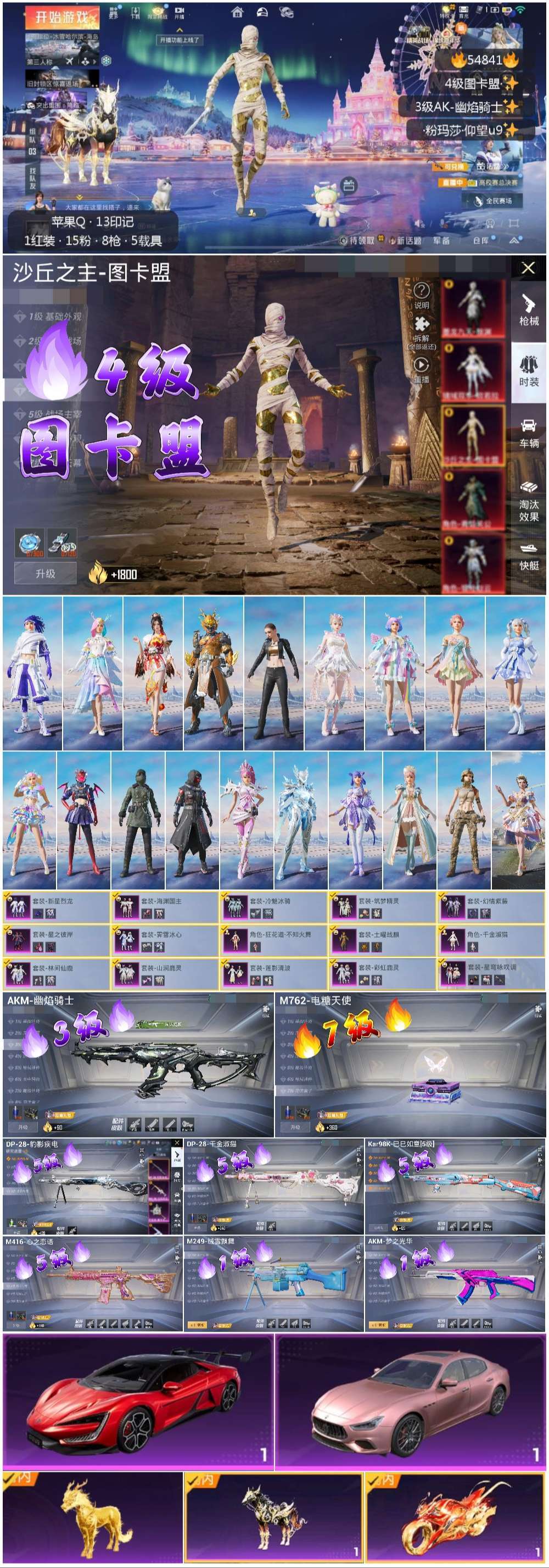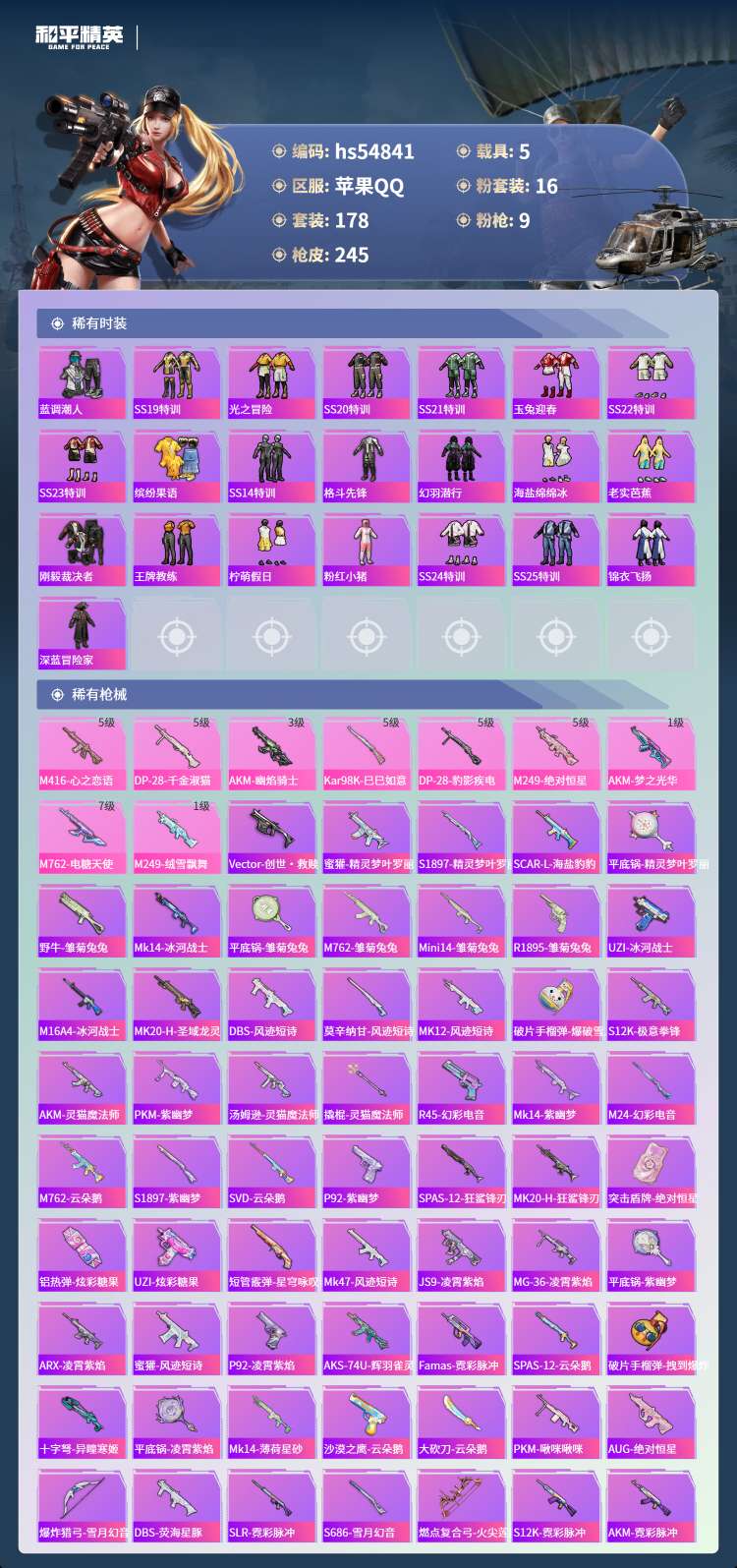 hs54841 苹果手Q-13王牌印记-2红装-16粉装-9特效枪-5载具-91002热力值-178