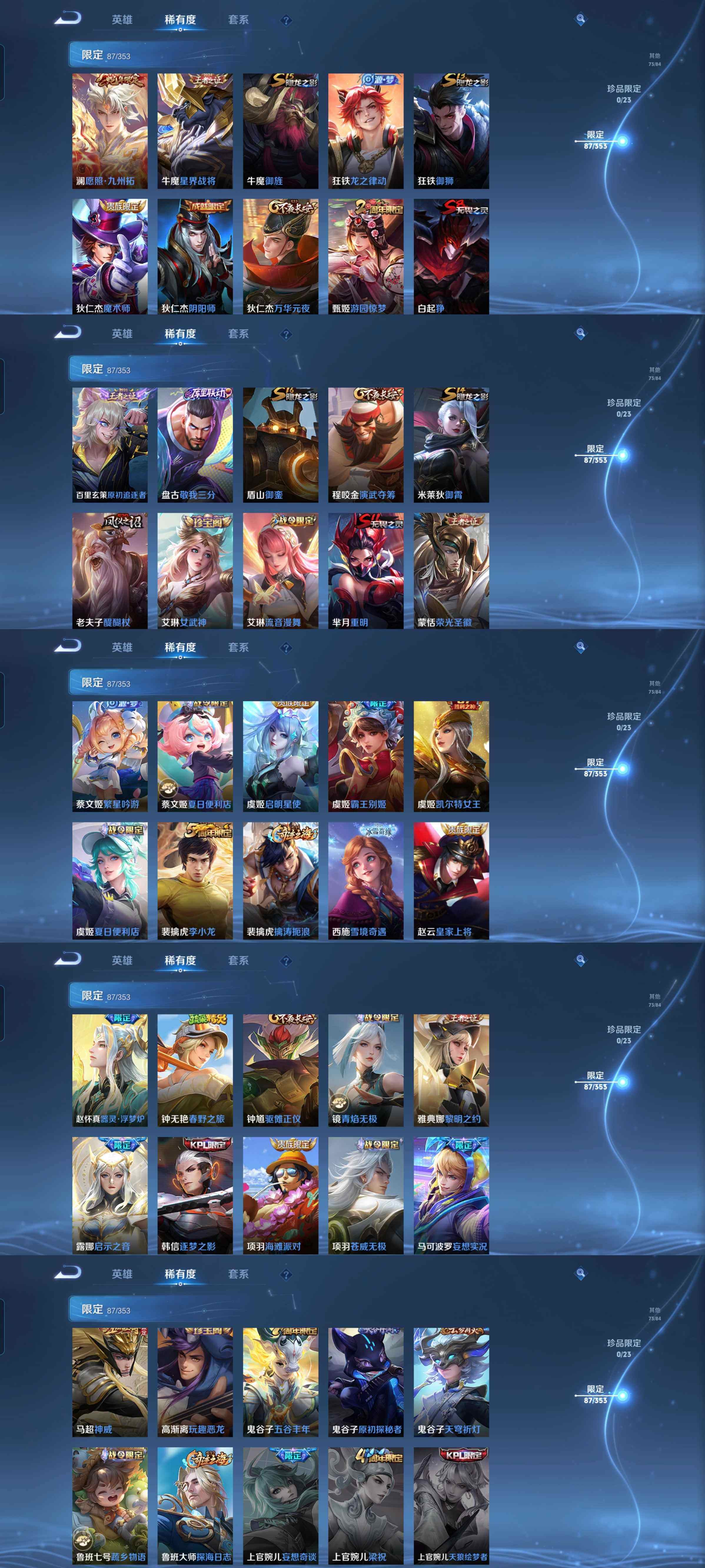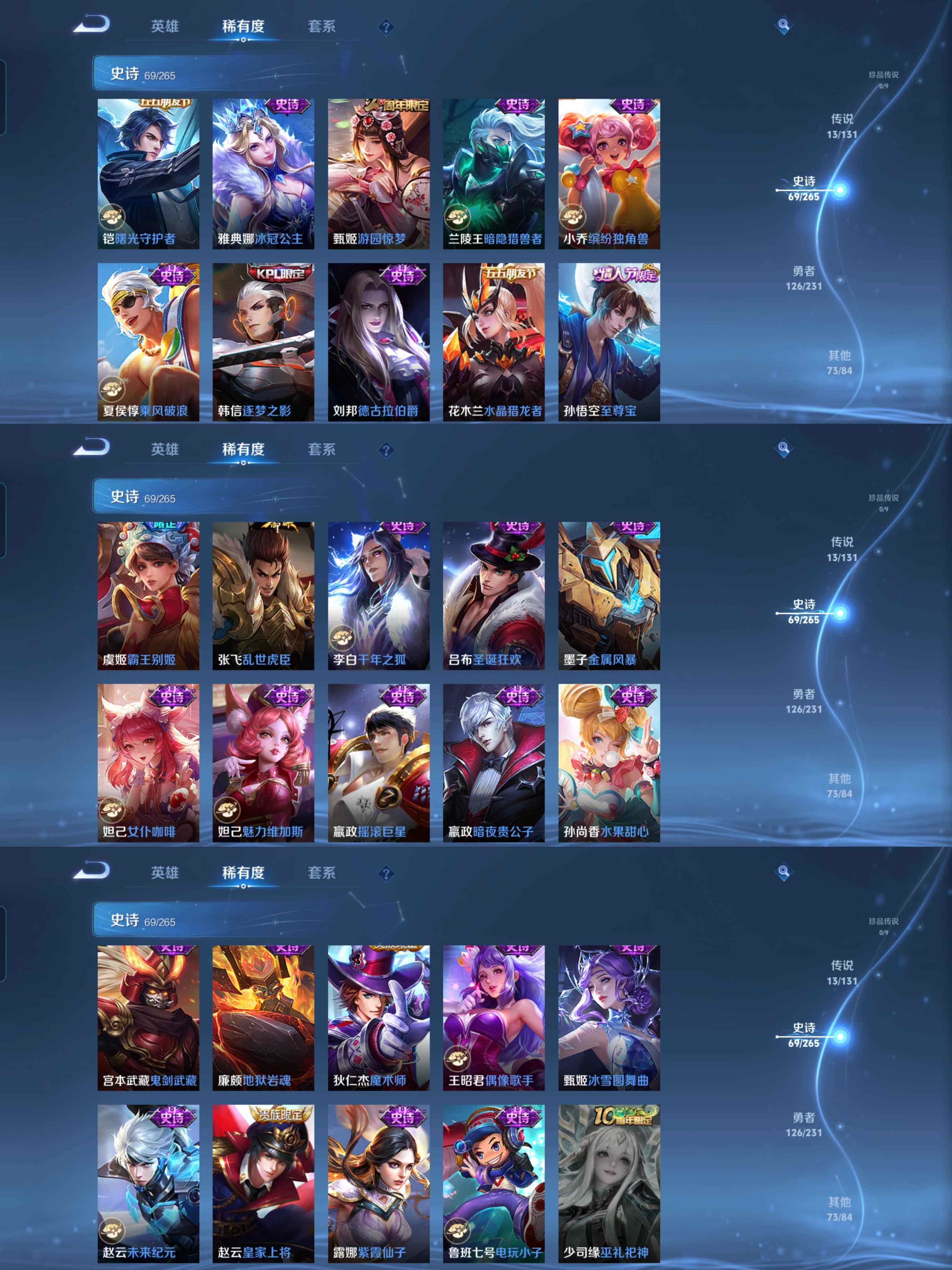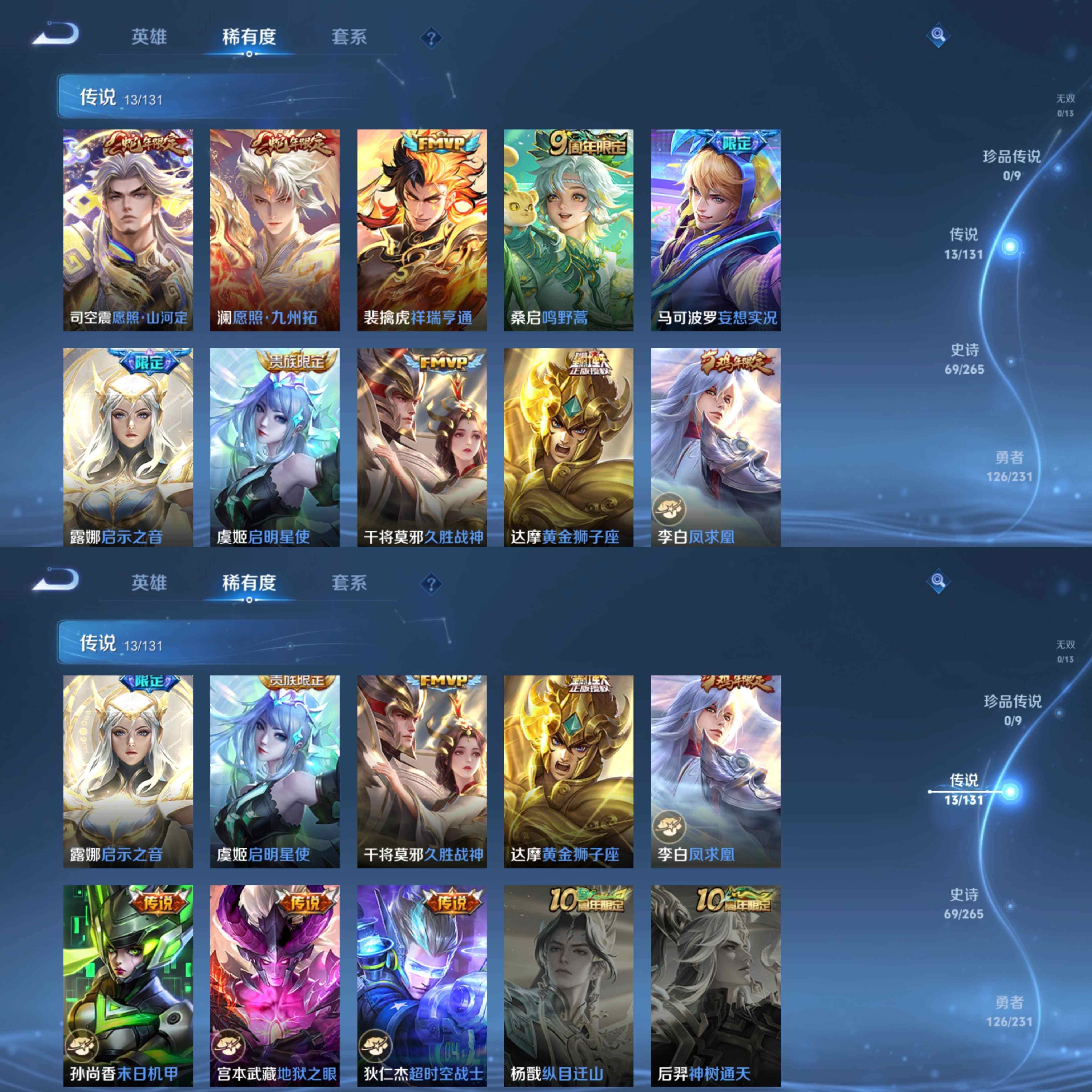 皮肤282 英雄126 秩序白银 荣耀典藏1 传说13 其他皮肤108-y19,印记18,积分225,1典藏全息碎影,13传说1星传说,至尊宝启示之音