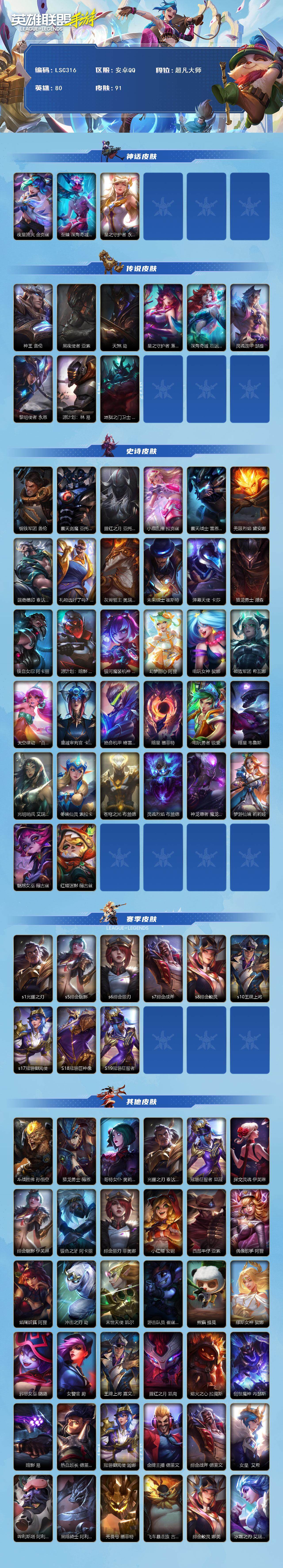 【LSC316】80英雄/91皮肤/超凡大师/夜星流火 金克丝/至臻 深海奇域 莫甘娜/星之守护者 永绽盛芒 阿狸/神王 盖伦/黑夜使者 亚索/天煞 劫/星之守护者 落 霞/深海奇域 厄运小姐/灵魂莲华 瑟提/黎明使者 永恩/源计划:林 易/地狱之门卫士 加里奥/钢铁军团 盖伦/霸天剑魔 亚托克斯/腥红之月 亚托克斯/小鹿乱撞 拉克丝/霸天战士 雷恩加尔/无限烈焰 黛安娜/端劲墨印 泰达米尔/礼物选好了吗? 布隆/灰烬领主 奥瑞利安·索尔/未来战士 崔斯特/弹幕天使 卡莎/猎龙勇士 潘森/铁血女