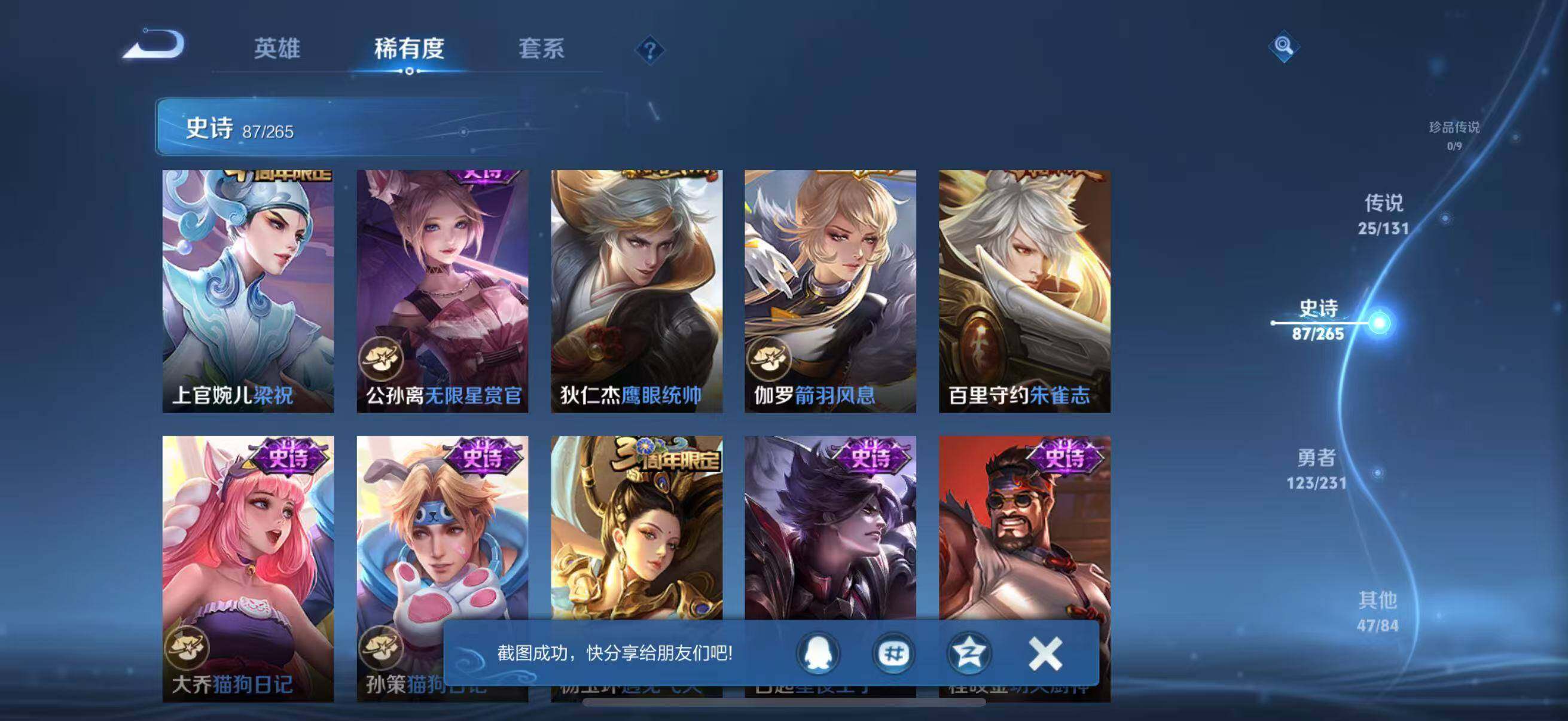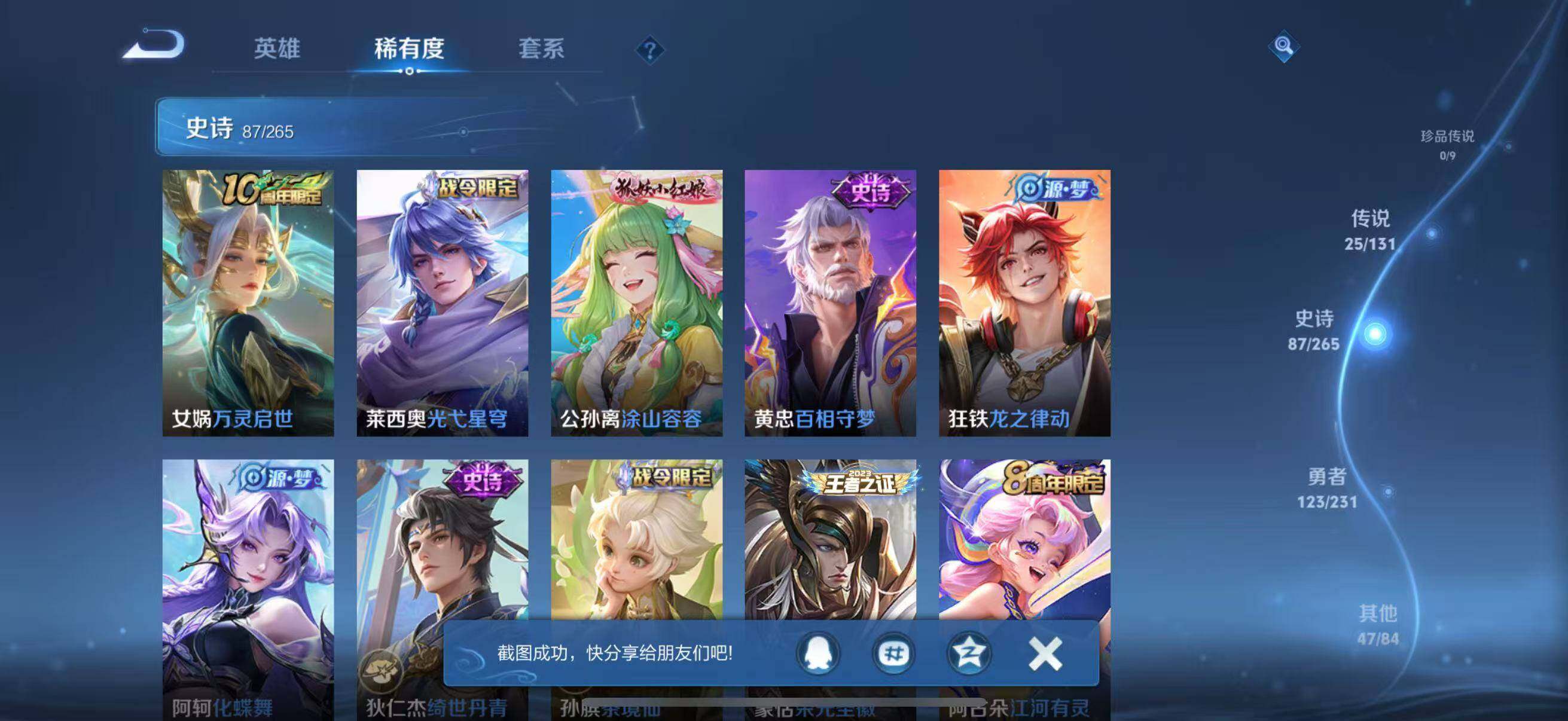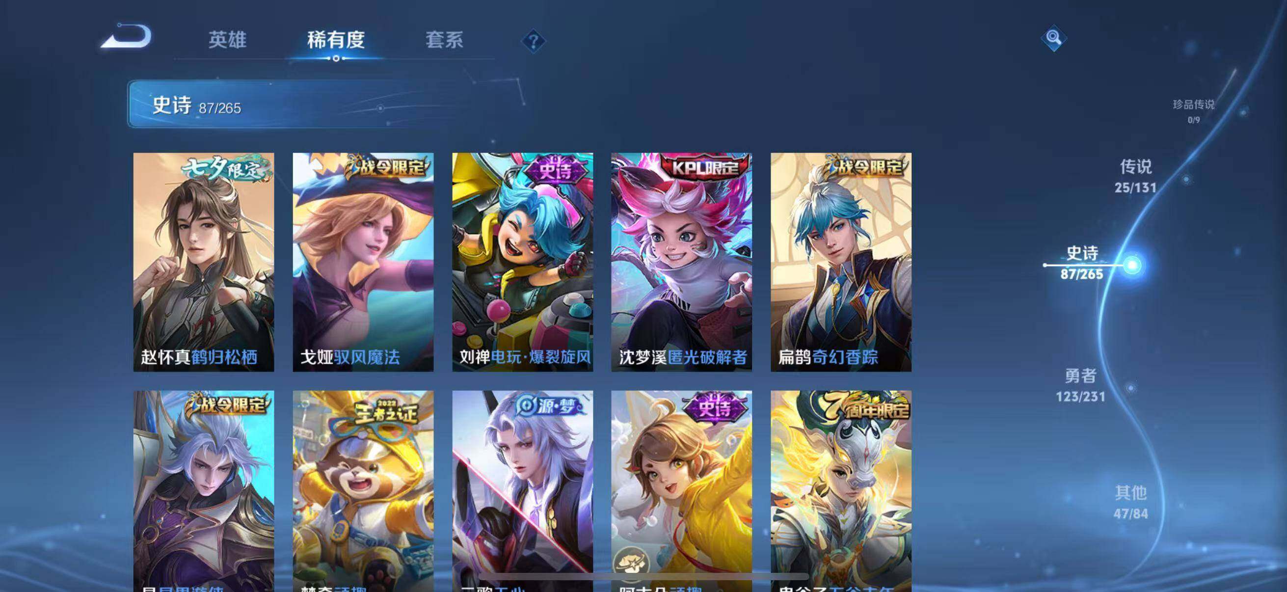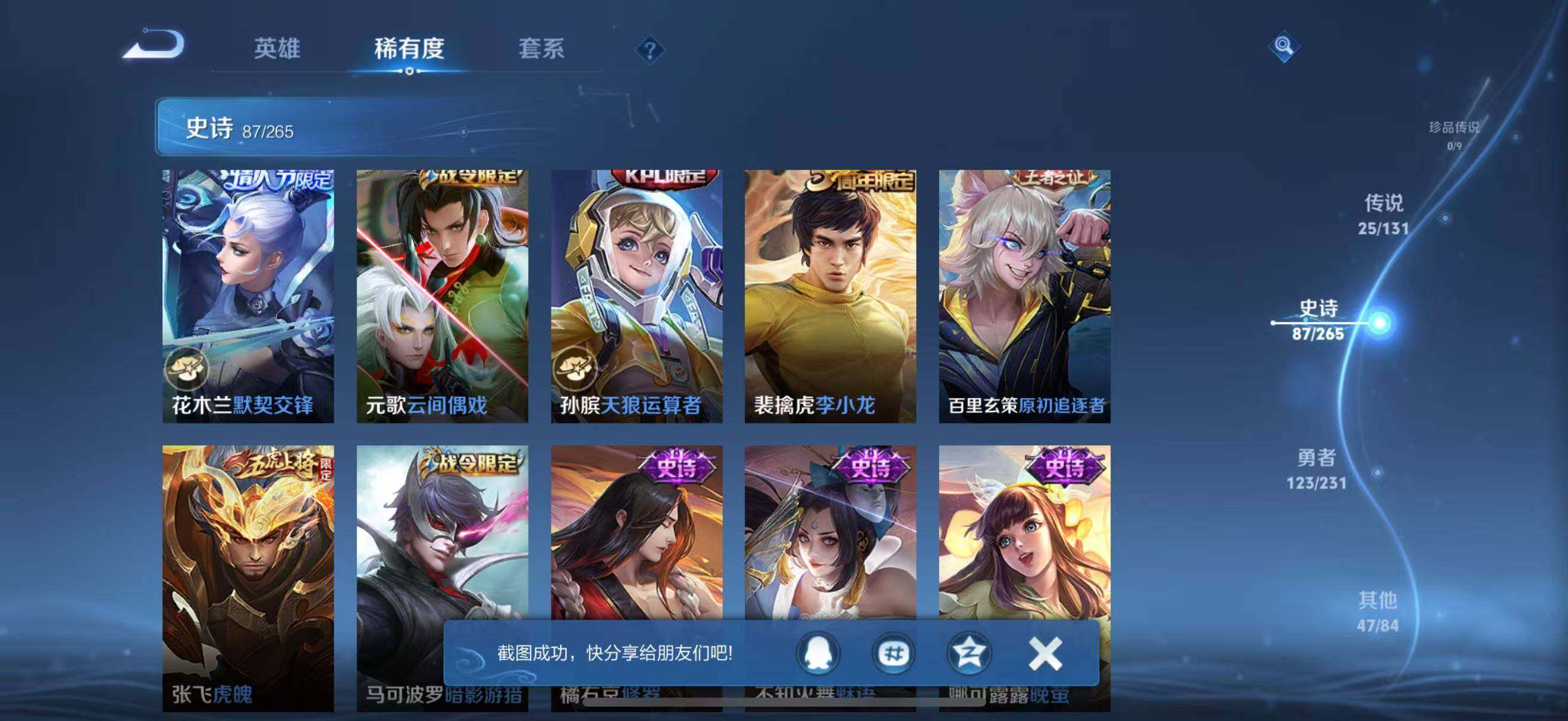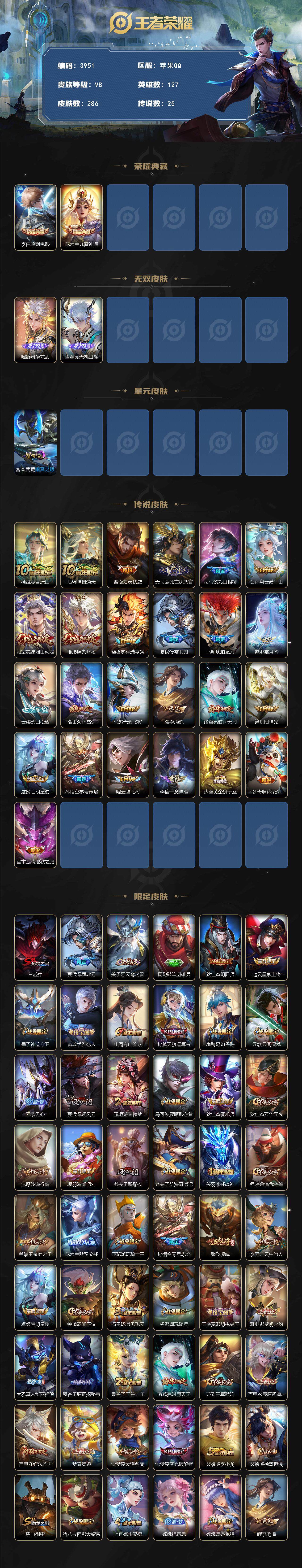 苹果Q-V8-至尊星耀II段位-127英雄-286皮肤-2典藏皮肤-2无双-25传说-87史诗