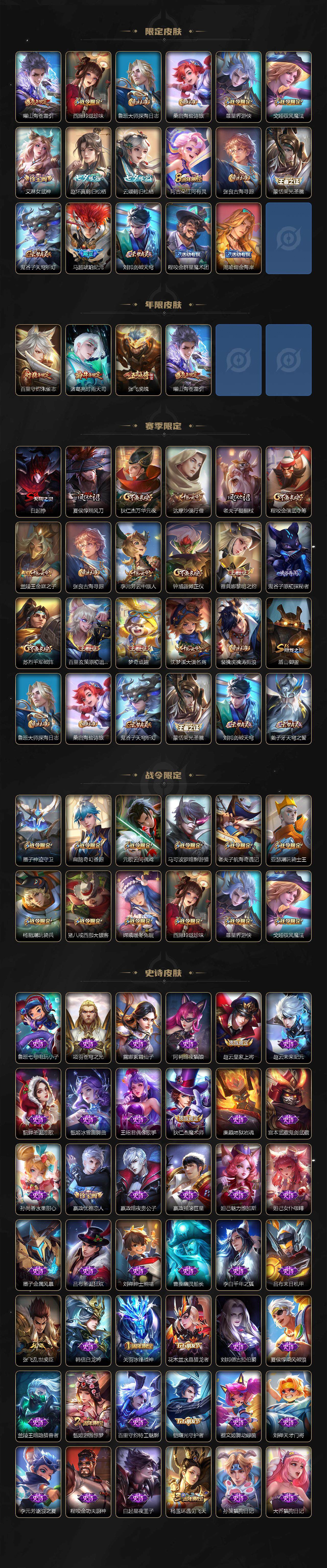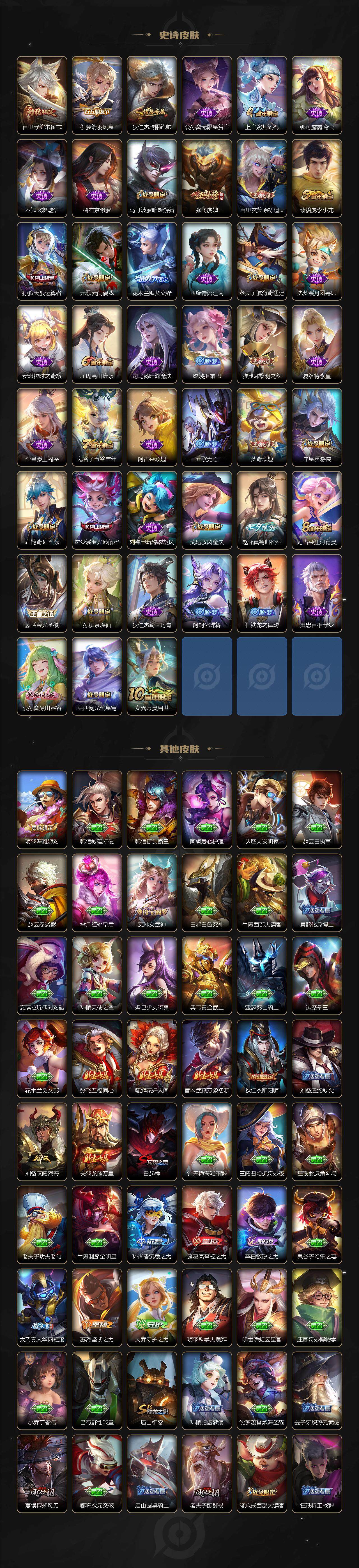 【传说皮肤】:杨戬纵目迁山,后羿神树通天,曹操万灵伏威,大司命死亡执政官,司马懿九山相柳,公孙离云诺千山,司空震愿照山河定,澜愿