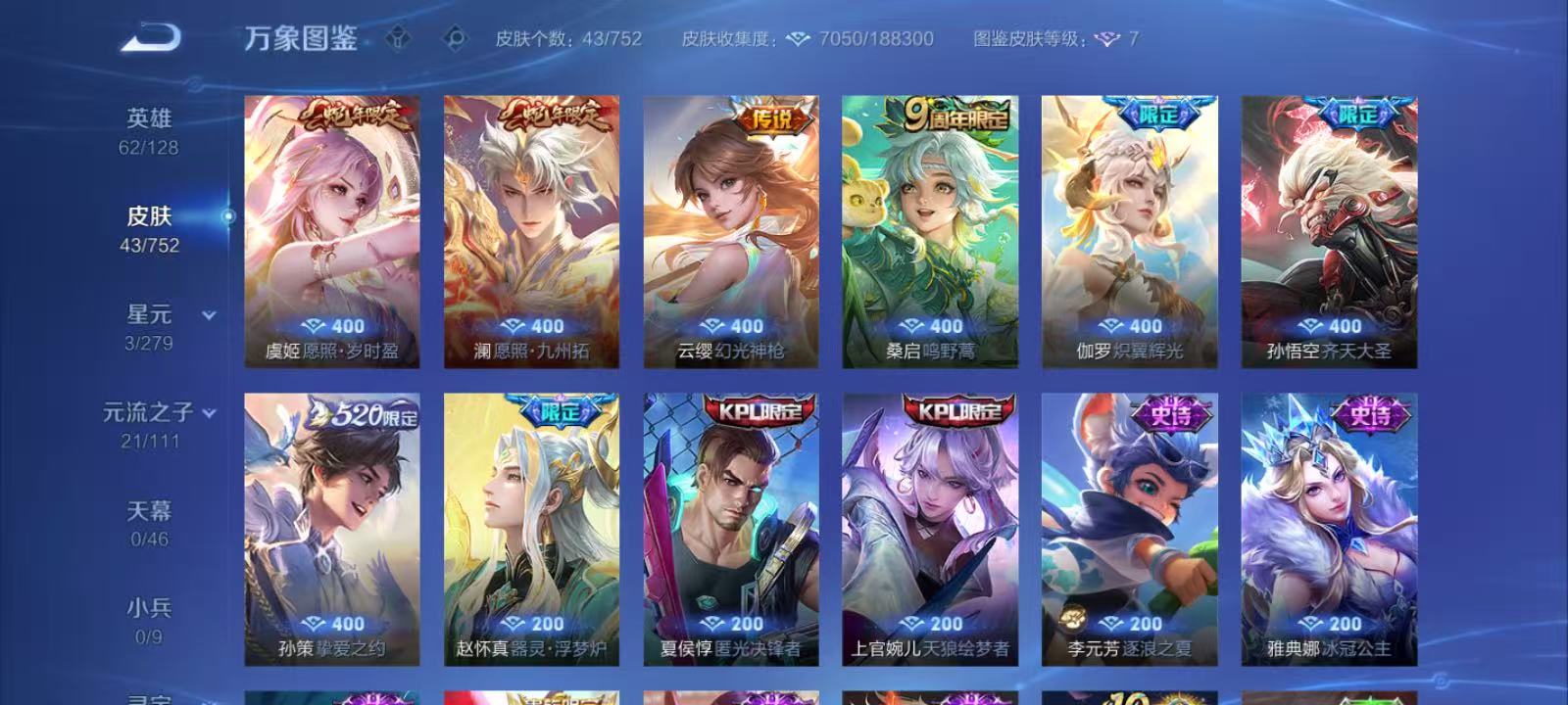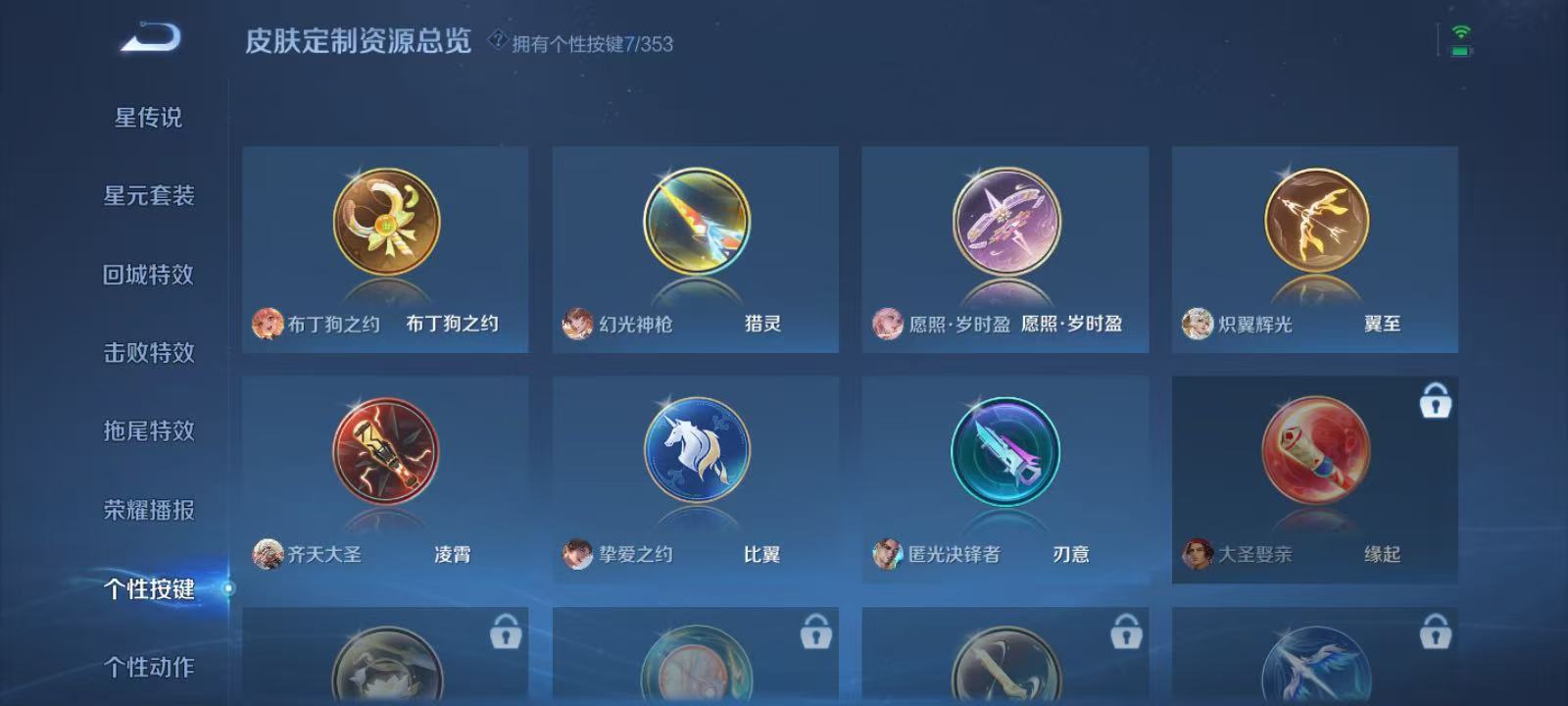 自玩小号-7质量传说虞姬愿照岁时盈,云缨幻光神枪,澜愿照九州拓,桑启鸣野蒿,伽罗炽翼辉光,孙悟空齐天大圣,孙策挚爱之约-7款个性按键