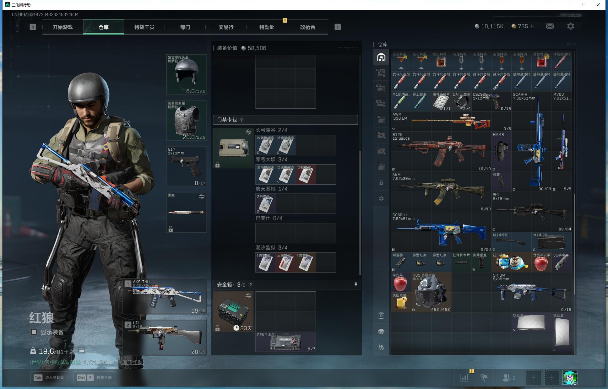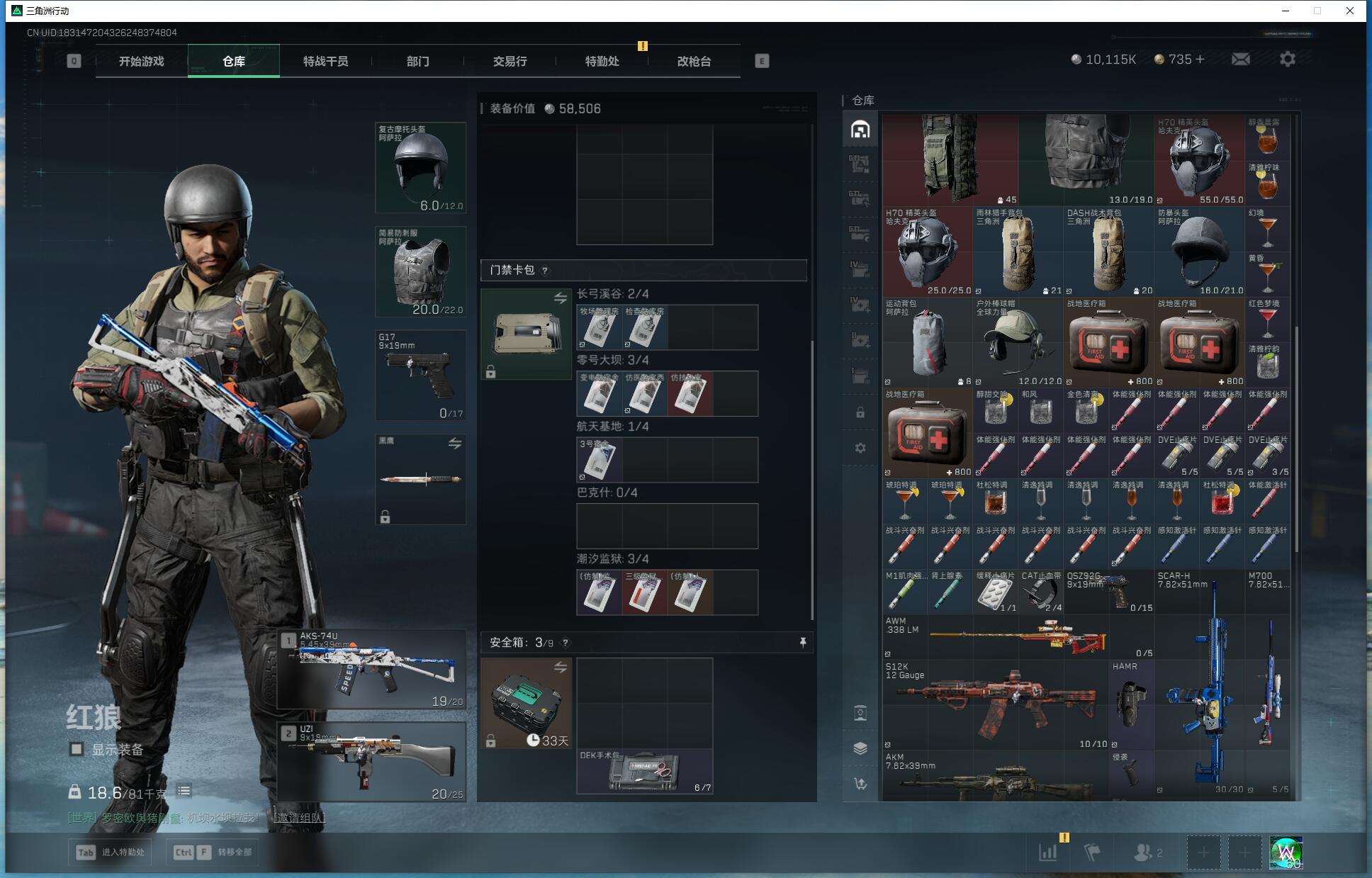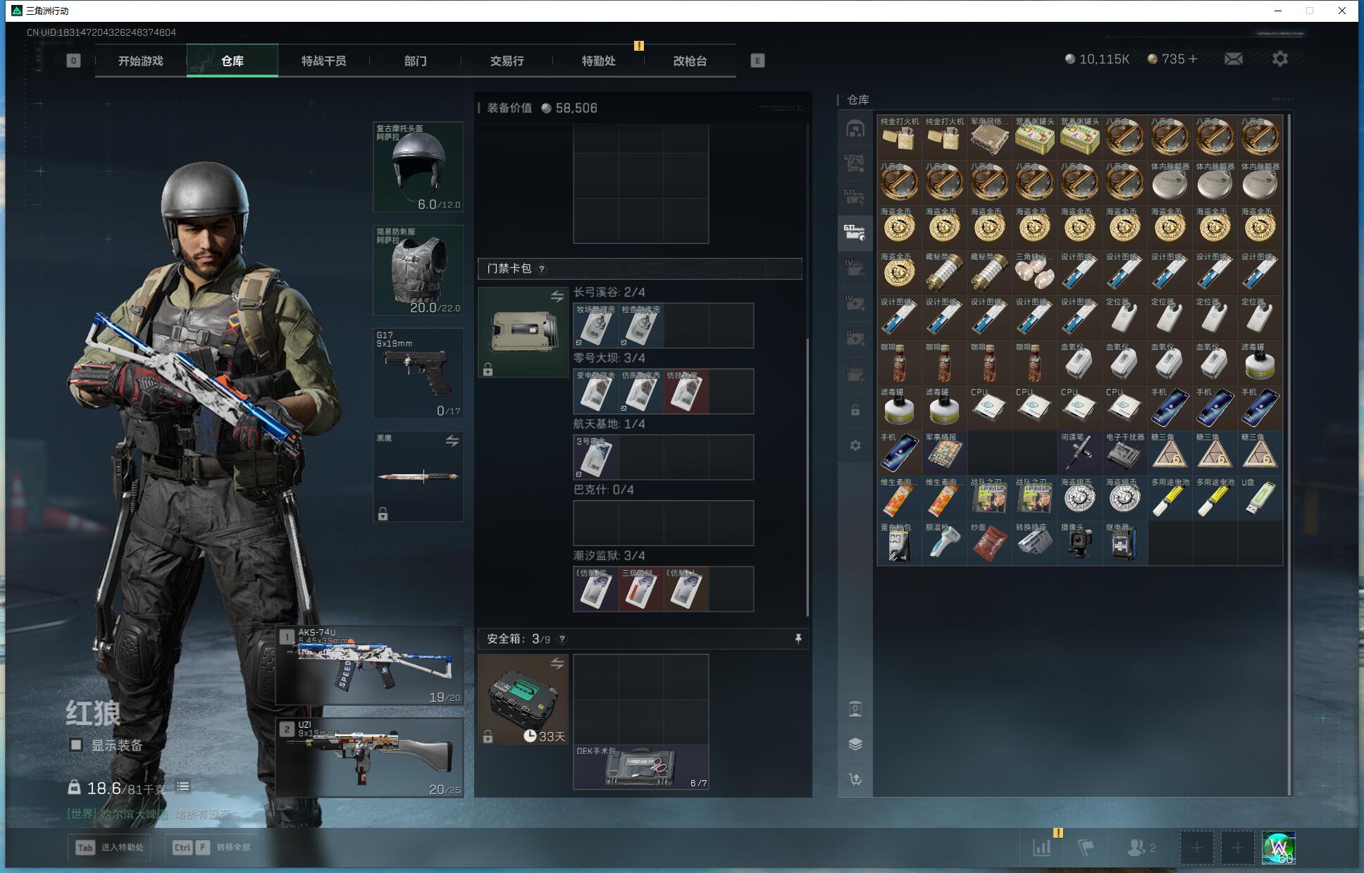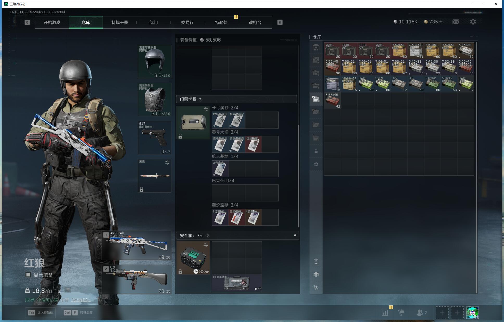 X5390/Q区/可排位/总资产158M/哈夫币1000W/行动等级60/战场等级50/红狼蚀金玫瑰