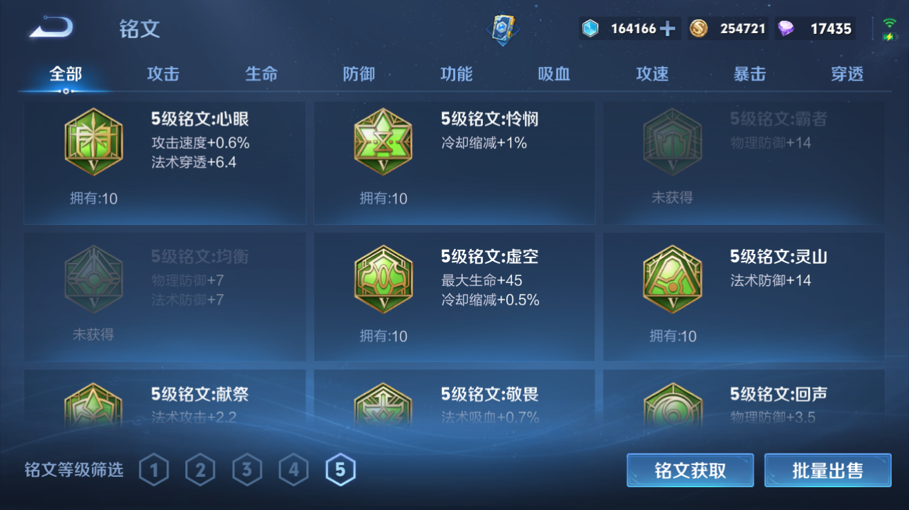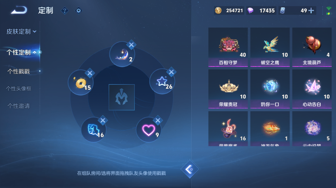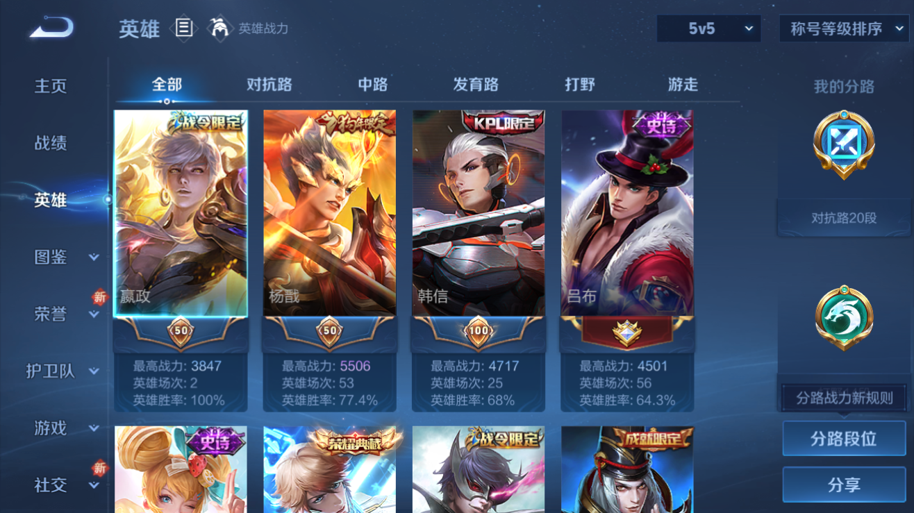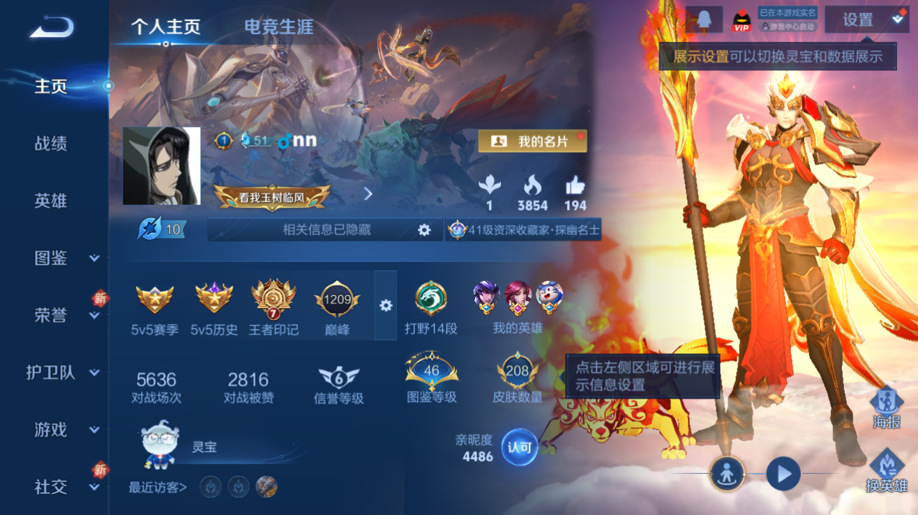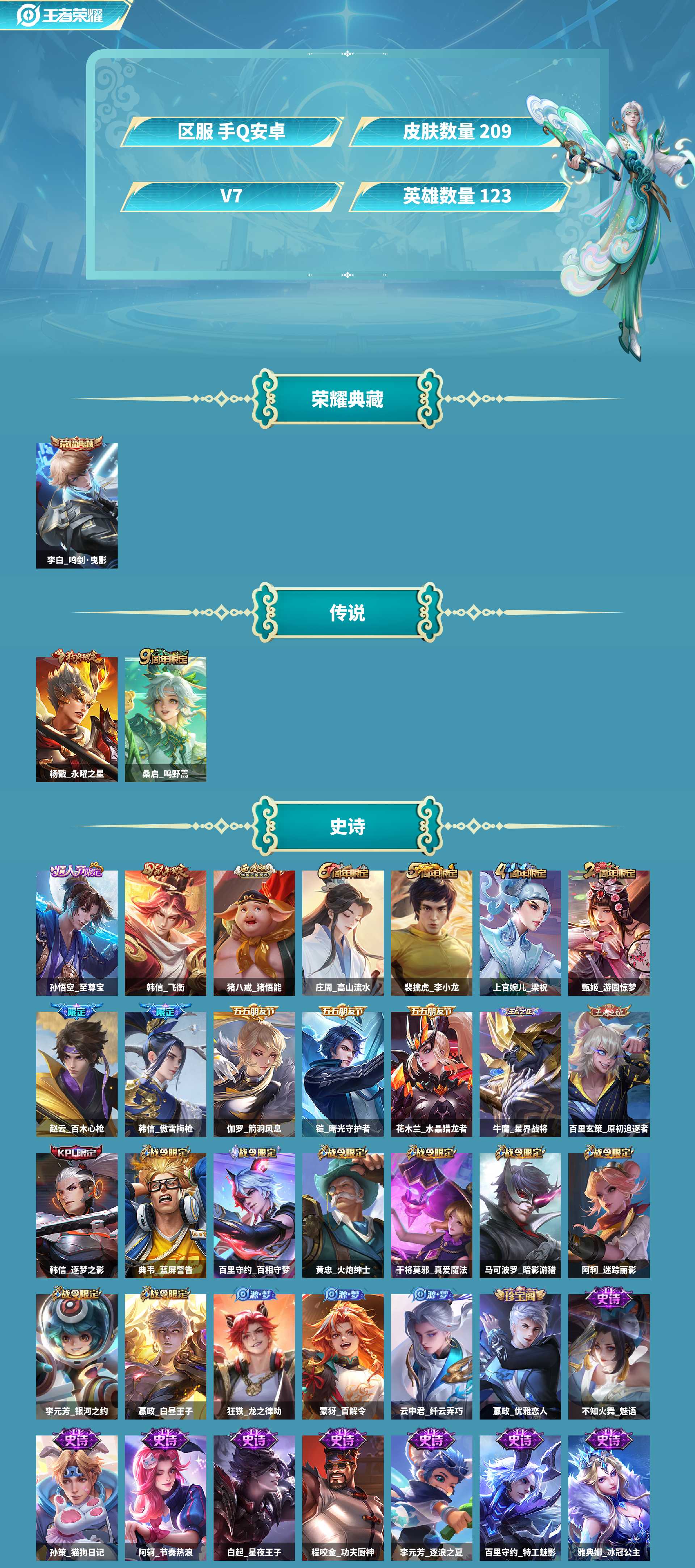 李白典藏/狗杨戬/至尊宝皮肤数量208印记总数7V7非凡王者