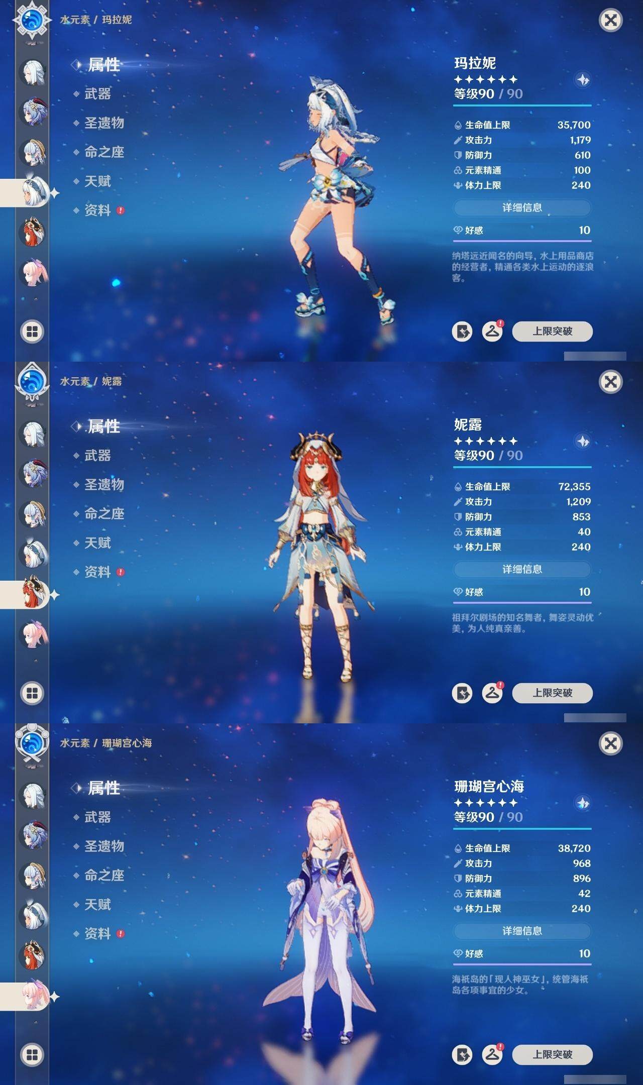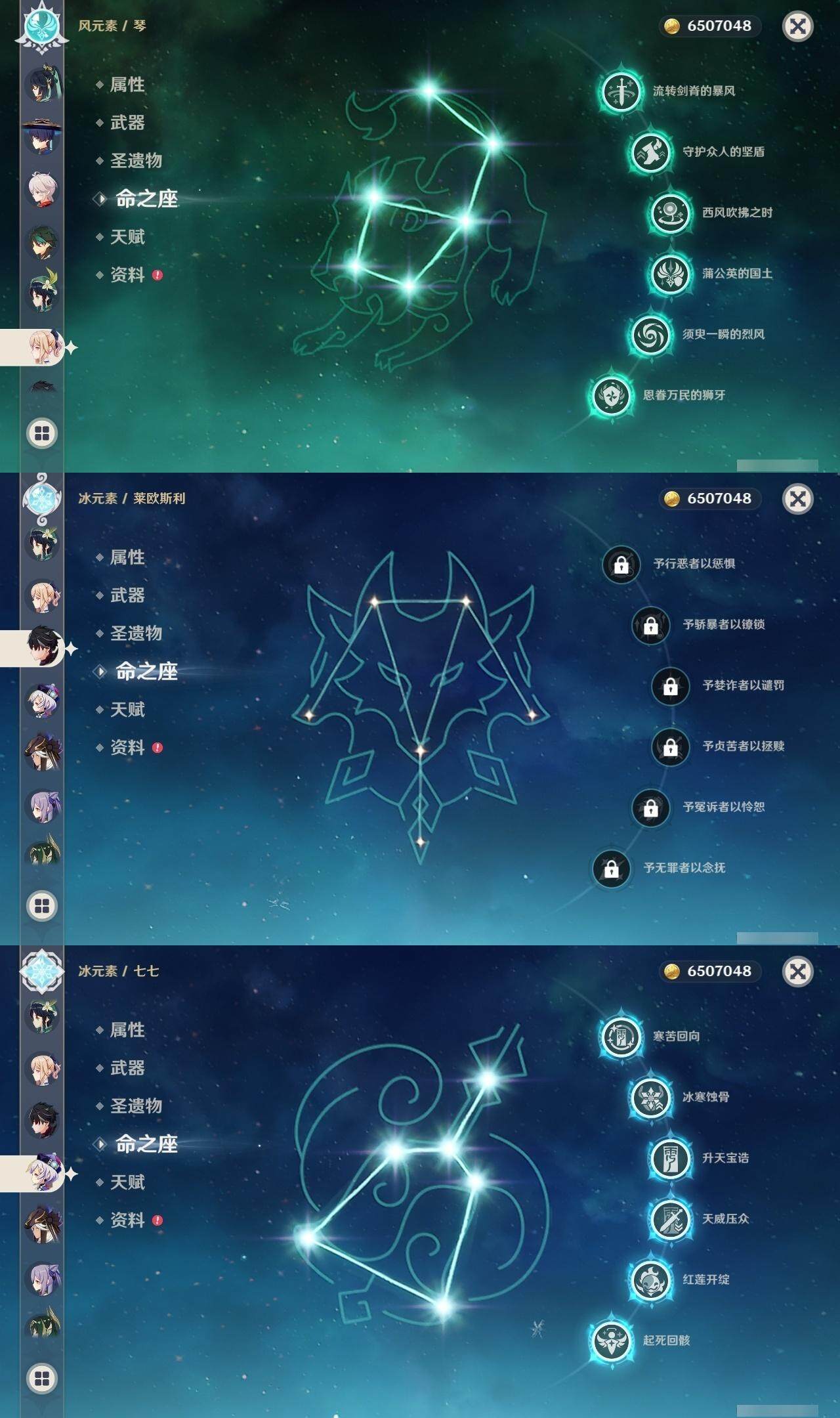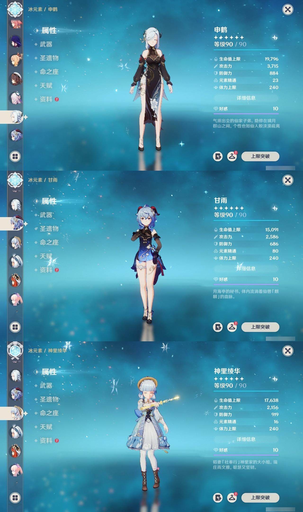 0命千织,0命闲云,0命娜维娅,0命芙宁娜,0命莱欧斯利,0命那维莱特,0命白术,4命迪希雅,0命艾尔海森,4命流浪者,满命纳西妲,满命妮露,0命赛诺,满命提纳里,满命夜兰,0命神里绫人,满命八重神子,2命申鹤,满命荒泷一斗,满命雷电将军,2命枫原万叶,满命神里绫华,满命钟离,满命胡桃,满命甘雨,0命魈,满命宵宫,0命温迪,0命可莉,满命达