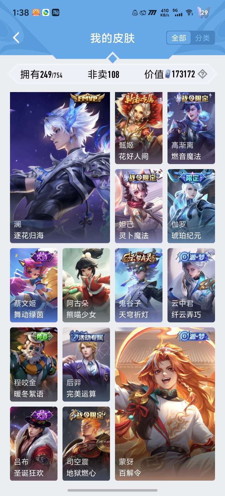 皮肤249 英雄125 荣耀王者 荣耀典藏1 传说5 其他皮肤98-极品连体号还有穿越火线英雄联盟都有