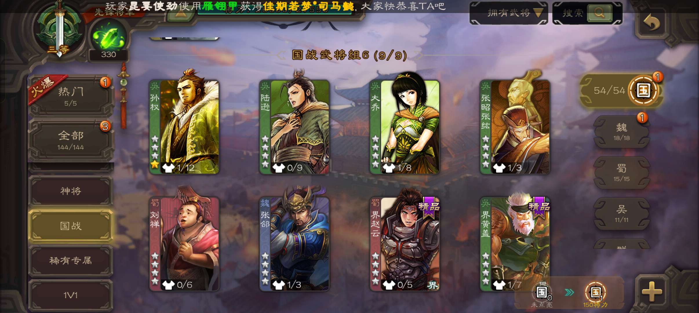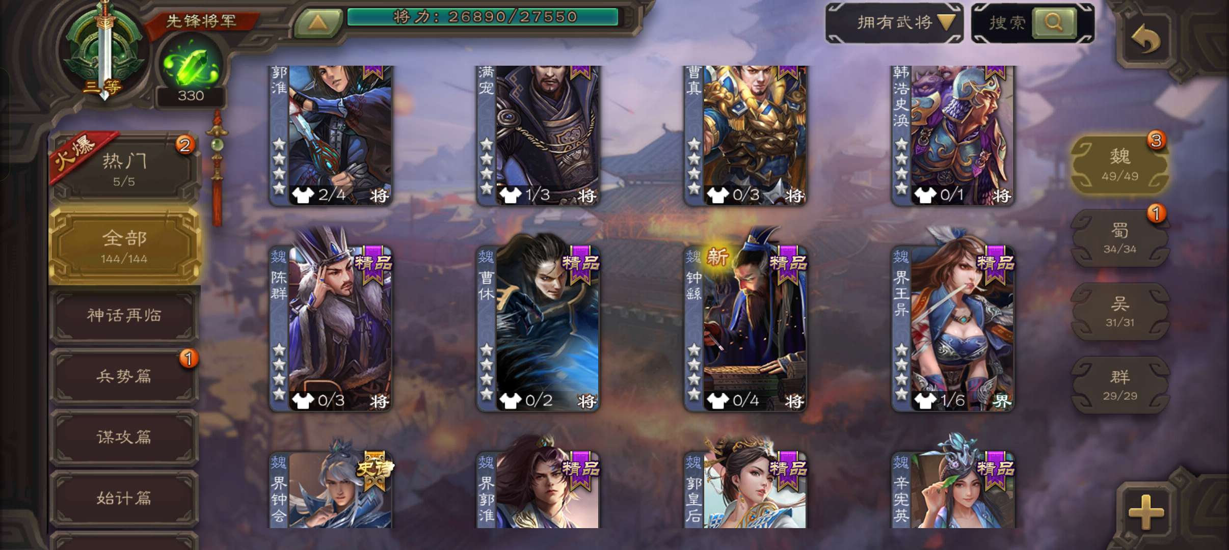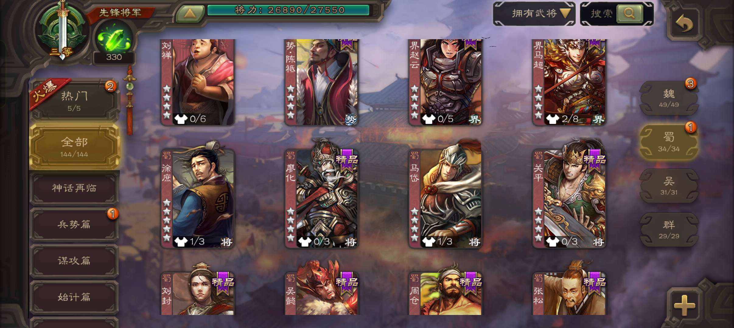 先锋将军,7万羽毛6.4万豆,天工李遗,回廊动白马神吕布界钟会3史诗,界孙权桥公崔琰144将