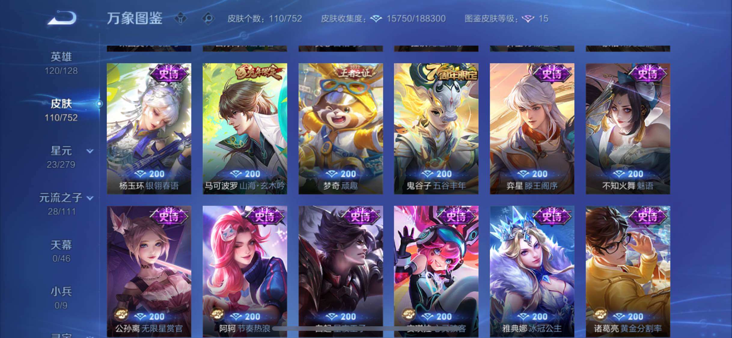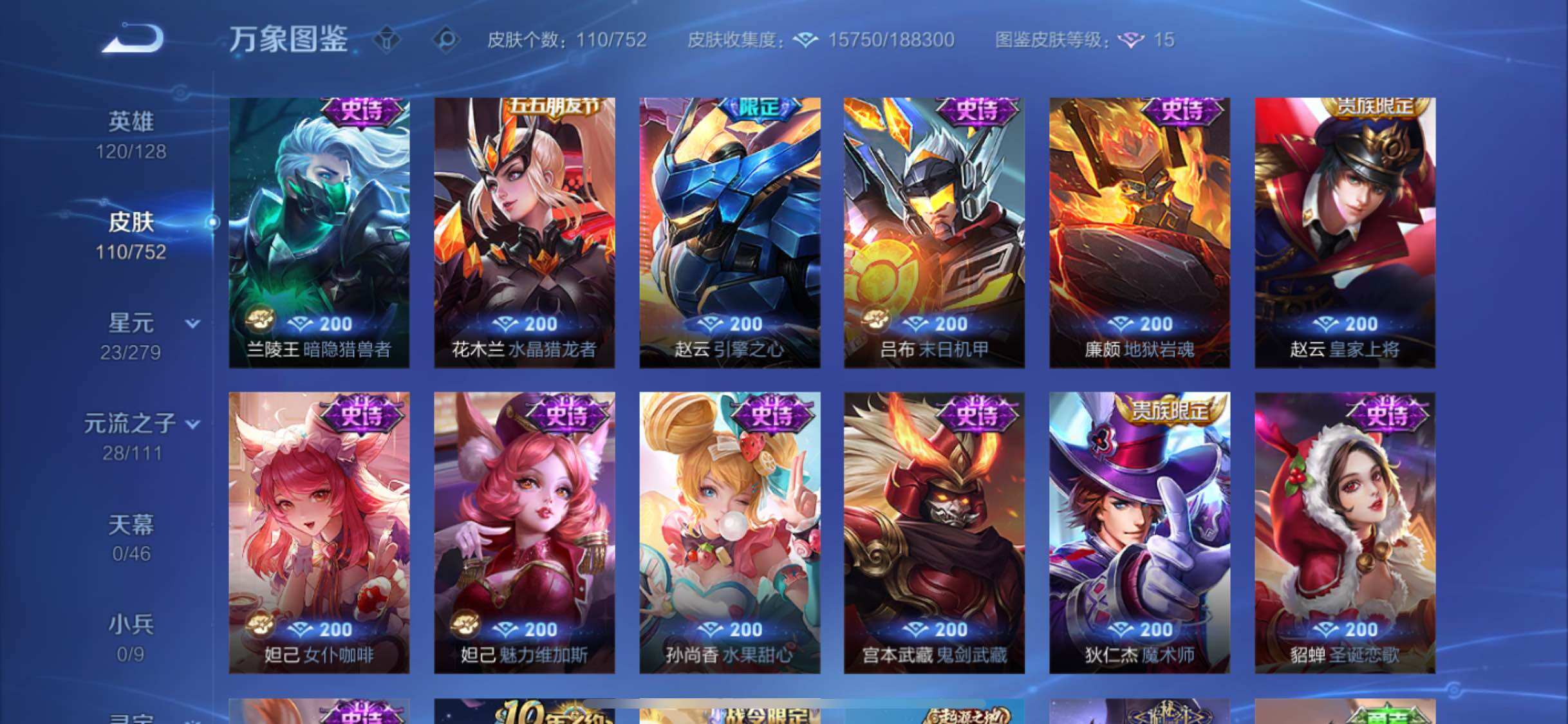 【传说皮肤】:后羿神树通天,干将莫邪画中仙,李信山海炽霜斩,马超无双飞将,后羿黄金射手座