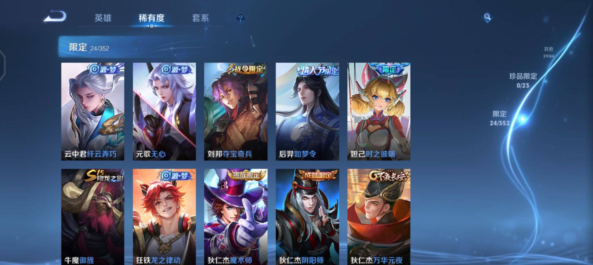 【限定皮肤】:狄仁杰阴阳师,赵云皇家上将,妲己时之彼端,钟无艳王者之锤,元歌无心,狄仁杰魔术师,狄仁杰万华元夜,项羽海滩派对,老夫子醍醐杖,刘邦夺宝奇