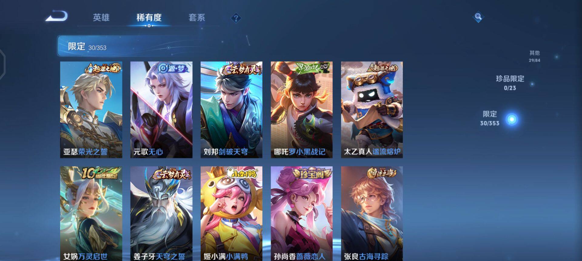 【限定皮肤】:姜子牙天穹之誓,杨戬破阵退雄兵,狄仁杰阴阳师,孙尚香蔷薇恋人,元歌无心,项羽海滩派对,李元芳云中旅人,鬼谷子五谷丰年,沈梦