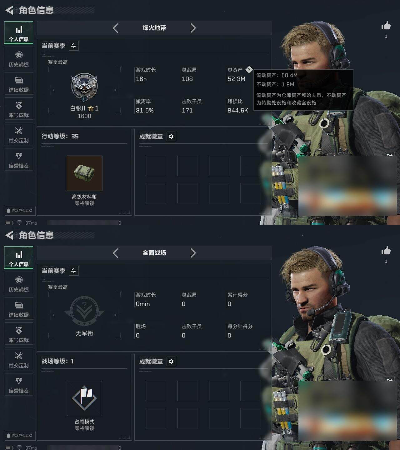 总资产:52.3M, 哈夫币:32990K ;总资产(M):52M/哈夫币(K):32990K/哈夫币(K):32990K/全面战场等级:1_段位:无段位/烽火地带等级:35_段位:白银