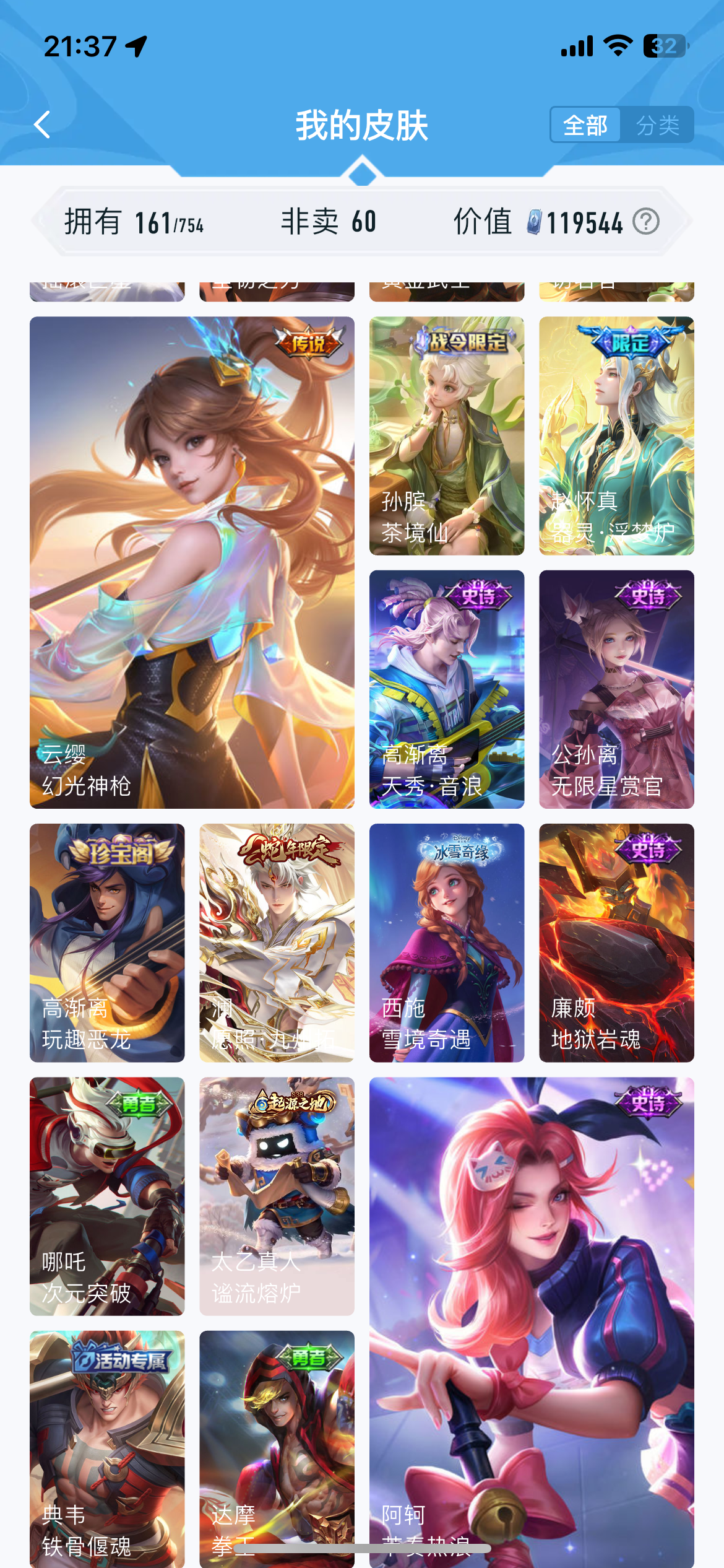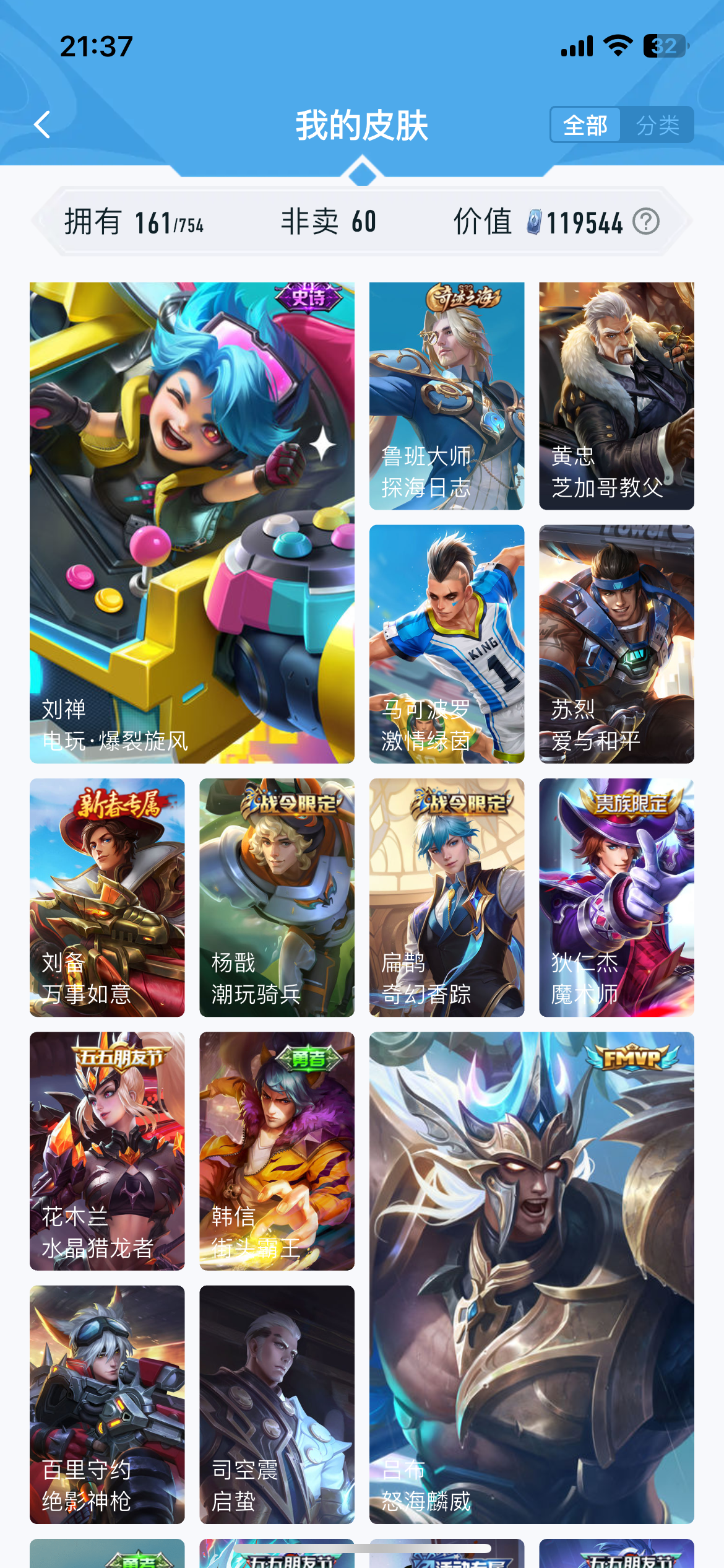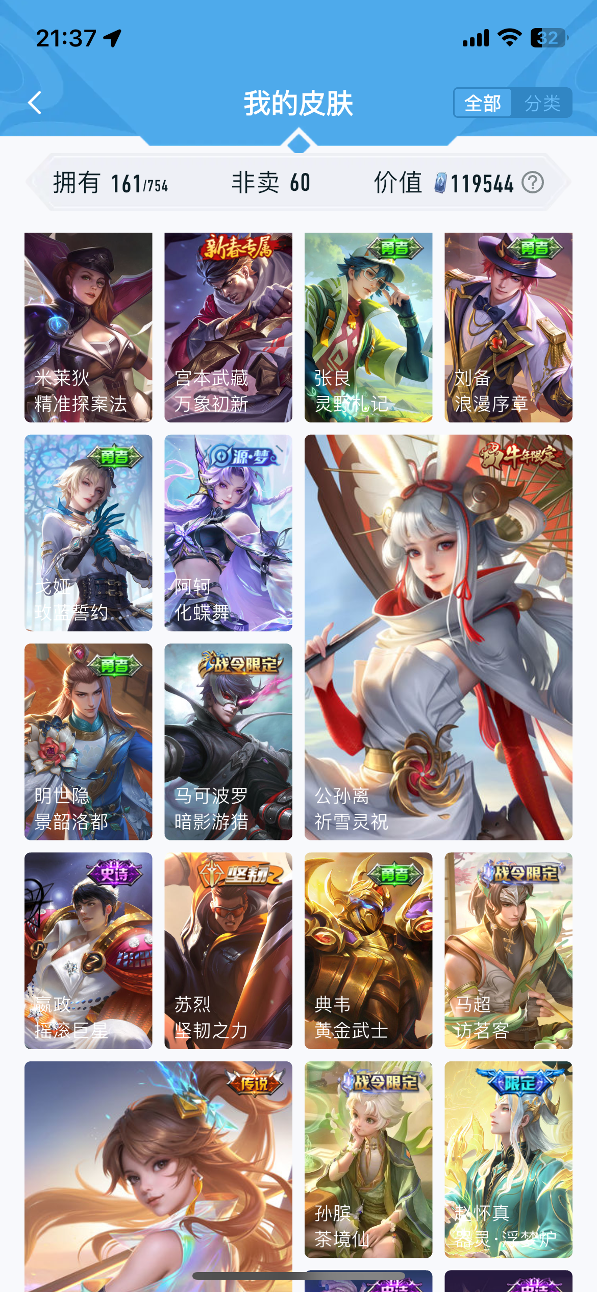皮肤161 英雄125 至尊星耀 传说12 其他皮肤60