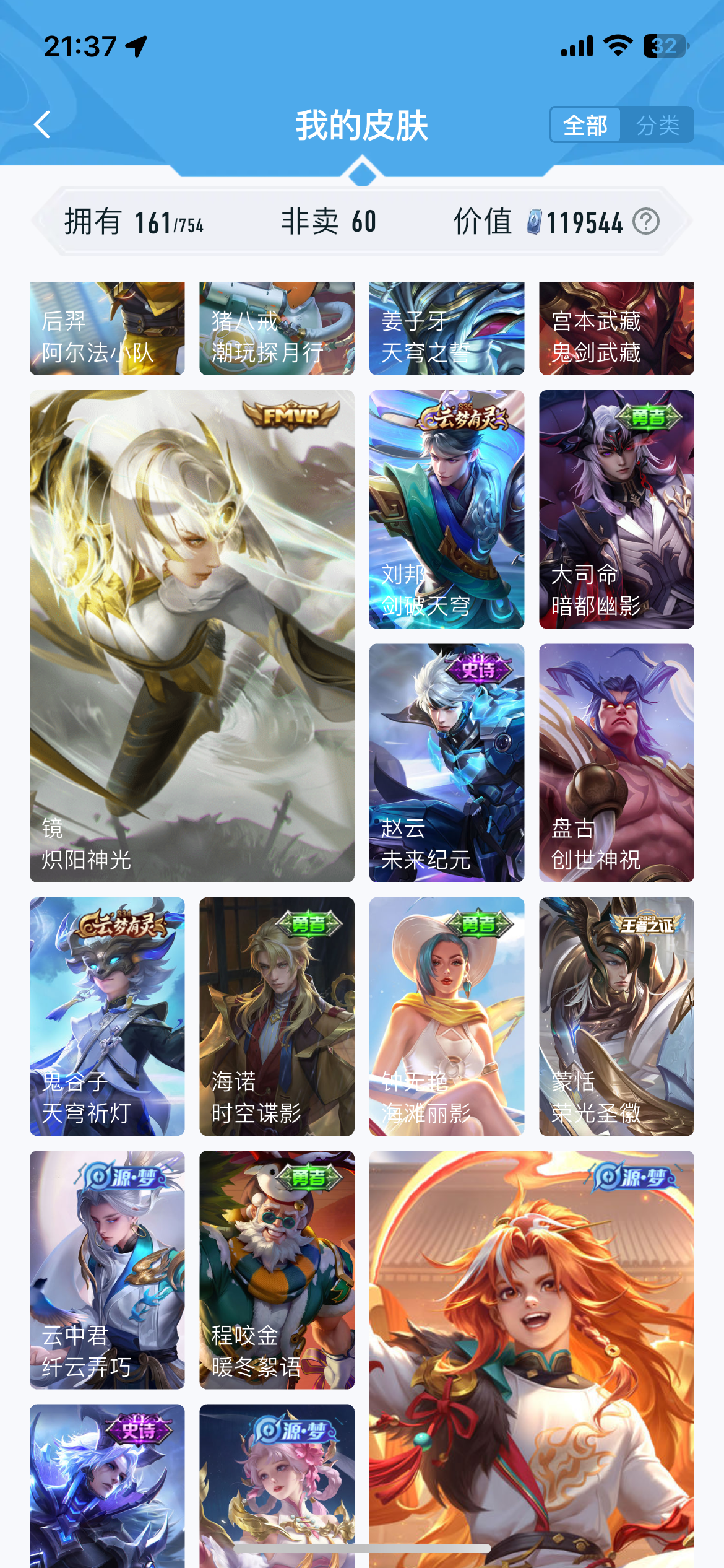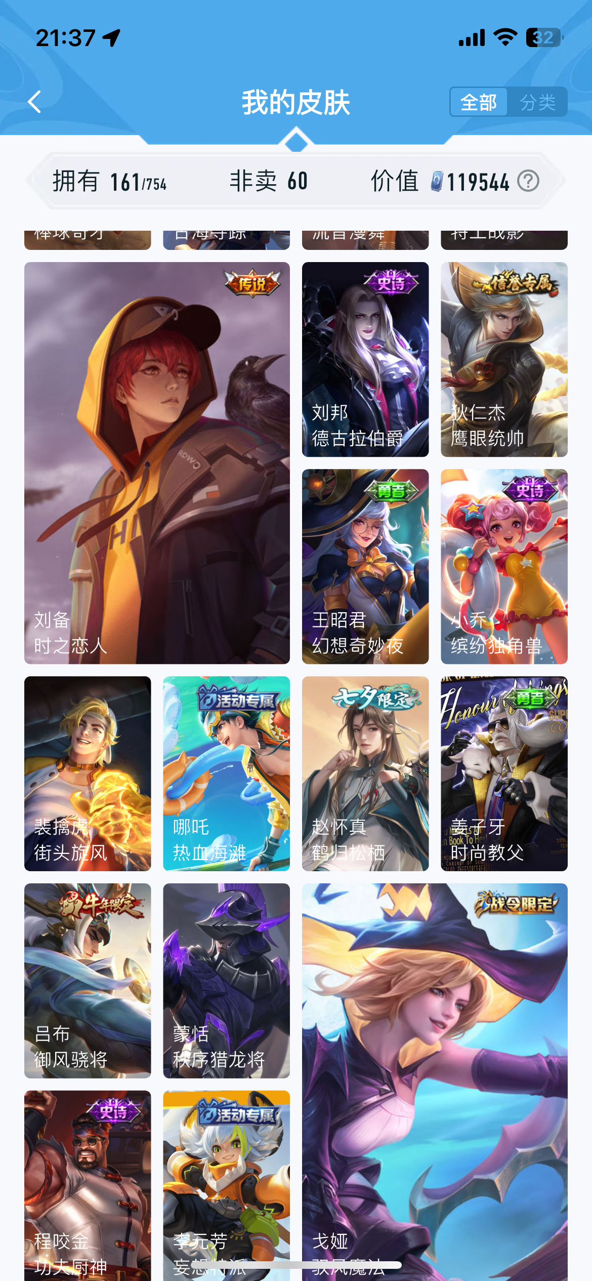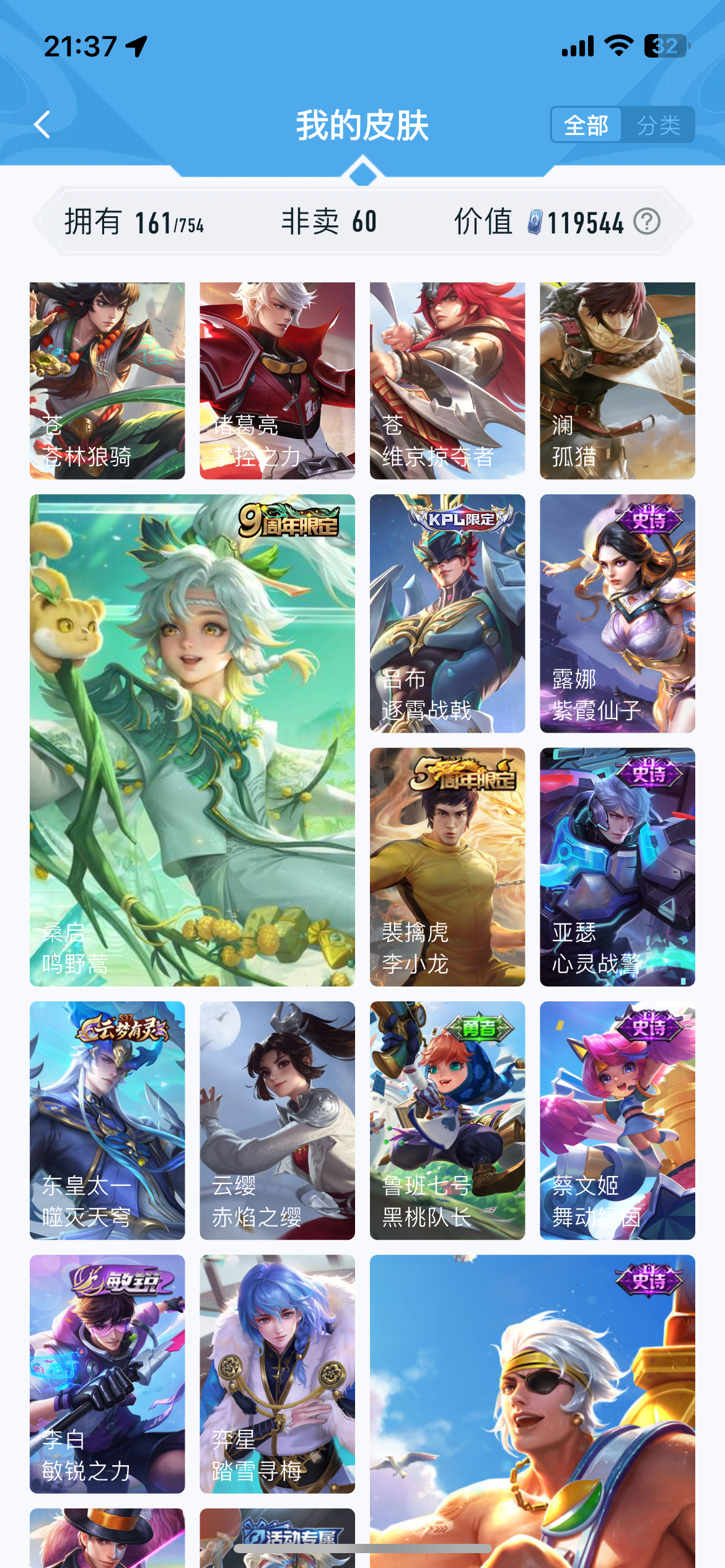 皮肤161 英雄125 至尊星耀 传说12 其他皮肤60