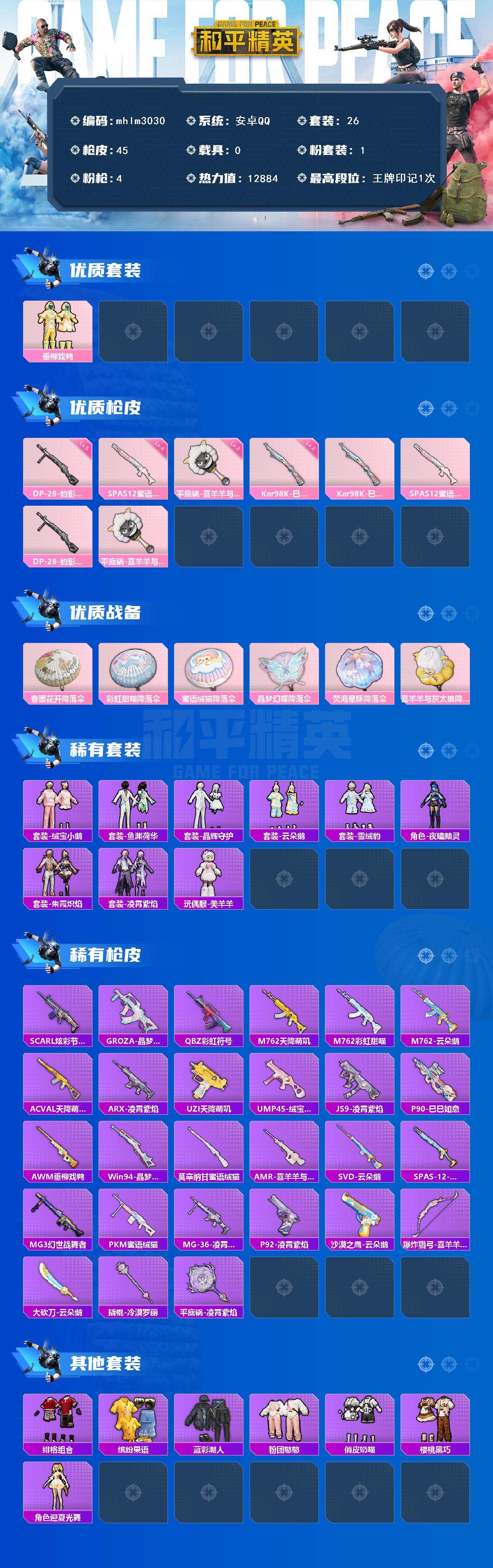 【mhlm3030】安卓 手Q-1粉装-4特效枪-0载具-0粉色飞行器-12884热力值-1王牌印记-26套装-45枪皮