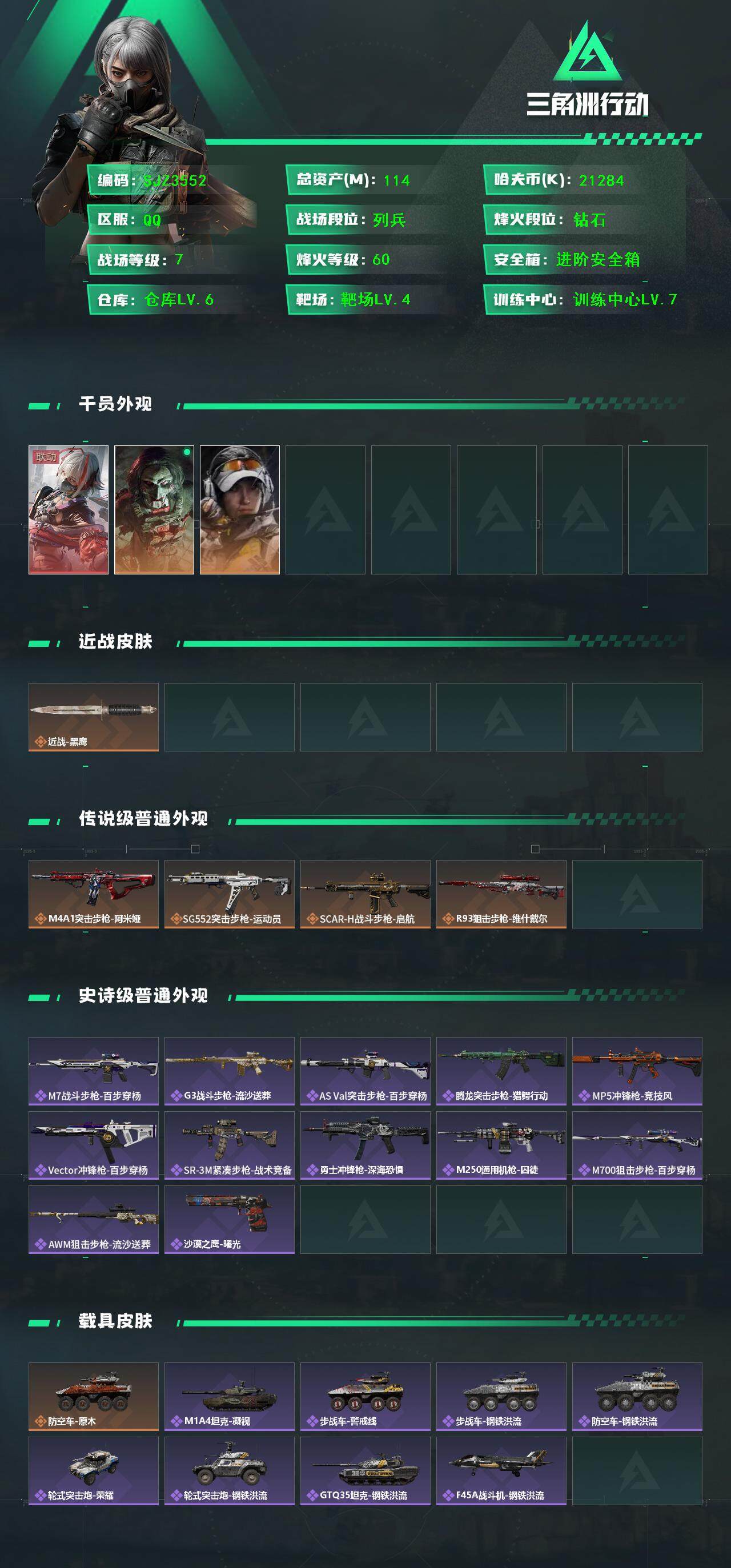 总资产(M):114M/哈夫币(K):21284K/传说枪皮数:4/全面战场等级:7_段位:列兵/烽火地带等级:60_段位:钻石