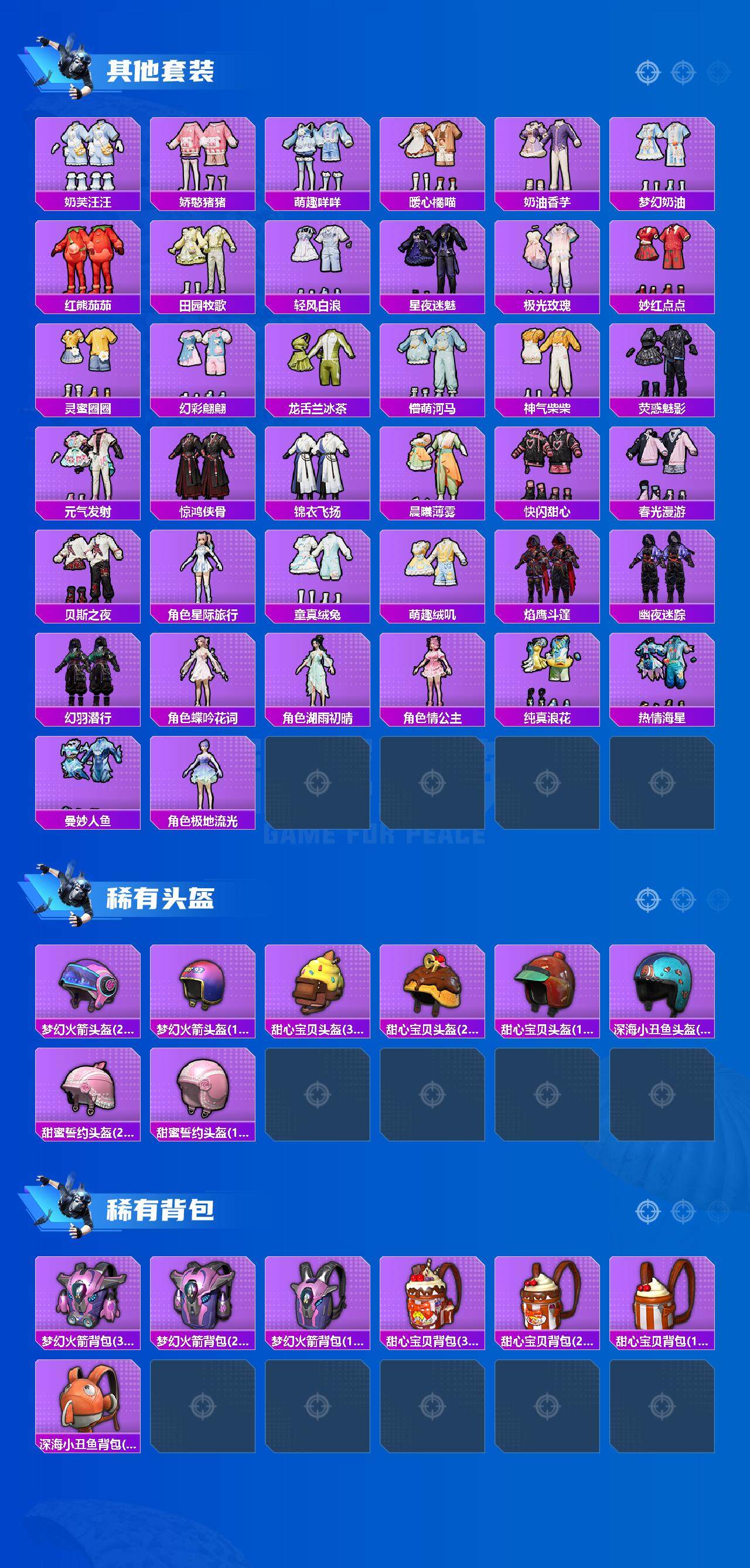【热门品类】:粉装-梦幻火箭,粉装-童趣迷兔,粉装-缤纷油彩,套装-浪漫天命,套装-都市猎人,套装-派对舞王,套装-深海小丑鱼,套装-小丑鱼,套装-奇异狩猎者,角色-军刀雅典娜,套装-龟仙人,套装-暗影哥特,套装-糯粉咩咩,套装-红熊茄茄