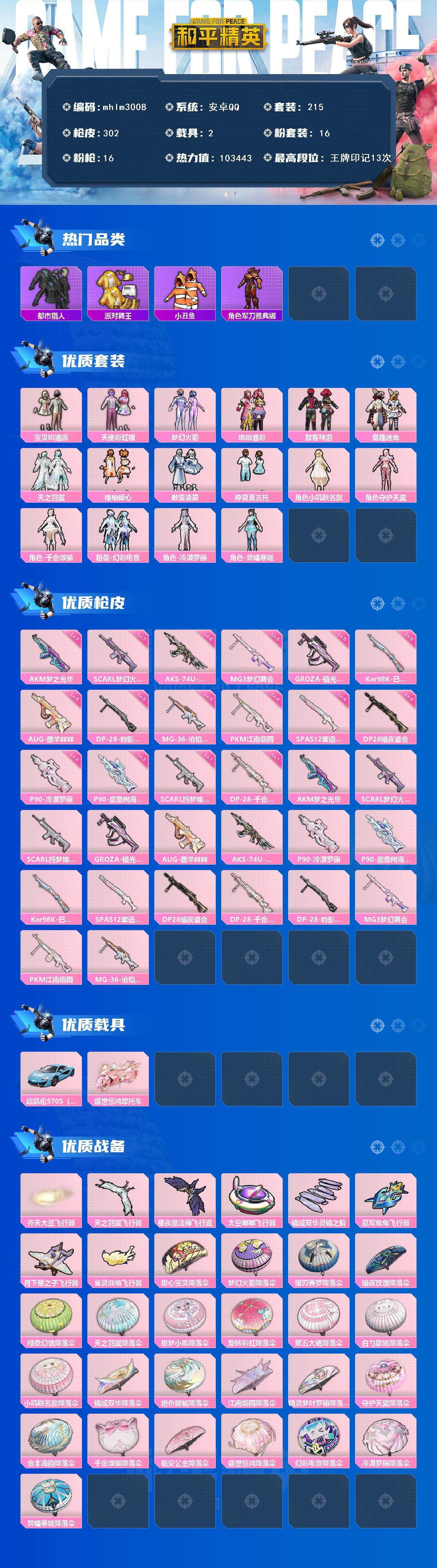 【mhlm3008】安卓 手Q-16粉装-16特效枪-2载具-9粉色飞行器-103443热力值-13王牌印记-215套装-302枪皮