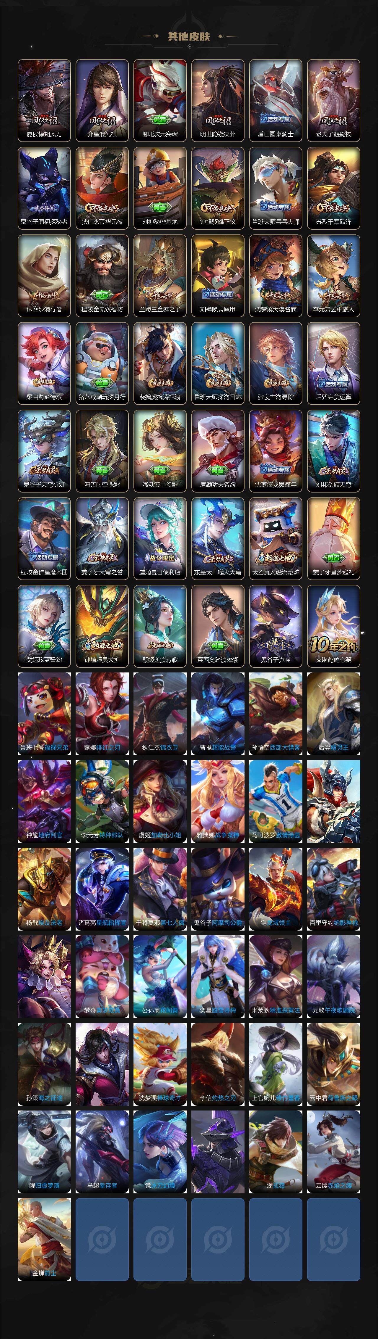 【限定皮肤】:白起狰,蔡文姬夏日便利店,虞姬夏日便利店,姜子牙天穹之誓,狄仁杰阴阳师,虞姬凯尔特女王,赵云皇家上将,庄周蜃楼王,孙膑妖精王,扁鹊炼金王,芈月