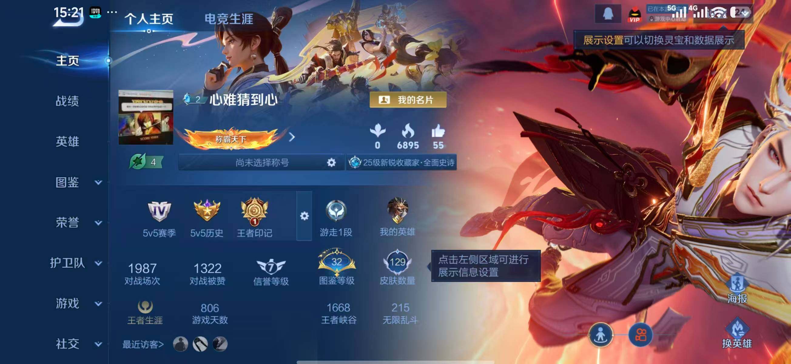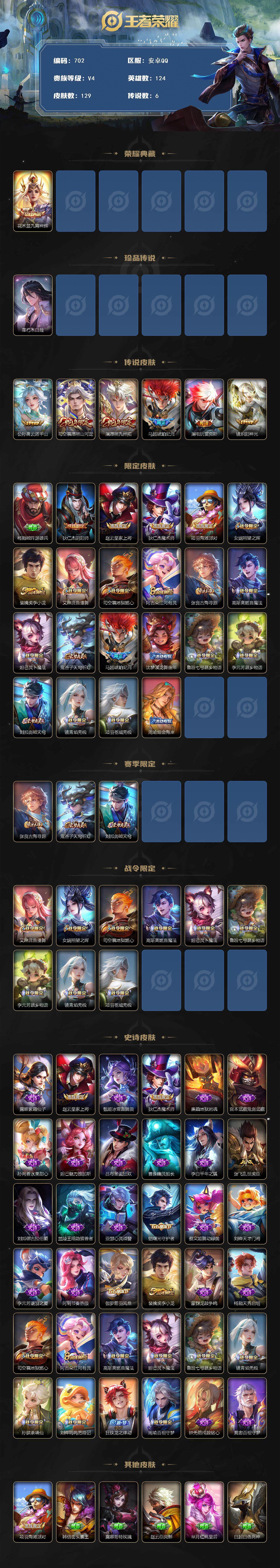 1878603 王者荣耀账号 安卓Q-V4-永恒钻石IV段位-124英雄-129皮肤-1典藏皮肤-1珍品传说-6传说-35史诗