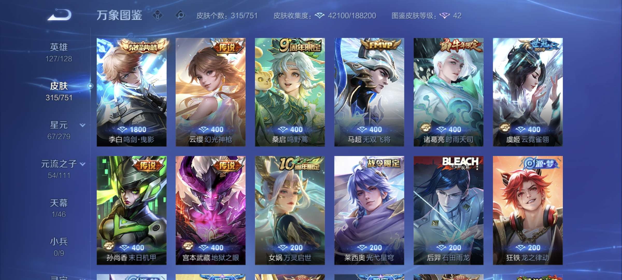皮肤316 英雄127 无双王者 荣耀典藏1 传说7 其他皮肤138-皮肤多有看上的可以来
