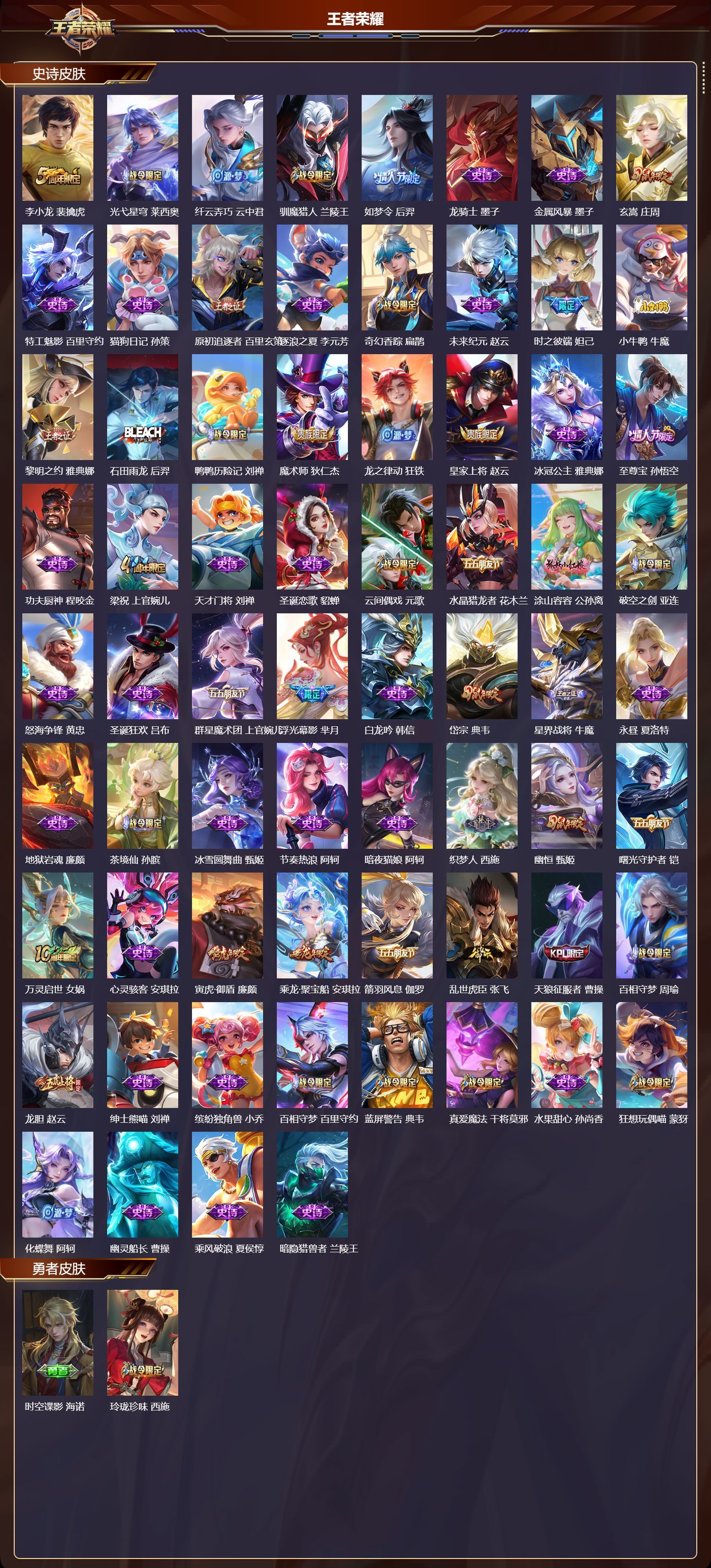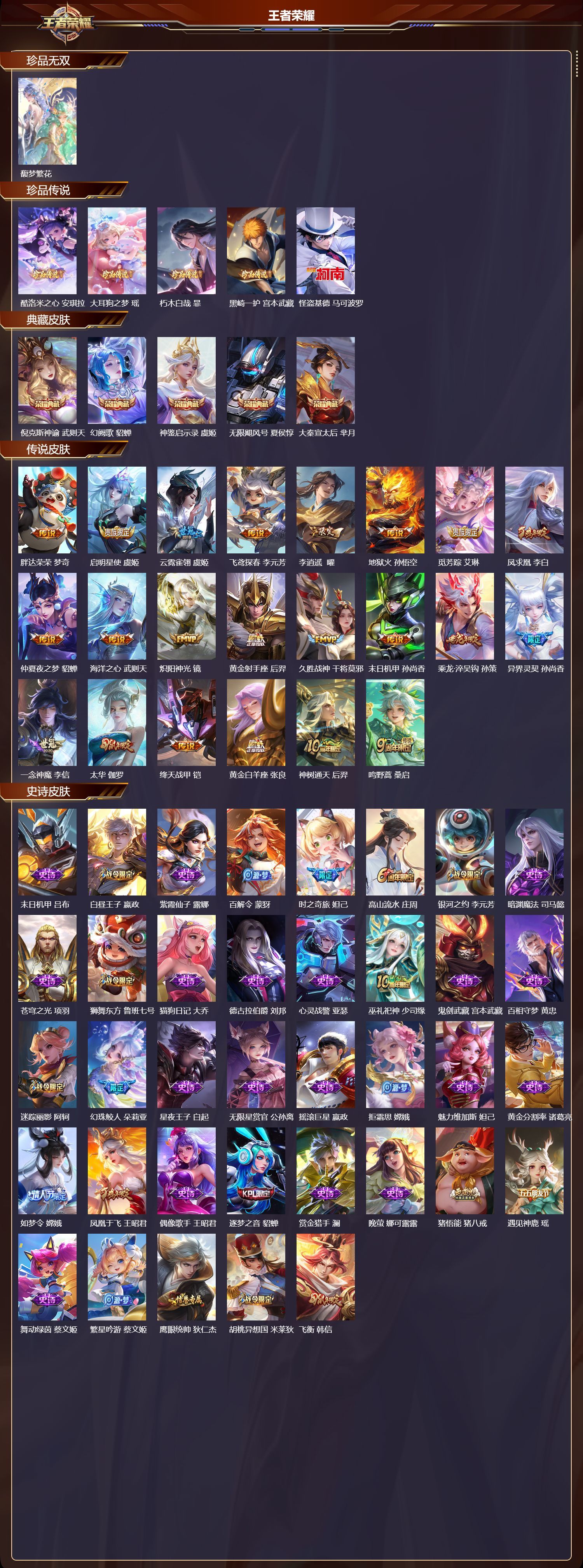 安卓QQ/传奇王者/380皮肤/128英雄/5典藏/1珍品无双/0无双/5珍品传说/22传说/105