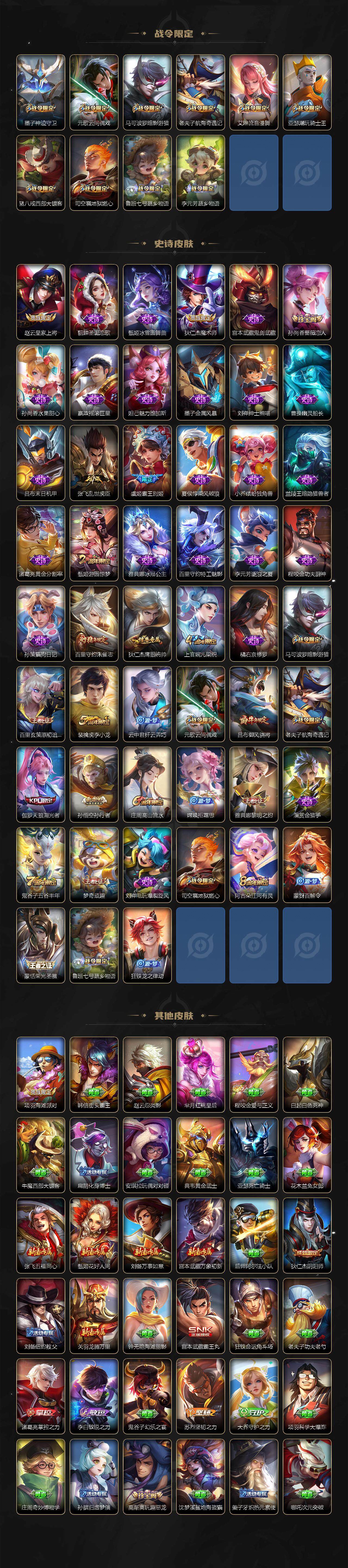 【限定皮肤】:狄仁杰阴阳师,赵云皇家上将,墨子神迹守卫,孙尚香蔷薇恋人,鲁班七号寅虎瑞焰,庄周高山流水,高渐离玩趣恶龙,吕布御风骁将,元歌云间偶戏,甄姬游园惊梦,马可波罗暗影游猎,狄仁杰魔术师,狄仁杰万华元