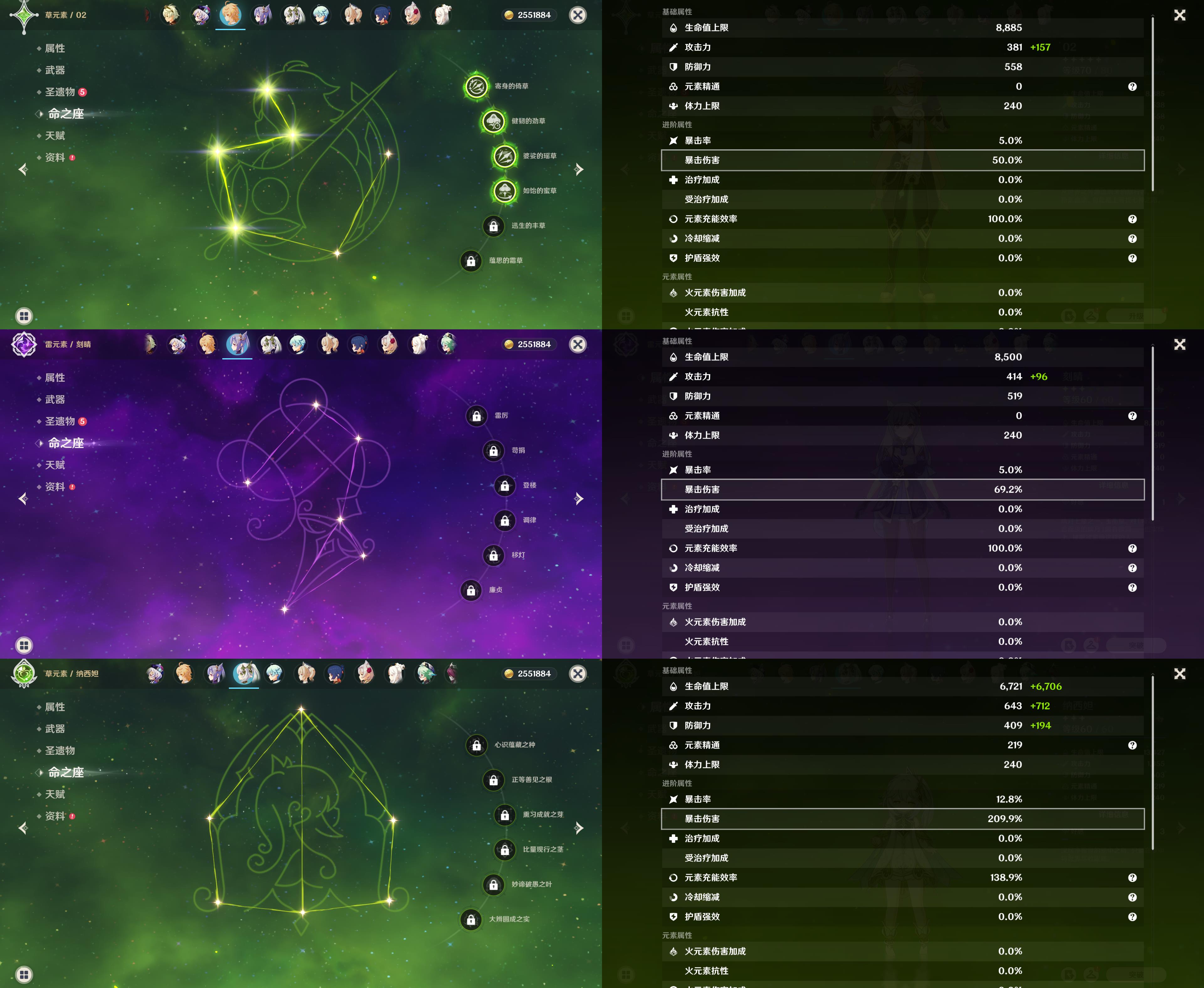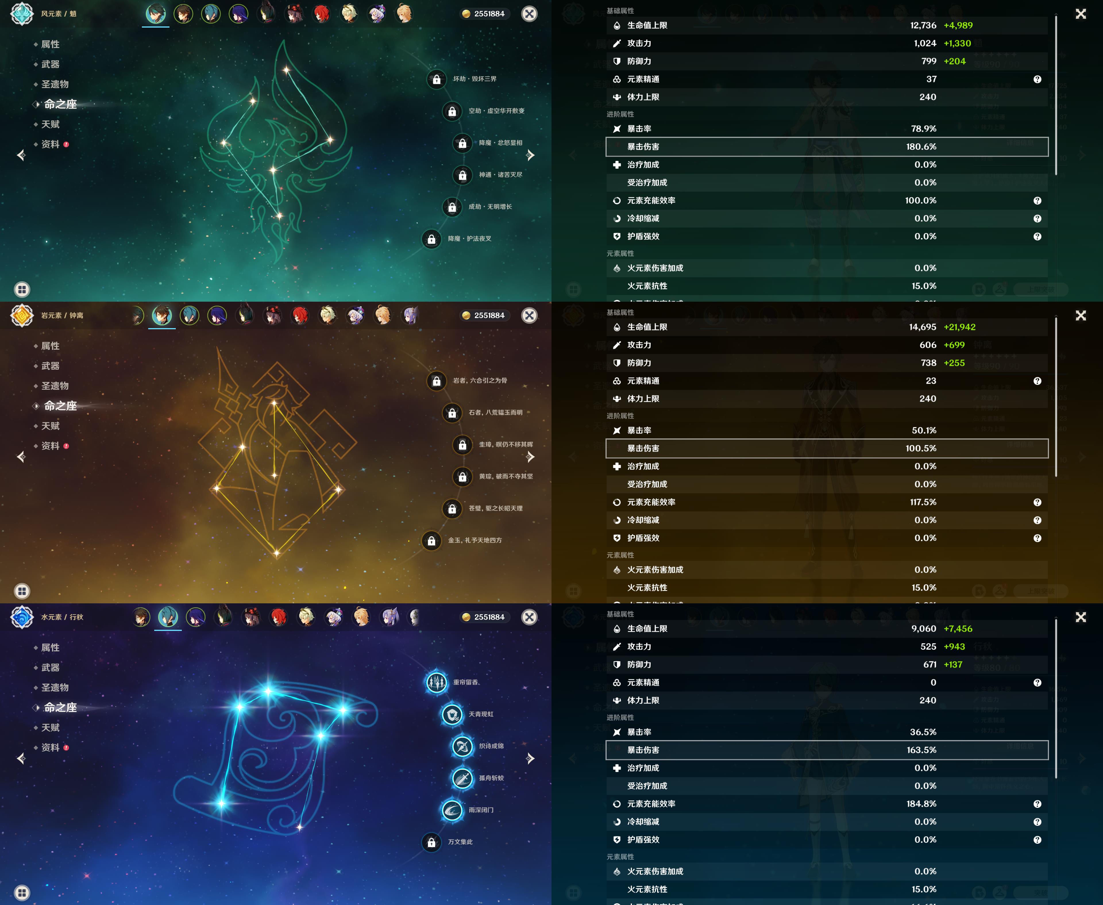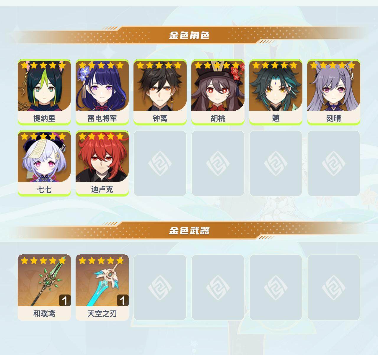 【YS1034】55级/10黄/女主/8个五星角色/2个五星武器/魈/钟离/雷电将军/提纳里/胡桃/迪卢克/七七/刻晴/和璞鸢/天空之刃