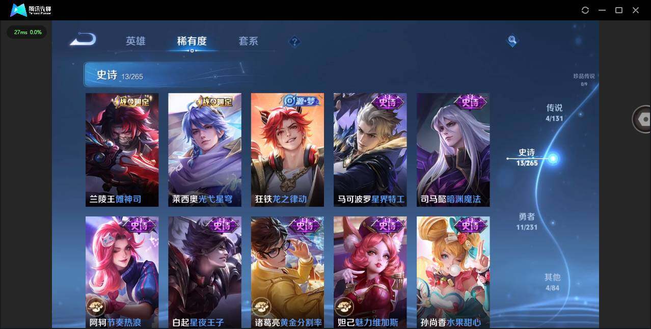 贵族等级: V6 英雄数: 51 皮肤数: 32 传说皮: 霜月吟,澜逐花归海