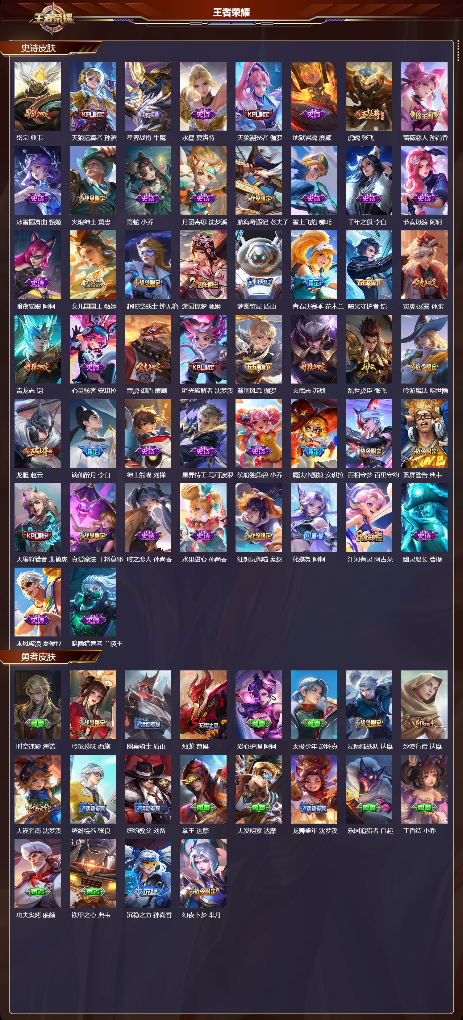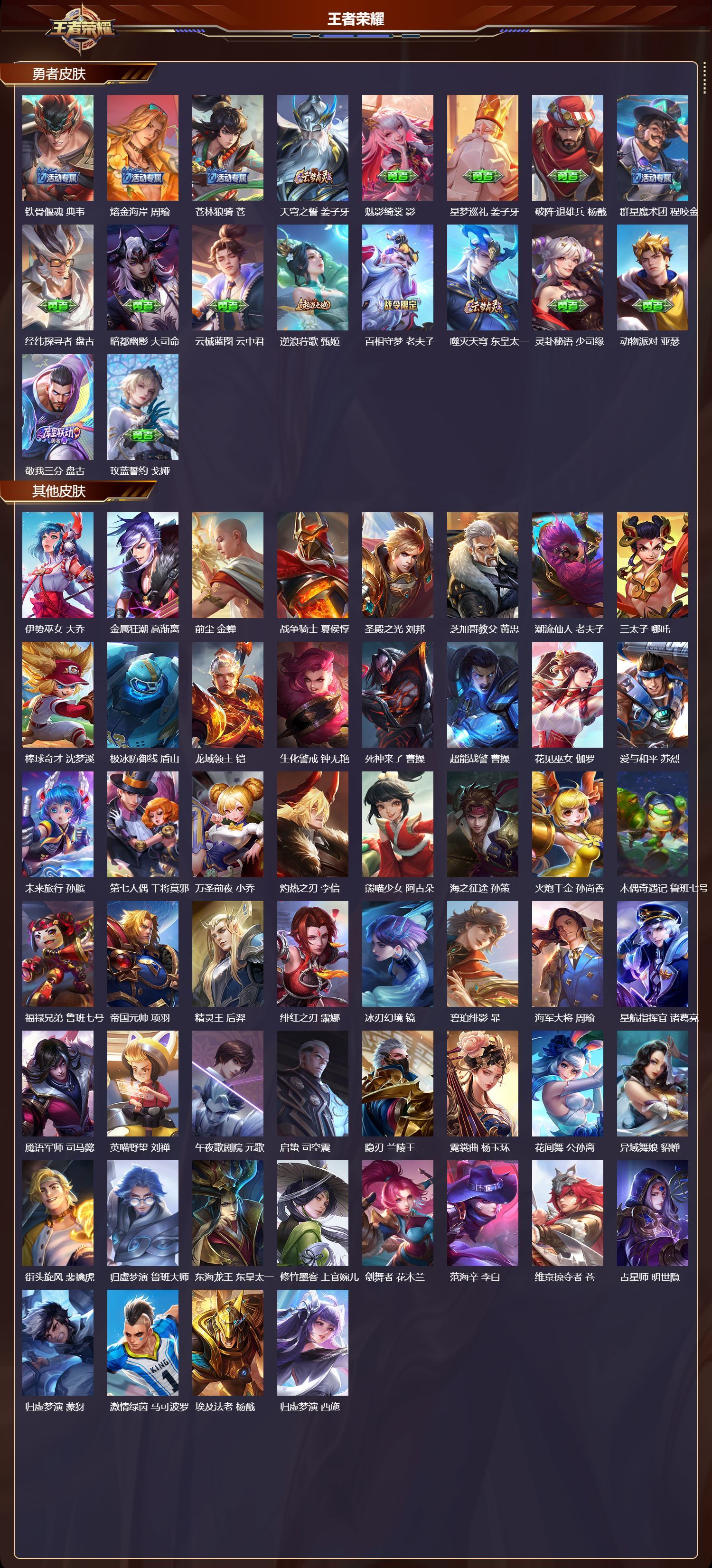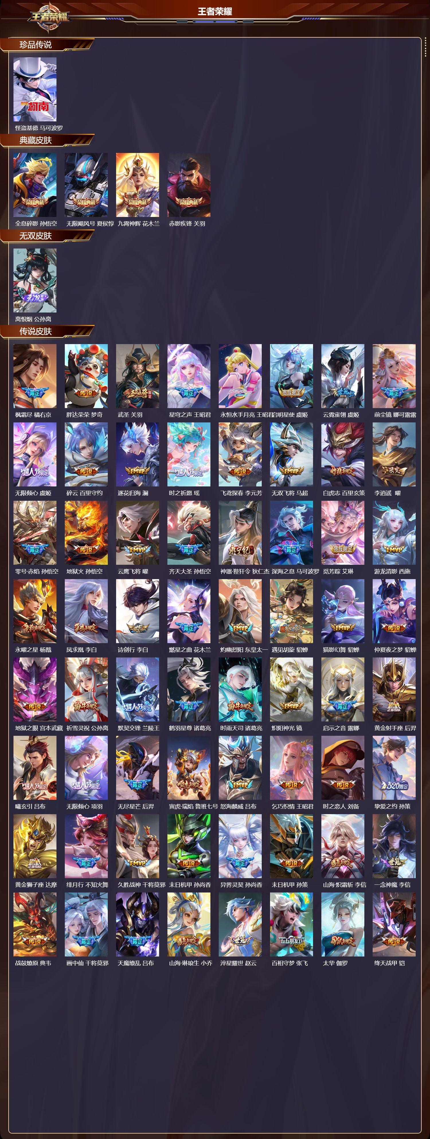 苹果QQ/非凡王者/522皮肤/127英雄/4典藏/0珍品无双/1无双/1珍品传说/75传说/17