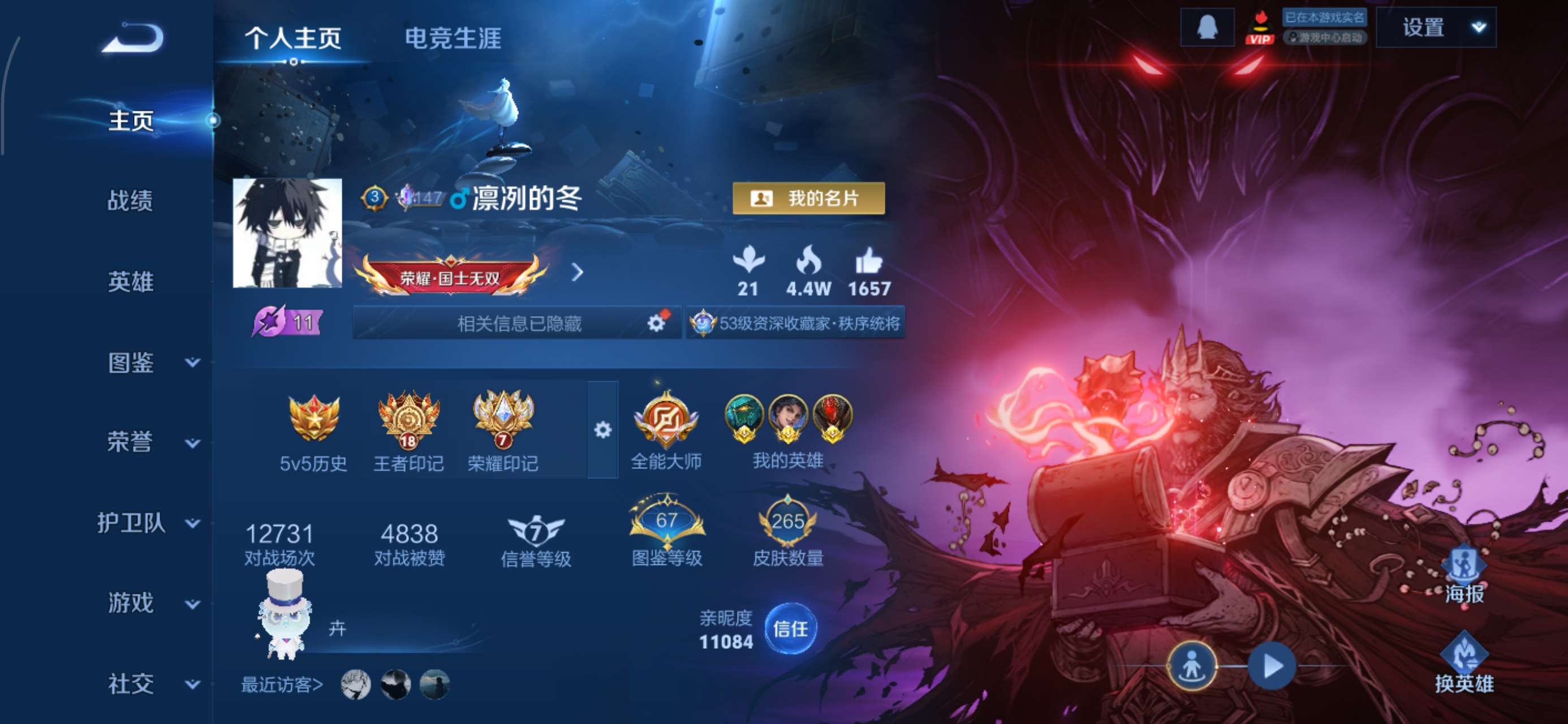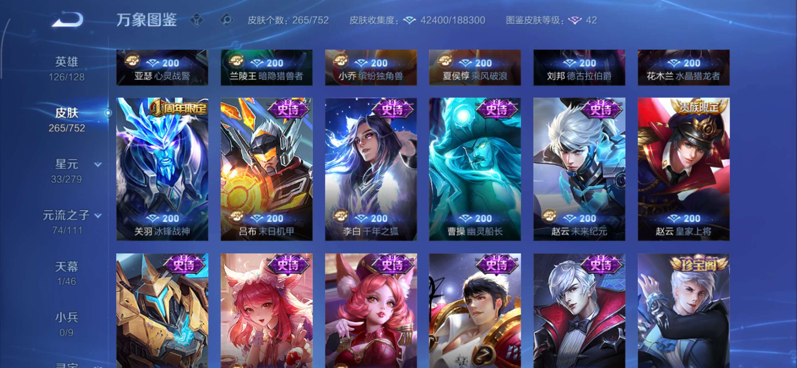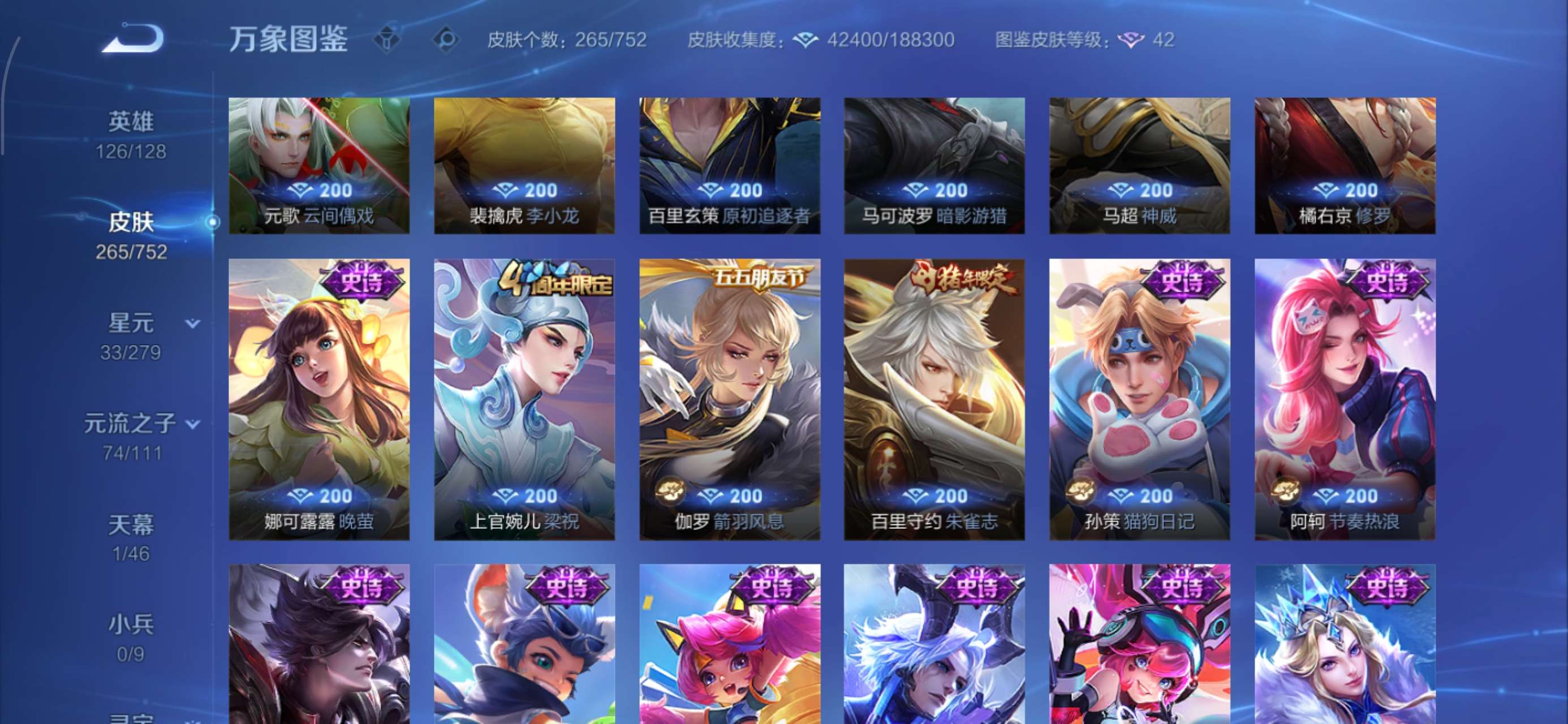 皮肤265 英雄126 荣耀王者 荣耀典藏3 无双皮肤1 珍品传说2 传说10 其他皮肤97-连体