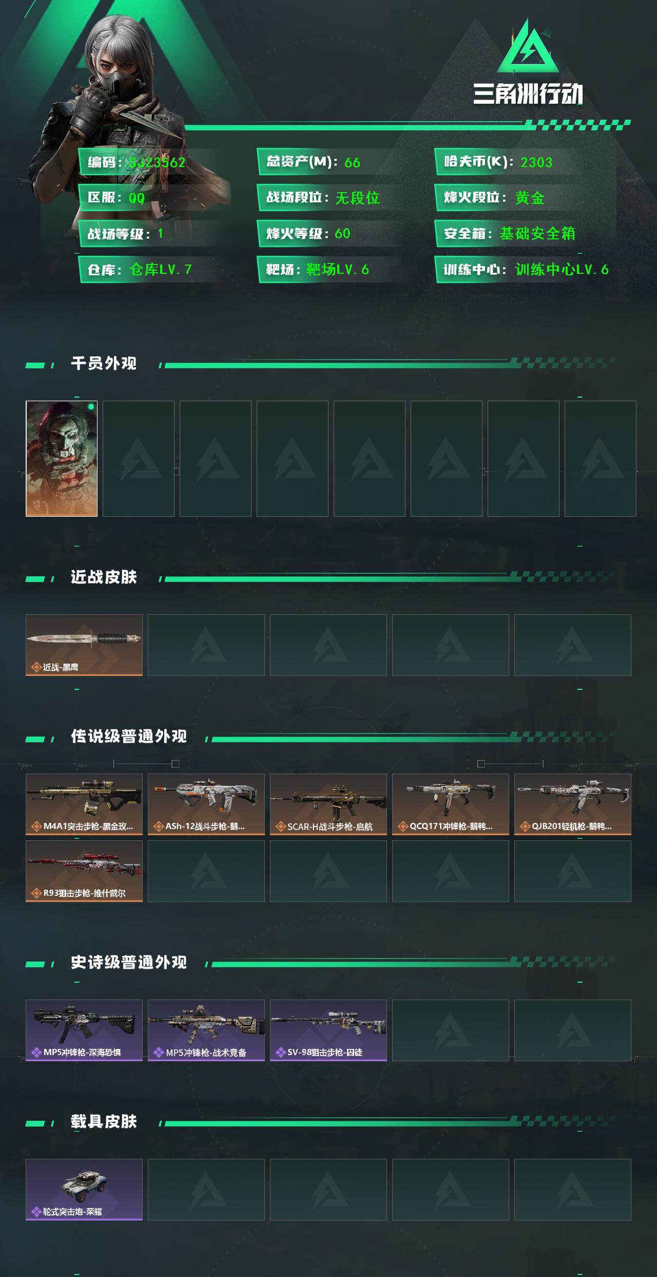 总资产(M):66M 哈夫币(K):2303K 红狼-电锯惊魂/近战-黑鹰
