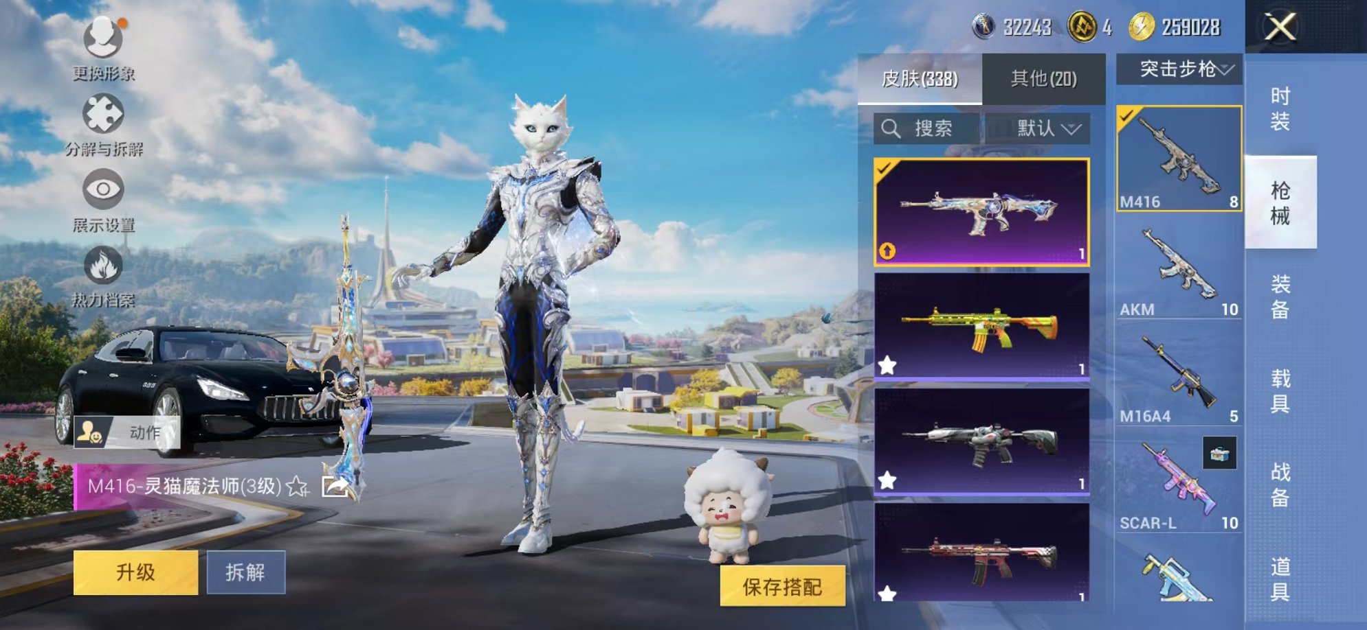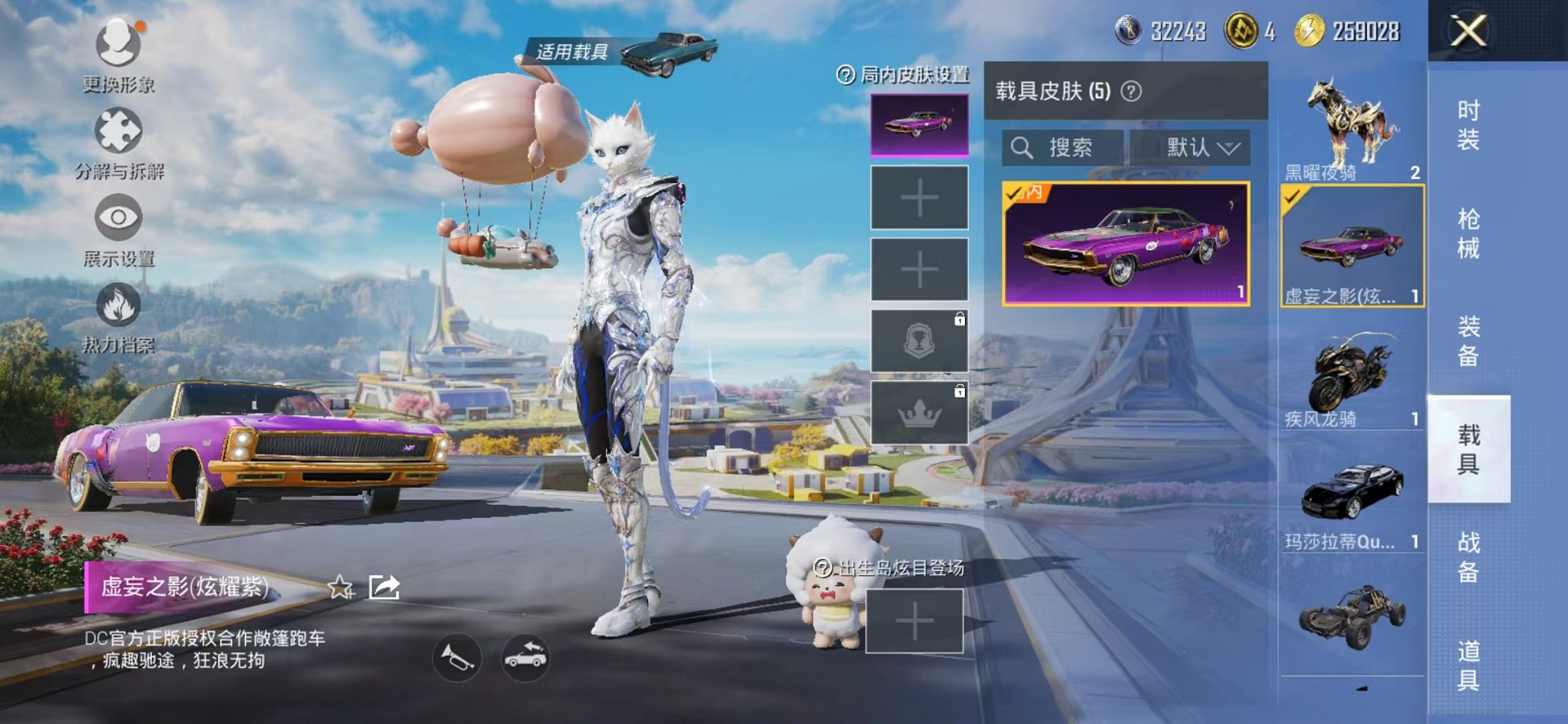 连体号4级灵猫1级欧若拉黑丝12粉装5特效枪5载具带王者311皮肤2无双1典藏25传说可秒换绑