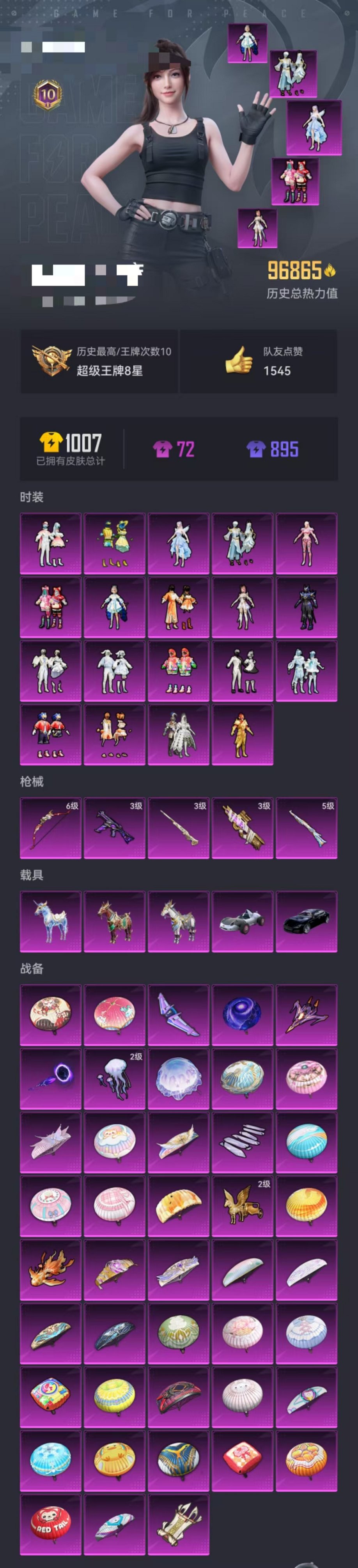 】、安卓Q区-96865热力值-10印记-201套装-239枪皮、【5载具】、玛莎拉蒂Q蓝色、灵鼠银迹、赤兔、照夜玉狮子、星梦玉骢【2稀有】、8号机、Mark.06【19粉装】、宙之时溯、圣堂之誓、萌物绒绒、炫光之旅、冰霜白皇、洛天依、香水柠檬、旋转彩虹、寒光使者、橘柚倾心、绒雪飘舞、音爆索尼克、盖世英雄、冰川幽秘、俏皮狐尾、金丰海韵、角色-星梦奇缘、祥瑞锦鲤、角色-守护天翼【5特效枪】、P90-沙丘之主(3级)、Kar98K-未来歌