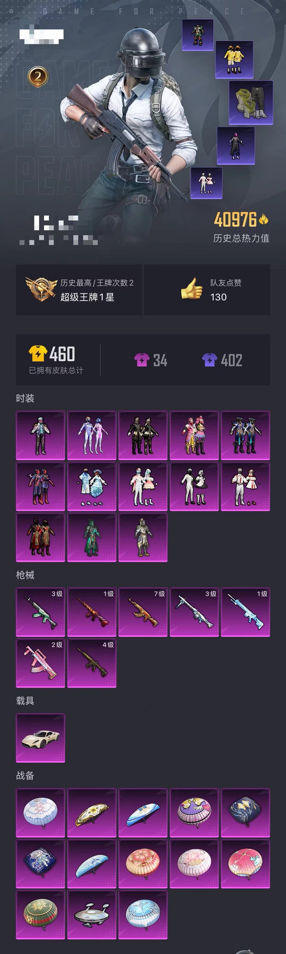 187-可二次【女号梦幻火箭猪脸13粉装7特效枪1载具可秒换绑】、苹果Q区-40976热力值-2印记-96套装-126枪皮、【1载具】、玛莎拉蒂M白色【13粉装】、缤纷油彩(猪脸妹)、套装-海螺星光、梦幻火箭、星之彼岸、冰川红玫、旋转彩虹、霓裳武神、暗夜鎏金、碧穹智者、木曜青龙、金曜白虎、彗云及圣、冰川幽秘【7特效枪】、AKM-盖世英雄(7级)、M416-五爪金龙(4级)、MK20-H-海螺星光(1级)、GROZA-旋转彩虹(2级)、M416-风花雪月(1级)、MG3-洛神天依(3级)、M762