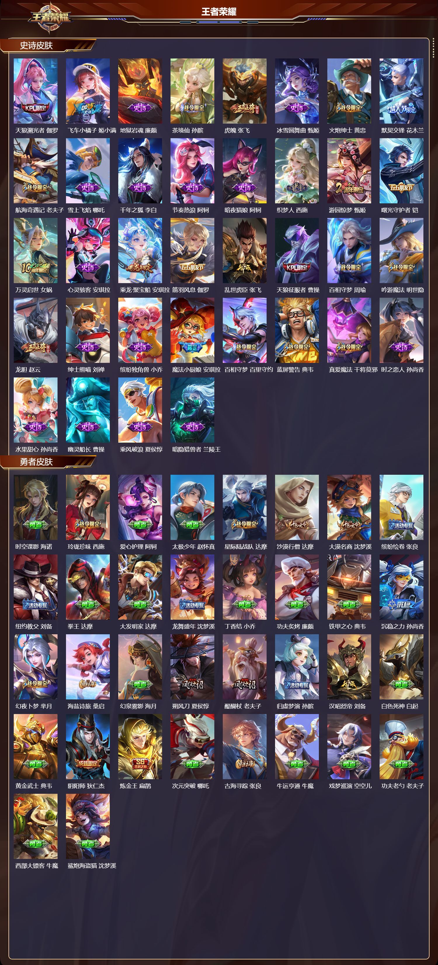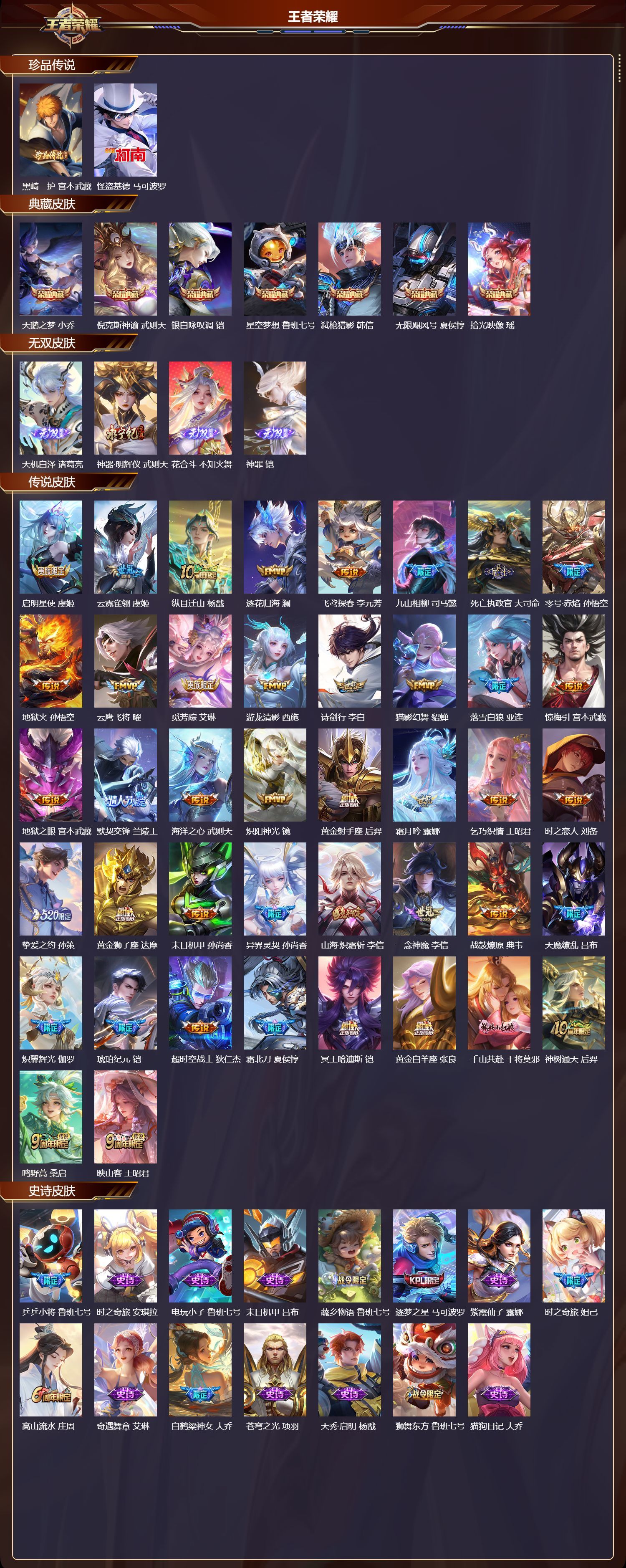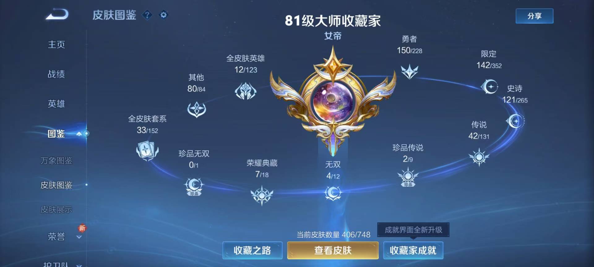 安卓QQ/绝世王者/406皮肤/128英雄/7典藏/0珍品无双/4无双/2珍品传说/42传说/121