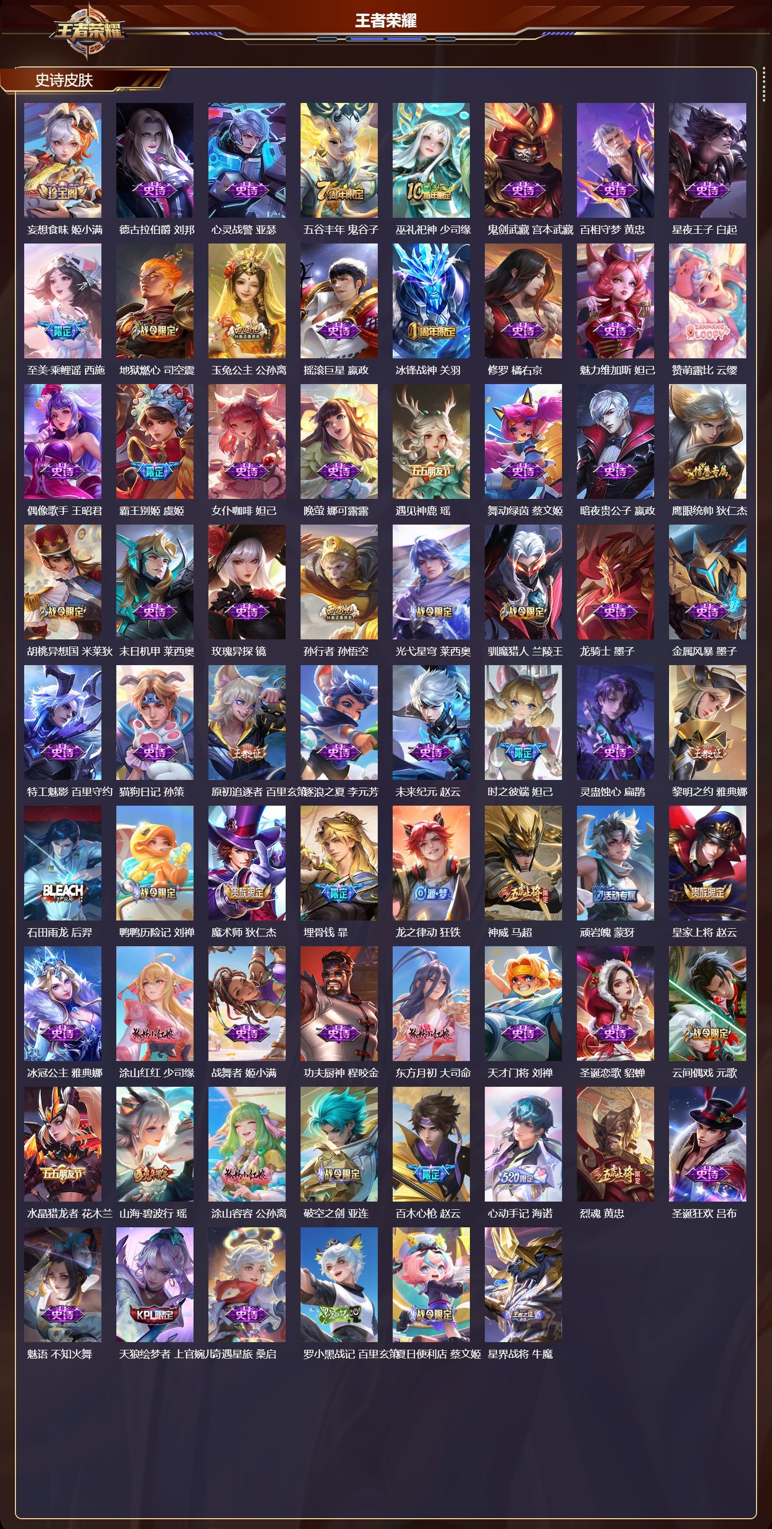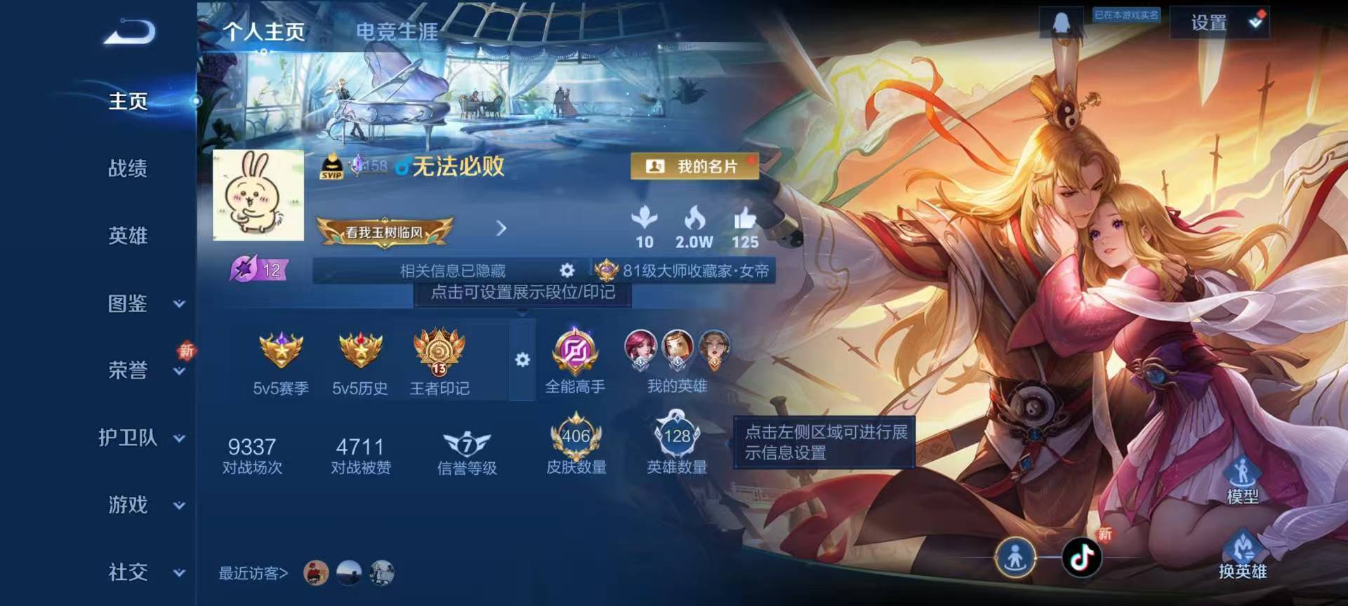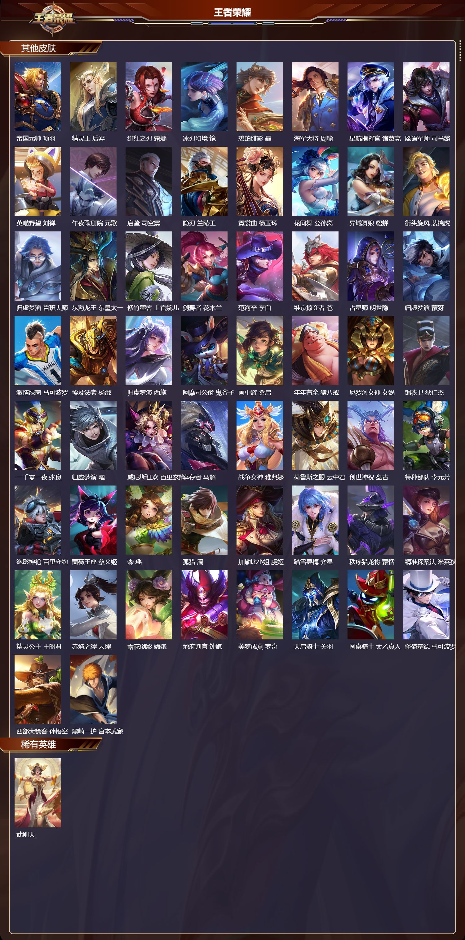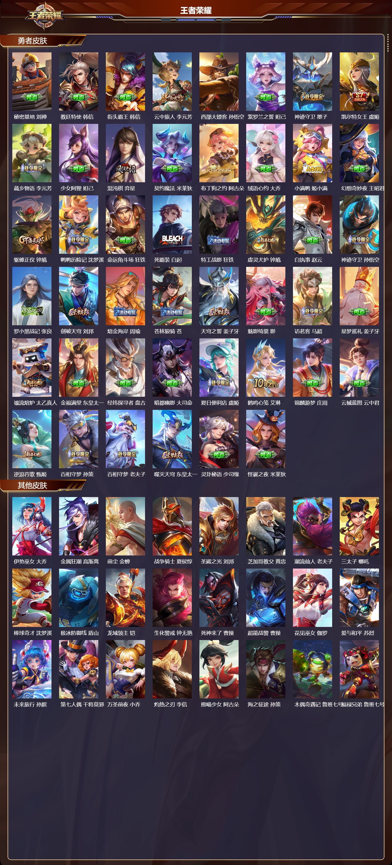 安卓QQ/绝世王者/406皮肤/128英雄/7典藏/0珍品无双/4无双/2珍品传说/42传说/121