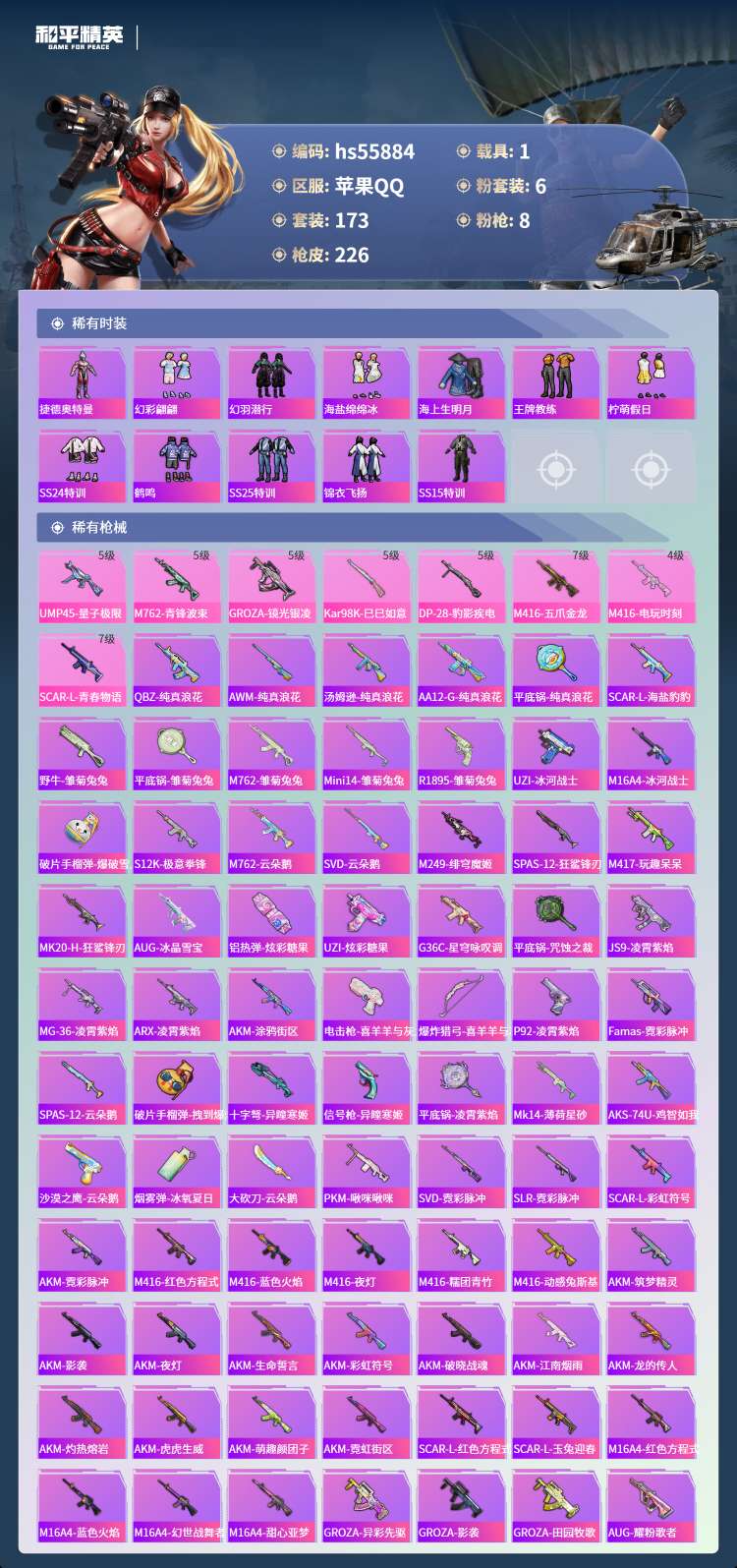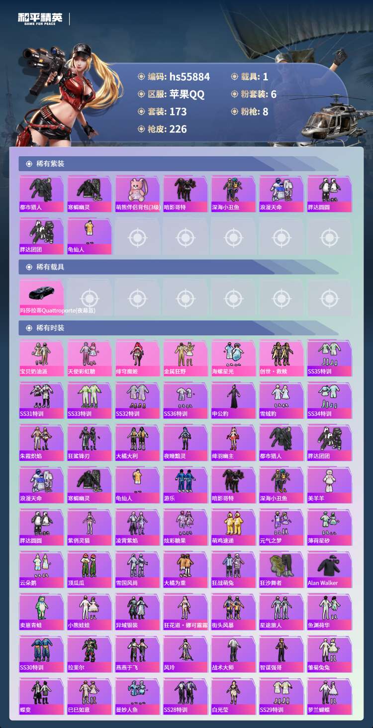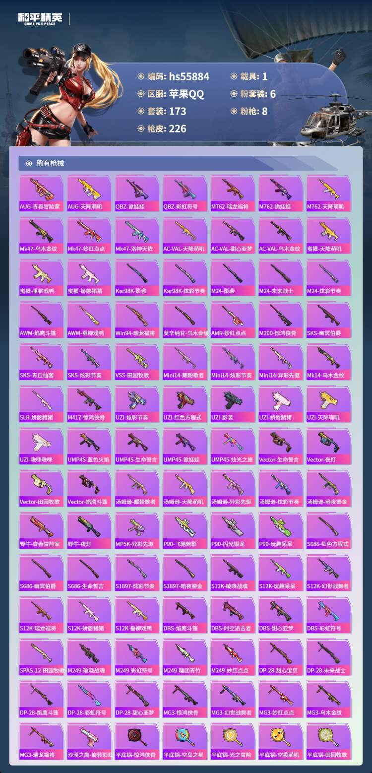 hs55884 苹果手Q-13王牌印记-6粉装-8特效枪-1载具-71421热力值-173套装-22