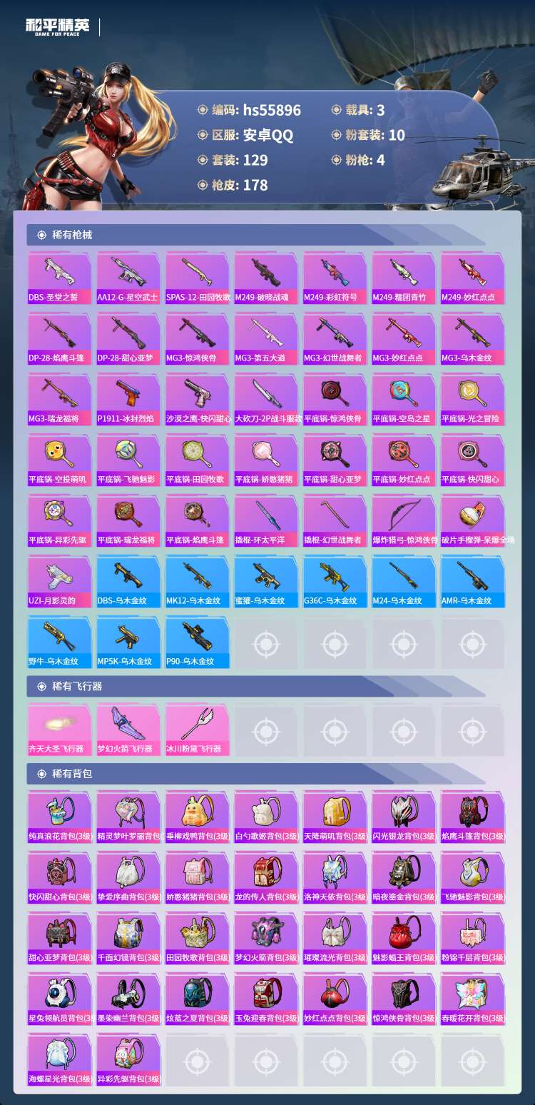 hs55896 安卓手Q-8王牌印记-10粉装-4特效枪-3载具-61804热力值-129套装-17