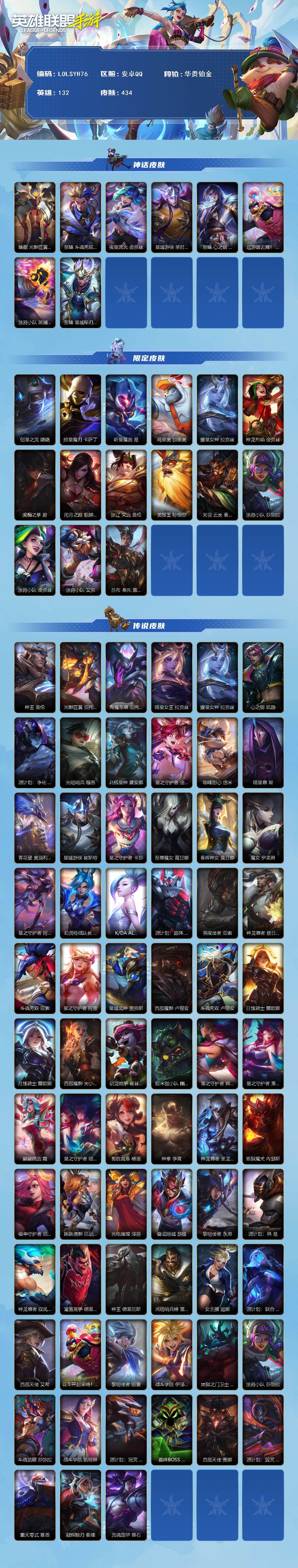 【LOLSYH76】132英雄/434皮肤/华贵铂金/臻藏 光影巨翼 亚托克斯/至臻 斗魂无双 赵信/夜星流火 金克丝/星域游侠 圣时豪杰 崔斯特/至臻 心之钢 永恩/巡游踏云霄! 墨菲特/涂鸦小队 斑斓艺术 布兰德/至臻 星域秘刃 泰隆/创星之灵 璐璐/掠星魔刃 卡萨丁/斩星魔剑 易/鸡里奥 加里奥/耀星女神 拉克丝/神龙烈焰 金克丝/虎痴之拳 蔚/闭月之颜 貂蝉 卡特琳娜/张辽 文远 盖伦/美猴王 孙悟空/关羽 云长 泰达米尔/涂鸦小队 莎弥拉/涂鸦小队 金克丝/涂鸦小队 艾克/吕布 奉先