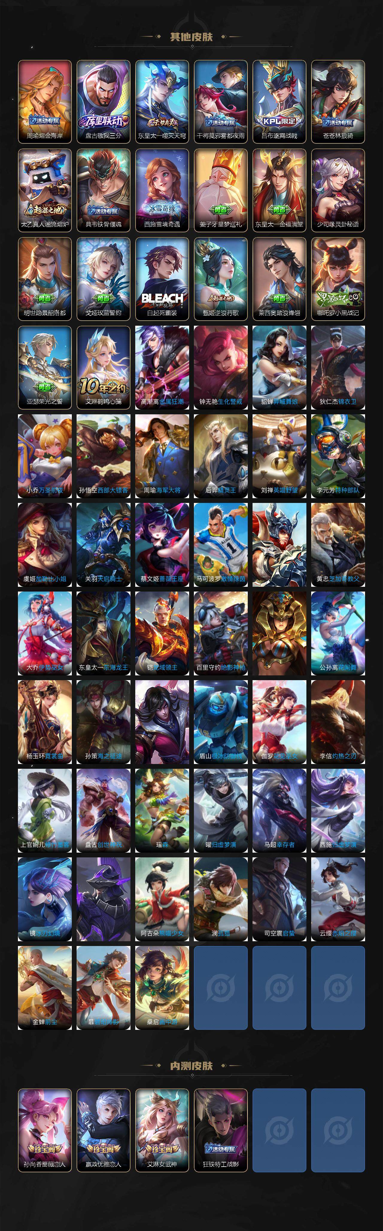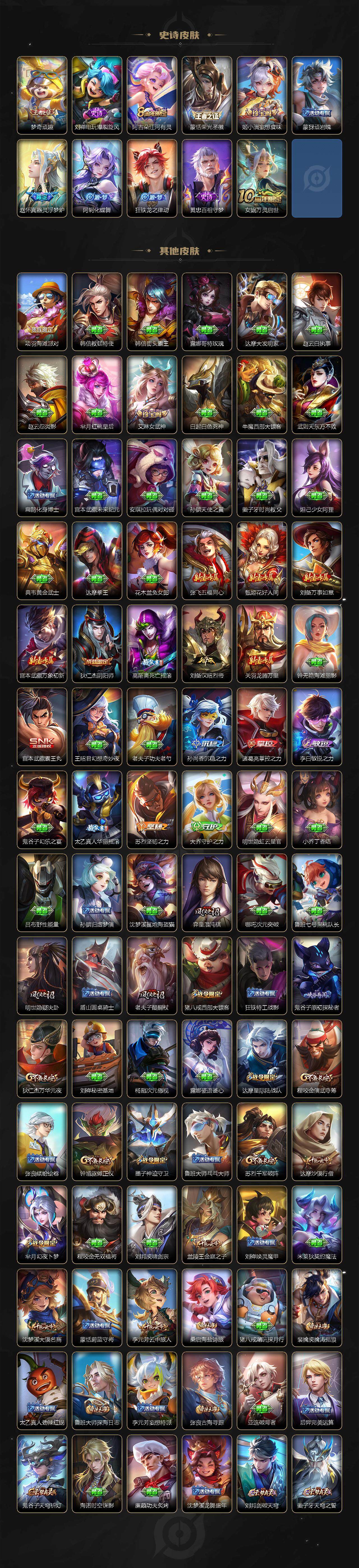 【限定皮肤】:蒙犽顽岩魄,姜子牙天穹之誓,狄仁杰阴阳师,廉颇寅虎御盾,赵云皇家上将,赵云百木心枪,墨子神迹守卫,嬴政优雅恋人,孙尚香蔷薇恋人,鲁班七号狮舞东方,鲁班七号寅虎瑞焰,庄周玄嵩,庄周高山流水,高
