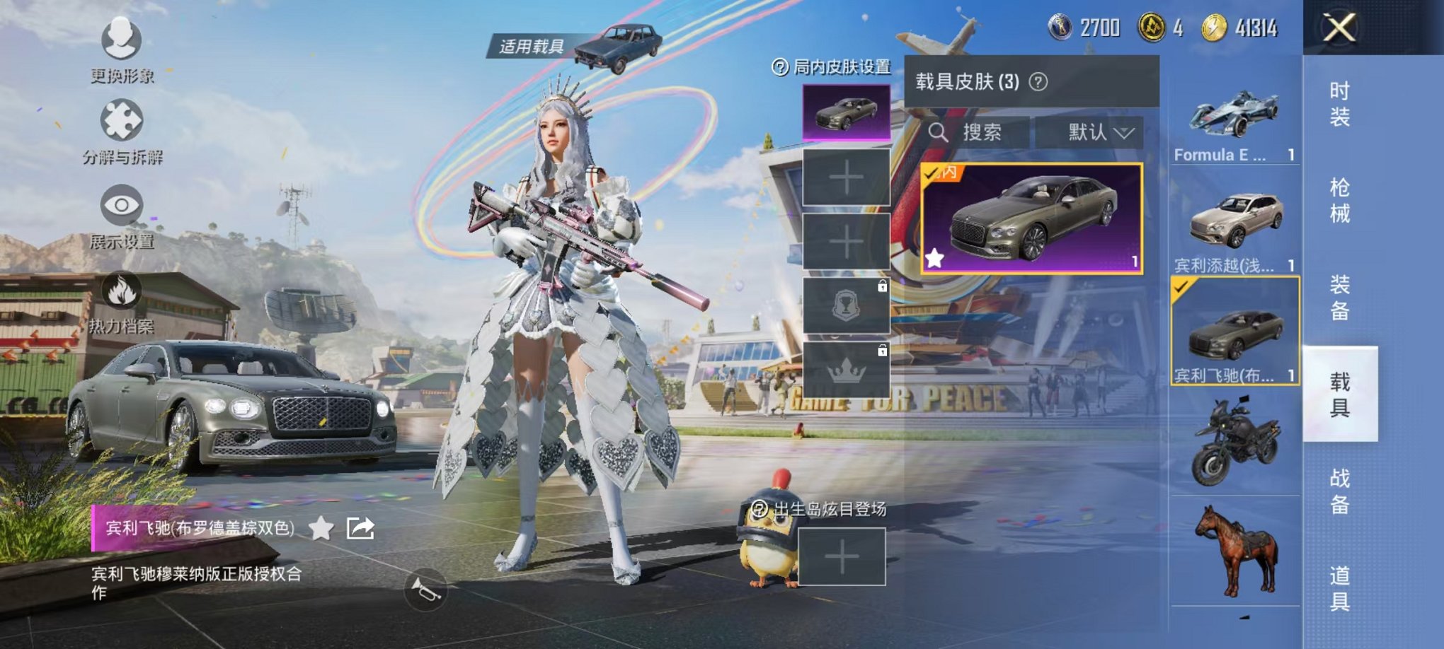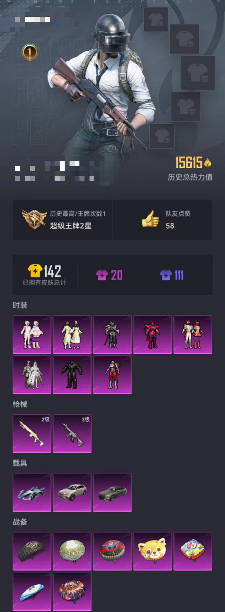 233-可二次【3载具8粉装2特效枪】、安卓Q区-15615热力值-1印记-27套装-37枪皮、【3载具】、宾利飞驰(布罗德盖棕双色)、宾利添越(浅瞪羚棕)、Formula、E、Gen2(巅峰兰)【8粉装】、闲梦青缨、猩猩队长、阿尔茜、冰霜白皇、霞光圣骑、甜梦小狐、炙焰赤龙、飓风飞鹰【2特效枪】、Mk14-闲梦青缨(2级)、M416-超新星(3级)【14热门】、M416-蓝色火焰、长空猛禽、胖达团团、暗影哥特(红眼罩)、冰川格斗者、SS25特训、NV战队服、M762-暖熊萌萌、M24-未来战士、