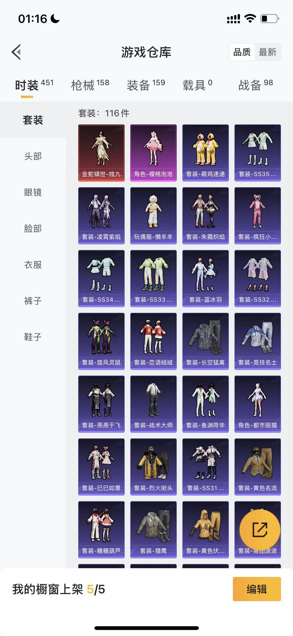239-【1红装烛九2螳螂都市1粉装6特效枪可秒换绑】、苹果Q区-44738热力值-5印记-116套装-158枪皮、【1红装】、金蛇镇世-烛九(1级)【2稀有】、8号机、Mark.06【1粉装】、角色-樱桃泡泡【6特效枪】、SCAR-L-锦绣绵绵(5级)、AKM-绿萝繁花(5级)、Kar98K-巳巳如意(5级)、DP-28-豹影疾电(5级)、AUG-暖羊咩咩(5级)、MG-36-沧焰双生(5级)【36热门】、M416-蓝色火焰、GROZA-异彩先驱、GROZA-彩虹符号、长空猛禽、异彩先驱、霓虹