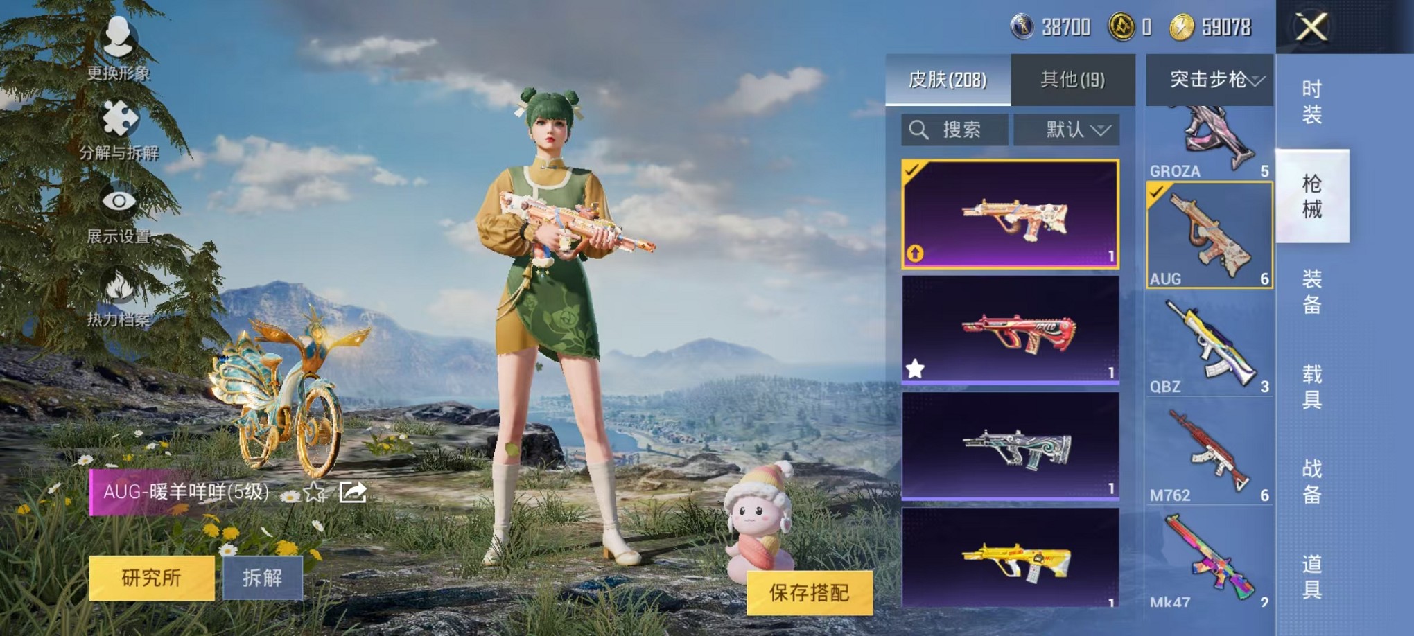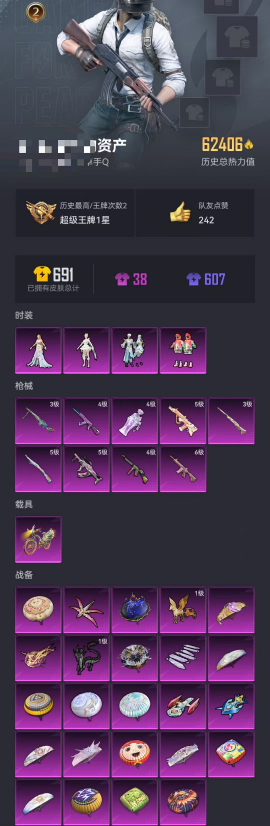 598-【心之恋语、雅典娜红眼罩、4粉装9特效枪1载具、可秒换绑】、安卓Q区-62406热力值-2印记-126套装-207枪皮、【1载具】、辉羽雀灵自行车【4粉装】、炫光之旅、金丰海韵、角色-智耀战神、角色-千金淑猫【9特效枪】、M416-心之恋语(6级)、AKM-炫紫旋律(4级)、汤姆逊-怪笑疯兔(4级)、M24-镜域双华(3级)、MG3-辉羽雀灵(3级)、GROZA-镜光银凌(5级)、Kar98K-巳巳如意(5级)、AUG-暖羊咩咩(5级)、烟雾弹-丁香清露(4级)【34热门】、M416-蓝